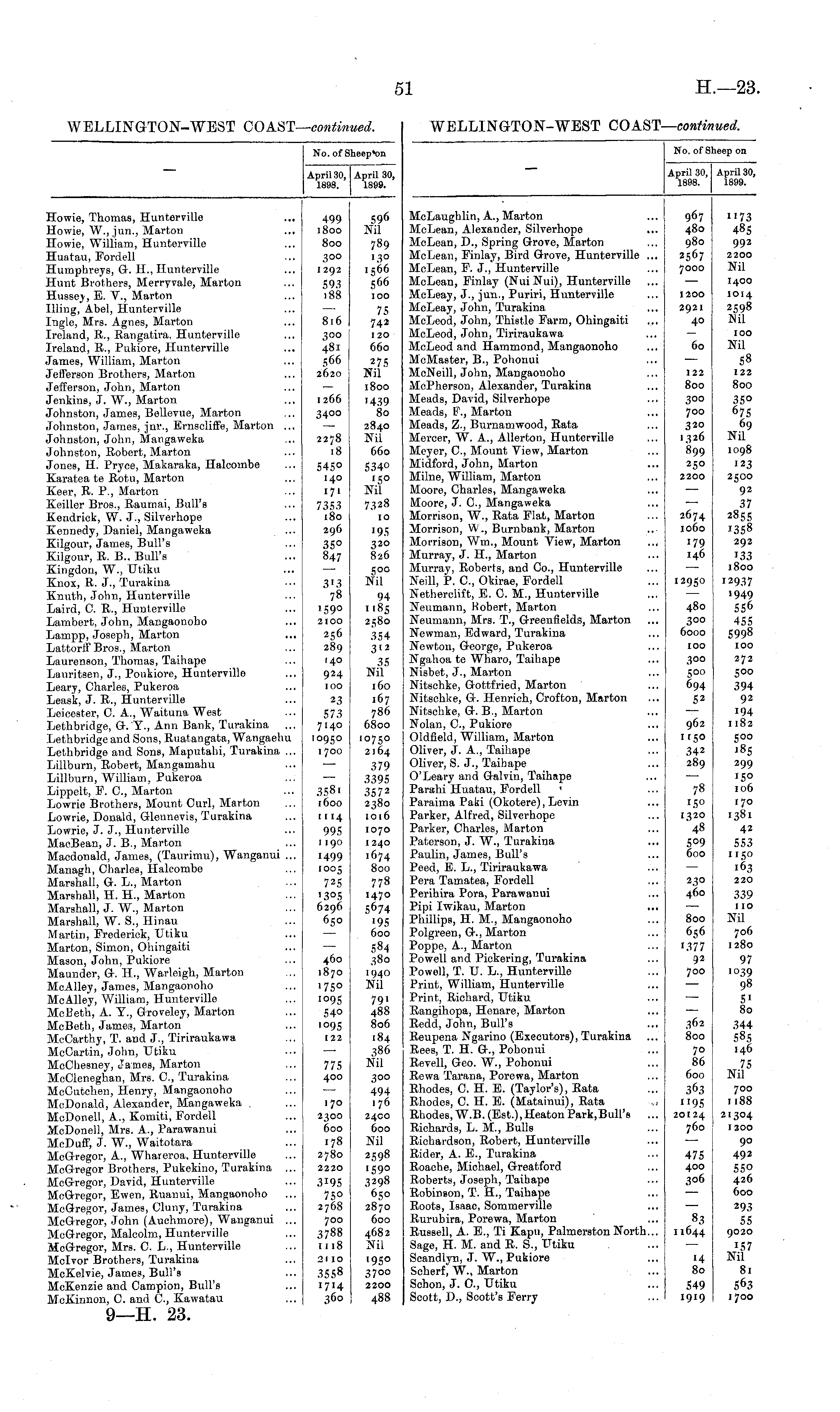 No. of Sheep on April 30, April 30, 1898. 1899. McLaughlin, A., Marton McLean, Alexander, Silverhope McLean, D., Spring Grove, Marton McLean, Finlay, Bird Grove, Hunterville ... McLean, F. J., Hunterville McLean, Finlay (NuiNui), Hunterville McLeay, J., jun., Puriri, Hunterville McLeay, John, Turakina McLeod, John, Thistle Farm, Ohingaiti McLeod, John, Tiriraukawa MeLeod and Hammond, Mangaonoho McMaeter, B., Polionui McNeill, John, Mangaonoho McPherson, Alexander, Turakina Meads, David, Silverhope Meads, t\, Marton Meads, Z., Burnamwood, Rata Mercer, W. A., Allerton, Huntervilie Meyer, C, Mount View, Marton Midford, John, Marton Milne, William, Marton Moore, Charles, Mangaweka Moore, J. C, Mangaweka Morrison, W., Rata Flat, Marton Morrison, W., Burnbank, Marton Morrison, Wm., Mount View, Marton Murray, J. H., Marton Murray, Roberts, and Co., Hunterville Neill, P. C, Okirae, Fordell Netherclift, B. C. M., Hunterville Neumann, Robert, Marton Neumann, Mrs. T., Greenfields, Marton Newman, Edward, Turakina Newton, George, Pukeroa Ngahoa te Wharo, Taihape Nisbet, J., Marton Nitschke, Gottfried, Marton Nitschke, G. Henrich, Crofton, Marton Nitschke, G. B., Marton Nolan, C, Pukiore Oldfield, William, Marton Oliver, J. A., Taihape Oliver, S. J., Taihape O'Leary and Galvin, Taihape Parahi Huatau, Fordell Paraima Paki (Okotere), Levin Parker, Alfred, Silverhope Parker, Charles, Marton Paterson, J. W., Turakina Paulin, James, Bull's Peed, E. L., Tiriraukawa Pera Tamatea, Fordell Perihira Pora, Parawanui Pipi Iwikau, Marton Phillips, H. M., Mangaonoho Polgreen, G., Marton Poppe, A., Marton Powell and Pickering, Turakina Powell, T. TJ. L., Hunterville Print, William, Hunterville Print, Richard, Utiku Rangihopa, Henare, Marton Redd, John, Bull's Reupena Ngarino (Executors), Turakina ... Rees, T. H. G., Pohonui Revell, Geo. W., Pohonui Rewa Tarana, Porewa, Marton Rhodes, C. H. E. (Taylor's), Rata Rhodes, C. H. E. (Matainui), Rata Rhodes, W.B.(Bst.),HeatonPark,Bull's ... Richards, L. M., Bulls Richardson, Robert, Hunterville Rider, A. E., Turakina Roache, Michael, Greatford Roberts, Joseph, Taihape Robinson, T. H., Taihape Roots, Isaac, Sommerville Rurubira, Porewa, Marton Russell, A. E., Ti Kapu, Palmerston North... Sage, H. M. and R. S., Utiku Scandlyn, J. W., Pukiore Scherf, W., Marton Schon, J. O., "Utiku Scott, D., Scott's Ferry 967 480 980 25 6 7 7000 I2OO 2921 40 60 122 800 300 7OO 320 I 326 899 25° 2200 2674 1060 179 146 12950 480 300 6000 100 300 500 694 52 962 1150 342 289 i>73 48 s 992 2200 Nil 1400 1014 2598 Nil 100 Nil 58 122 800 35° 675 69 Nil 1098 123 2500 92 37 285S 1358 292 133 1800 12937 1949 556 455 5998 100 272 500 394 92 194 1182 500 •8 S 299 '5° 106 170 1381 78 '5 0 1320 ■48 5°9 600 230 460 800 656 '377 92 700 42 553 1150 163 220 339 no Nil 706 1280 97 1039 98 5 1 80 362 800 70 86 600 363 "95 20124 760 344 585 146 Nil 700 1188 21304 1200 475 400 306 90 492 550 426 600 83 11644 14 80 549 1919 293 55 9020 157 Nil 81 563 1700