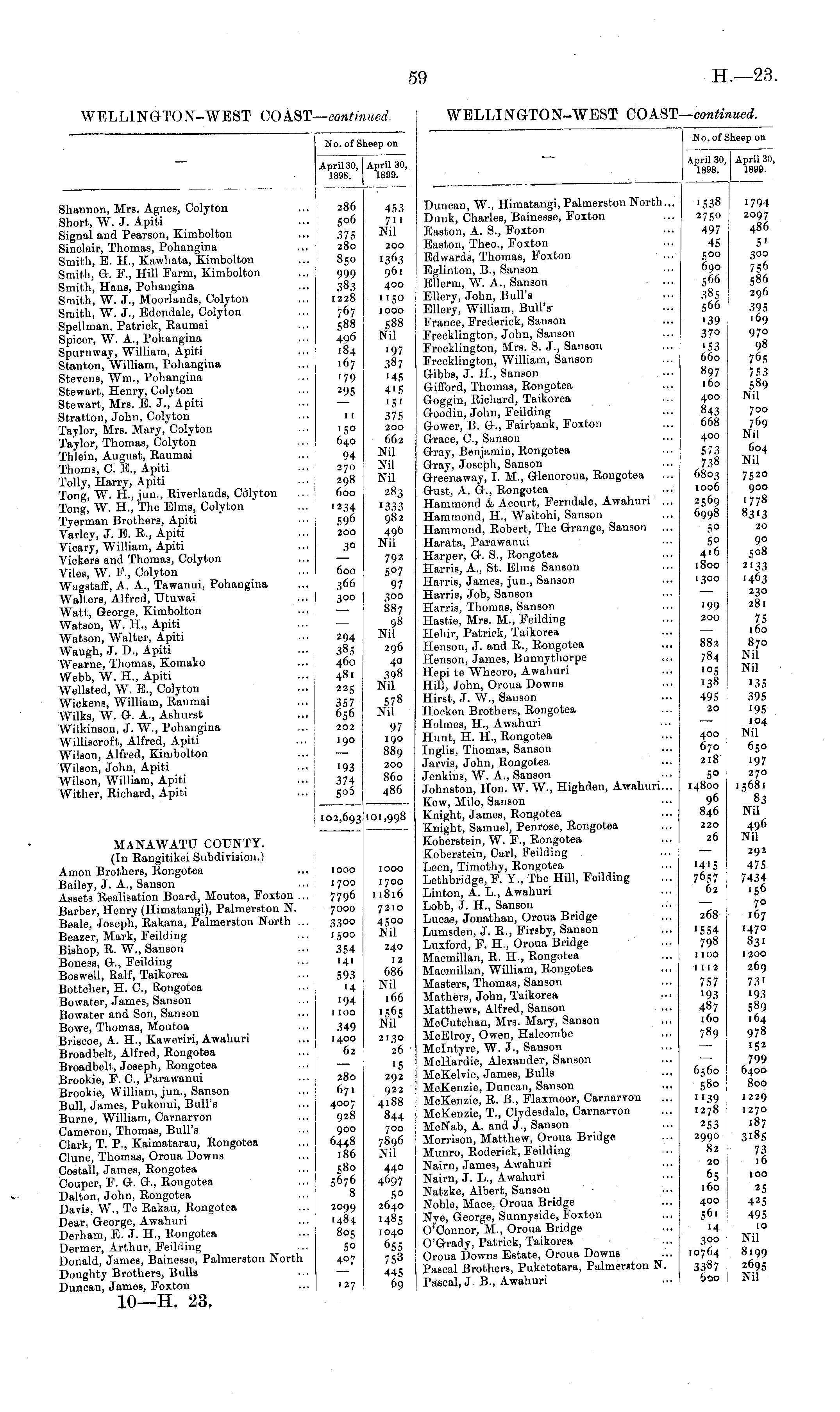 No. of Sheep on April 3( 1898. I, April 30, 1899. Duncan, "W-, Himatangi, Palmerston North... Dunk, Charles, Bainesse, Foxton Baston, A. S., Foxton Easton, Theo., Poxton Edwards, Thomae, Foxton Bglinton, B., Sanson Ellerm, W. A., Sanson Ellery, John, Bull's Ellery, William, Bull'sFrance, Frederick, Sanson Frecklington, John, Sanson Frecklington, Mrs. S. J., Sanson Freeklington, William, Sanson G-ibhs, J. H., Sanson Gifford, Thomas, Rongotea G-oggin, Richard, Taikorea Goodin, John, Feilding Gower, B. G-., Fairbank, Foxton Grace, C, Sanson Gray, Benjamin, Rongotea Gray, Joseph, Sanson Greenaway, I. M., Glenoroua, Rongotea Gust, A. G., Rongotea _ ... Hammond & Acourt, Ferndale, Awahuri ... Hammond, H., Waitohi, Sanson Hammond, Robert, The Grange, Sanson ... Harata, Parawanui Harper, Q-. S., Rongotea Harris, A., St. Elms Sanson Harris, James, jun., Sanson Harris, Job, Sanson Harris, Thomas, Sanson Has tie, Mrs. M., Feilding Hehir, Patrick, Taikorea Henson, J. and R., Rongotea Henson, James, Bunnythorpe Hepi te Wheoro, Awahuri Hill, John, Oroua Downs Hirst, J. W., Sanson Hocken Brothers, Rongotea Holmes, H., Awahuri Hunt, H. H., Rongotea Inglis, Thomas, Sanson Jarvis, John, Rongotea Jenkins, W. A., Sanson Johnston, Hon. W. W., Highden, Awahuri... Kew, Milo, Sanson Knight, James, Rongotea Knight, Samuel, Penrose, Rongotea Koberstein, W. F., Rongotea Koberstein, Carl, Feilding Leen, Timothy, Rongotea Lethbridge, F. Y., The Hill, Feilding Linton, A. L., Awahuri Lohb, J. H., Sanson Lucas, Jonathan, Oroua Bridge Lumsden, J. R., Firsby, Sanson Luxford, F. H., Oroua Bridge Macmillan, R. H., Rongotea Macmillan, William, Rongotea Masters, Thomas, Sanson Mathers, John, Taikorea Matthews, Alfred, Sanson ... McCutchan, Mrs. Mary, Sanson ... McElroy, Owen, Halcombe Mclntyre, W. J., Sanson McHardie, Alexander, Sanson McKelvie, James, Bulls McKenzie, Duncan, Sanson McKenzie, R. B., Flaxmoor, Carnarvon McKenzie, T., Clydesdale, CarnarTon McNab, A. and J., Saneon Morrison, Matthew, Oroua Bridge Munro, Roderick, Feilding Nairn, James, Awahuri Nairn, J. L., Awahuri Natzke, Albert, Saneon Noble, Mace, Oroua Bridge Nye, George, Sunnyside, Foxton O'Connor, M., Oroua Bridge O'Grady, Patrick, Taikorea Oroua Downs Estate, Oroua Downs Pascal Brothers, Puketotara, Palmerston N. Pascal, J B., Awahuri ■538 2750 497 45 5°° 690 566 385 566 139 370 ■53 660 897 160 17Q4 2097 486 5' 300 756 586 296 395 169 970 98 765 753 589 Nil 400 843 668 700 769 Nil 604 Nil 7520 900 1778 8313 20 400 573 738 6803 1006 2569 6998 5° 5° 416 1800 1300 199 200 90 508 2'33 '463 230 281 75 160 870 Nil Nil 883 784 I0 5 ■38 495 20 400 670 218 5° 14800 96 846 220 26 '35 395 '95 104 Nil 650 '97 270 15681 83 Nil 496 Nil '4'5 7657 62 268 '554 798 1100 1112 757 ■93 487 160 789 292 475 7434 ■56 70 167 1470 S3" 1200 269 73' 193 589 164 978 ■52 799 6400 800 1229 1270 .87 3185 73 16 6.560 580 "39 1278 253 2990 82 20 65 160 400 56. M 300 10764 3387 6 so 100 25 425 495 10 I Nil I 8199 2695 Nil