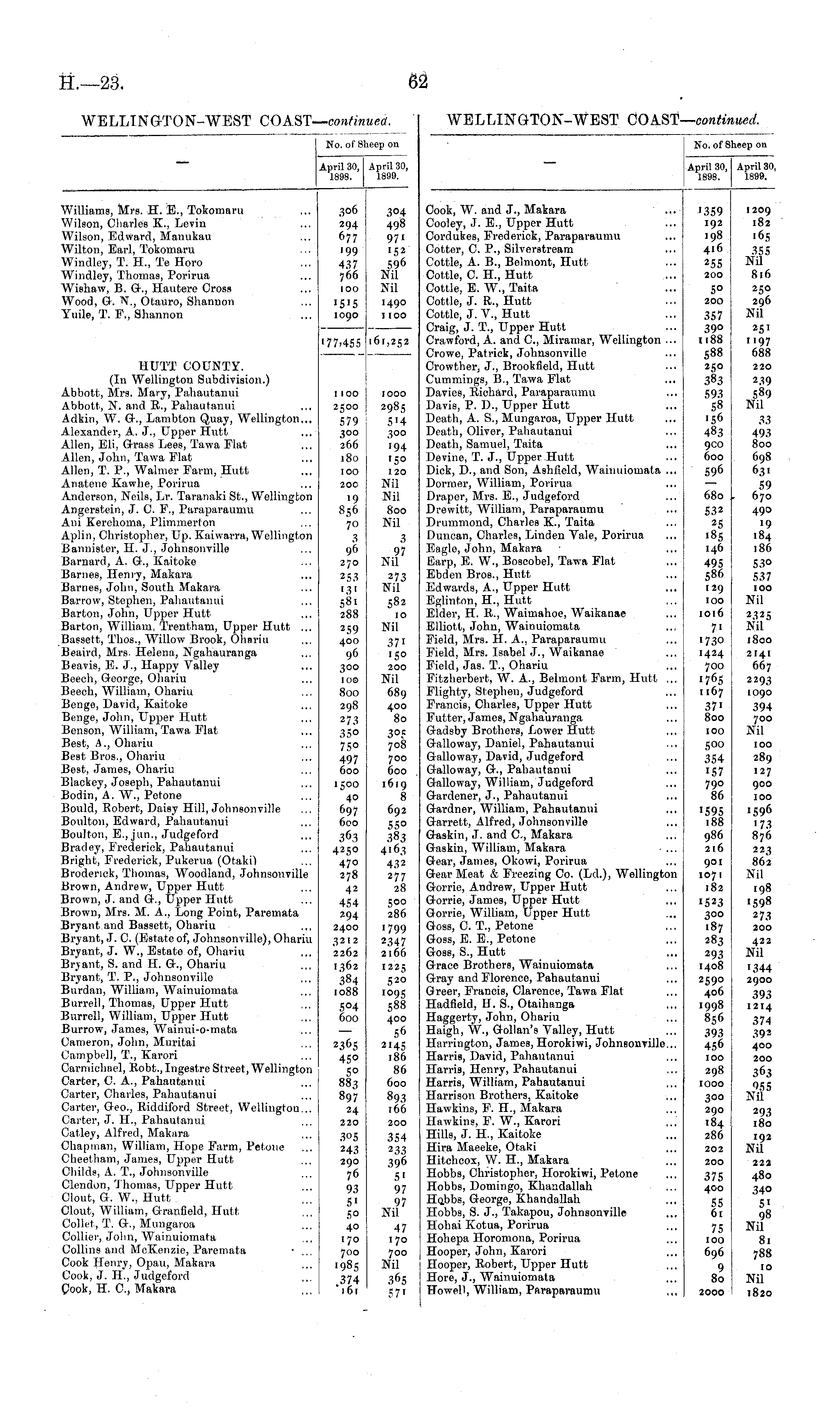 No. of Sheep on April 30, April 30, 1898. 1899. Cook, W. and J., Makara Cooley, J. E., Upper Hutt Cordukes, Frederick, Paraparaumu Cotter, C. P., Silveretream Cottle, A. B., Belmont, Hutt Cottle, C. H., Hutt Cottle, E. W., Taita Cottle, J. R., Hutt Cottle, J. V., Hutt Craig, J. T., Upper Hutt Crawford, A. and C, Miramar, Wellington ... Crowe, Patrick, Johnsonville Crowther, J., Brookfield, Hutt Cummings, B., Tawa Mat Davies, Richard, Paraparaumu Davis, P. D., Upper Hutt Death, A. S., Mungaroa, Upper Hutt Death, Oliver, Pahautanui Death, Samuel, Taita Devine, T. J., Upper Hutt Dick, D., and Son, Ashfield, Wainuioinata ... Dormer, William, Porirua Draper, Mrs. B., Judgeford Drewitt, William, Paraparaumu Drummond, Charles K., Taita Duncan, Charles, Linden Vale, Porirua Eagle, John, Makara Earp, E. W., Boscobel, Tawa Flat Ebden Bros., Hutt Edwards, A., Upper Hutt Eglinton, H., Hutt Elder, H. R., Waimahoe, Waikanae Elliott, John, Wainuioinata Field, Mrs. H. A., Paraparaumu Field, Mrs. Isabel J., Waikanae Field, Jas. T., Ohariu Fitzherbert, W. A., Belmont Farm, Hutt ... Flighty, Stephen, Judgeford Francis, Charles, Upper Hutt Futter, James, Ngahauranga Gadsby Brothers, Lower Hutt Galloway, Daniel, Pahautanui Galloway, David, Judgeford Galloway, G., Pahautanui Galloway, William, Judgeford Gardener, J., Pahautanui Gardner, William, Pahautanui Garrett, Alfred, Johnsonville Gaskin, J. and C, Makara Gaskin, William, Makara Gear, James, Okowi, Porirua Gear Meat & Freezing Co. (Ld.), Wellington Gorrie, Andrew, Upper Hutt Gorrie, James, Upper Hutt Gorrie, William, Upper Hutt Goss, C. T., Petone Goss, E. E., Petone Goss, S., Hutt Grace Brothers, Wainuiomata Gray and Florence, Pahautanui Greer, Francis, Clarence, Tawa Flat Hadfleld, H. S., Otaihanga Haggerty, John, Ohariu Haigh, W., Gollan's Valley, Hutt Harrington, James, Horokiwi, Johnsonville... Harris, David, Pahautanui Harris, Henry, Pahautanui Harris, William, Pahautanui Harrison Brothers, Kaitoke Hawkins, F. H., Makara Hawkins, F. W., Karori Hills, J. H., Kaitoke Hira Maeeke, Otaki Hitchcox, W. H., Makara Hobbs, Christopher, Horokiwi, Petone Hobbs, Domingo, Khandallah Hobbs, George, Khandallah Hobbs, S. J., Takapou, Johnsonyille Hohai Kotua, Porirua Hohepa Horomona, Porirua Hooper, John, Karori Hooper, Robert, Upper Hutt Hore, J., Wainuiomata Howell, William, Paraparaumu >359 193 198 416 2 55 200 5° 200 357 39° 1188 588 250 383 593 58 ■56 483 900 600 59 6 680 532 2 5 •85 146 495 586 129 100 1016 7' 1730 1424 700 1765 1167 37' 800 100 500 354 iS7 79° 86 1209 182 16s 355 Nil 816 250 296 Nil 25 1 1197 688 220 239 589 Nil 493 800 698 631 59 670 490 '9 184 186 53° 537 100 Nil 2325 Nil 1800 2141 667 2293 1090 394 700 Nil 100 289 127 900 100 1596 '73 876 223 862 Nil 198 '598 273 200 1595 188 986 216 901 1071 182 1523 300 187 283 293 1408 2590 406 1998 856 393 4s6 100 298 1000 422 Nil 1344 2900 393 1214 374 392 400 200 363 955 Nil 293 180 192 Nil 300 290 184 286 202 200 375 400 55 61 75 100 696 9 80 2000 222 480 340 5 1 98 Nil 81 788 10 Nil 1820