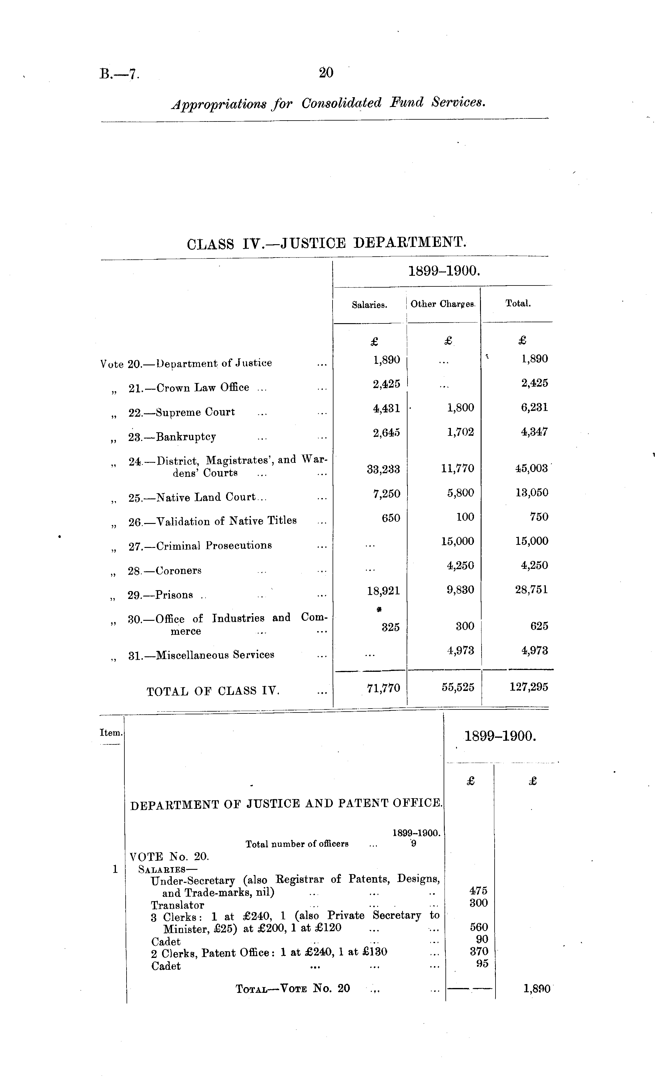 1899-1900. Salaries. Other Charges. Total. Vote 20. —Department of Justice £ £ £ 1,890 v 1,890 „ 21. —Crown Law Office ... 2,425 2,425 „ 22.—Supreme Court 4,431 1,800 6,231 „ 23. —Bankruptcy 2,645 1,702 4,347 24. —District, Magistrates', and Wardens' Courts 33,233 11,770 45,003 ,, 25. —Native Land Court... 7,250 5,800 13,050 (| 26.—Validation of Native Titles 650 100 750 „ 27. —Criminal Prosecutions 15,000 15,000 ,, 28—Coroners 4,250 4,250 ,, 29. —Prisons .. 18,921 9,830 28,751 (i 30. —Office of Industries and Com- • 300 625 merce 325 „ 31.—Miscellaneous Services 4,973 4,973 TOTAL OF CLASS IV. 71,770 5,525 127,295 [tern. 189 1-1900. £ £ DEPABTMENT OF JUSTICE AND PATENT OFFICE. 1899-1900. Total number of officers ... 9 VOTE No. 20. Salaries — Under-Secretary (also Eegistrar of Patents, Designs, and Trade-marks, nil) Translator 3 Clerks: 1 at £240, 1 (also Private Secretary to Minister, £25) at £200, 1 at £120 Cadet 2 Clerks, Patent Office: 1 at £240, 1 at £130 Cadet 475 300 560 90 370 95 Total—Vote No. 20 l,89i