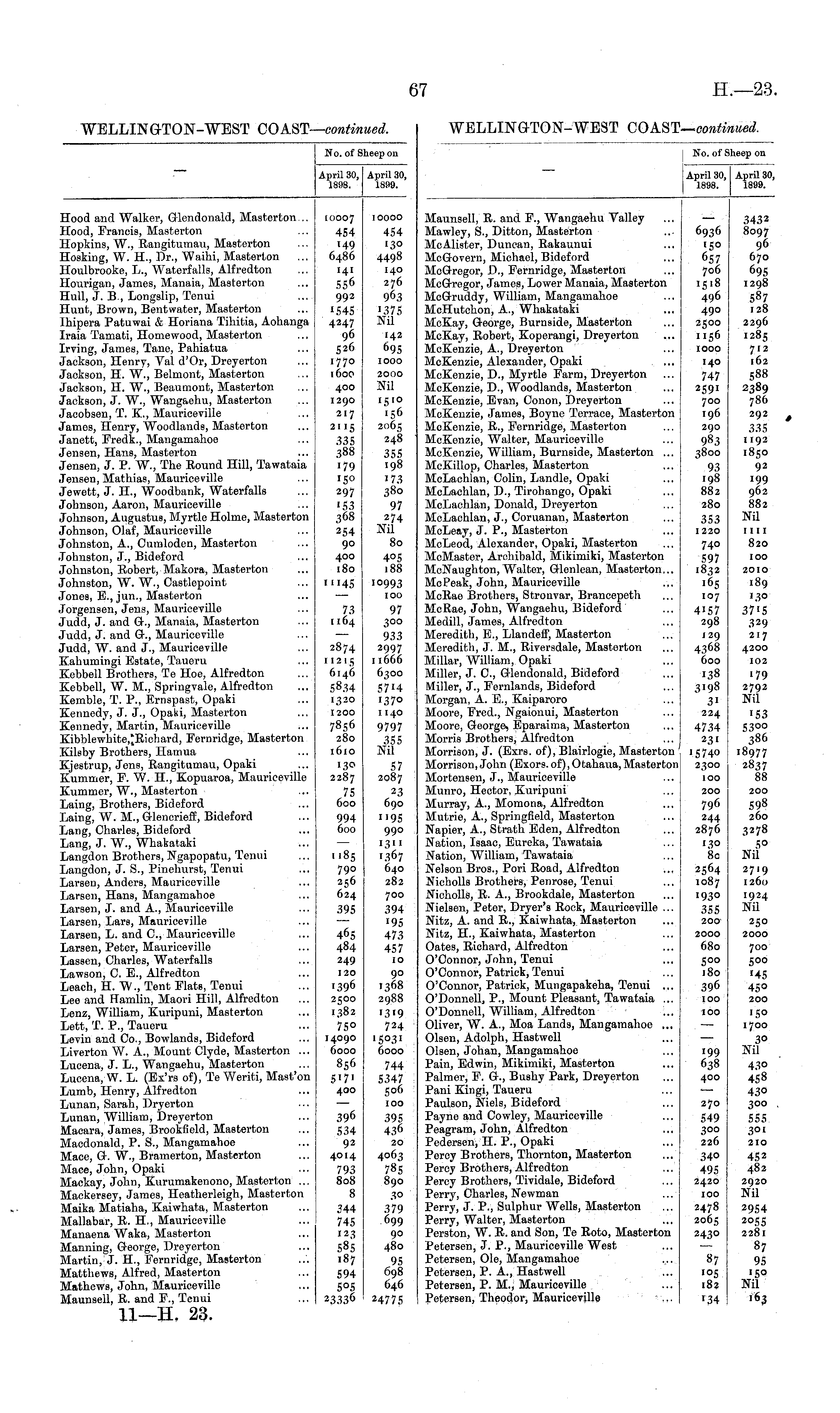 No. of Sheep on April 30, 1898. April 30, 1899. Hood and Walker, Grlendonald, Masterton... Hood, Francis, Masterton Hopkins, W., Rangitumau, Maeterton Hosking, W. H., Dr., Waihi, Masterton Houlbrooke, L., Waterfalls, Alfredton Hourigan, James, Manaia, Masterton Hull, J. B., Longslip, Tenui Hunt, Brown, Bentwater, Masterton Ihipera Patuwai & Horiana Tihitia, Aohanga Iraia Tarnati, Homewood, Masterton Irving, James, Tane, Pahiatua Jackson, Henry, Val d'Or, Dreyerton Jackeon, H. W., Belmont, Masterton Jackson, H. W., Beaumont, Masterton Jackson, J. W., Wang&ehu, Masterton Jacobsen, T. K., Mauriceville James, Henry, Woodlands, Masterton Janett, Fredk., Mangamahoe Jensen, Hans, Masterton Jensen, J. P. W., The Bound Hill, Tawataia Jensen, Mathiae, Maurieeville Jewett, J. H., Woodbank, Waterfalls Johnson, Aaron, Maurieeville Johnson, Auguetue, Myrtle Holme, Masterton Johnson, Olaf, Maurieeville Johnston, A., Oumloden, Masterton Johnston, J., Bideford Johnston, Robert, Makora, Masterton Johnston, W. W., Castlepoint Jones, E., jun., Masterton Jorgensen, Jens, Maurieeville Judd, J. and G-., Manaia, Masterton Judd, J. and G\, Maurieeville Judd, W. and J., Maurieeville Kahumingi Estate, Taueru Kebbell Brothers, Tβ Hoe, Alfredton Kebbell, W. M., Springvale, Alfredton Kemble, T. P., Ernspast, Opaki Kennedy, J. J., Opaki, Masterton Kennedy, Martin, Maurieeville Kibblewbite,;Richard, Fernridge, Masterton Kilsby Brothers, Hamua Kjestrup, Jens, Rangitumau, Opaki Kummer, F. W. H., Kopuaroa, Maurieeville Kummer, W., Masterton Laing, Brothers, Bideford Laing, W. M., G-lencrieff, Bideford Lang, Charles, Bideford Lang, J. W., Whakataki Langdon Brothers, Ngapopatu, Tenui Langdon, J. S., Pinehurst, Tenui Larsen, Anders, Maurieeville Larsen, Hans, Mangamahoe Larsen, J. and A., Maurieeville Larsen, Lars, Maurieeville Larsen, L. and C, Maurieeville Larsen, Peter, Maurieeville Lassen, Charles, Waterfalls Lawson, C. B., Alfredton Leach, H. W., Tent Flats, Tenui Lee and Hamlin, Maori Hill, Alfredton Lenz, William, Kuripuni, Masterton Lett, T. P., Taueru Levin and Co., Bowlands, Bideford Liverton W. A., Mount Clyde, Masterton ... Lucena, J. L., Wangaehu, Masterton Lucena, W. L. (Ex'rs of), Te Weriti, Mast'on Lumb, Henry, Alfredton Lunan, Sarah, Dryerton Lunan, William, Dreyerton Macara, James, Brookfield, Masterton Macdonald, P. S., Mangamahoe Mace, Q-. W., Bramerton, Masterton Mace, John, Opaki Mackay, Join, Kurumakenono, Masterton ... Mackereey, James, Heatherleigh, Masterton Maika Matiaha, Kaiwhata, Masterton Mallabar, R. H., Maurieeville Manaena Waka, Masterton Manning, G-eorge, Dreyerton Martin, J. H., Fernridge, Masterton Matthews, Alfred, Masterton Mathews, John, Maurieeville Maunsell, R. and F., Tenui 10007 454 149 6486 141 556 992 '545 4247 96 526 1770 1600 400 1290 217 2ii s 335 388 179 150 297 ■53 368 254 90 400 180 1 "45 73 [i 64 2874 11215 6146 58.H 1320 1200 7856 280 1610 130 2287 75 600 994 600 ioooo 454 130 4498 140 276 963 '375 Nil 142 695 1000 2000 Nil 1510 156 2065 248 355 198 173 380 97 274 Nil 80 405 188 10993 100 97 300 933 2997 11666 6300 57H 1370 1140 9797 355 Nil 57 2087 23 690 "95 990 1311 1367 640 282 700 394 '95 473 457 10 1.85 79° 256 624 395 465 484 249 120 1396 2500 1382 75° 14090 6000 856 5'7> 400 90 1368 2988 i3'9 724 '5°3i 6000 744 5347 506 100 39 6 534 92 4014 793 808 8 344 745 123 585 i8 7 594 5°S 2333 6 395 43 6 20 4063 785 890 3° 379 699 90 480 95 698 646 24775
