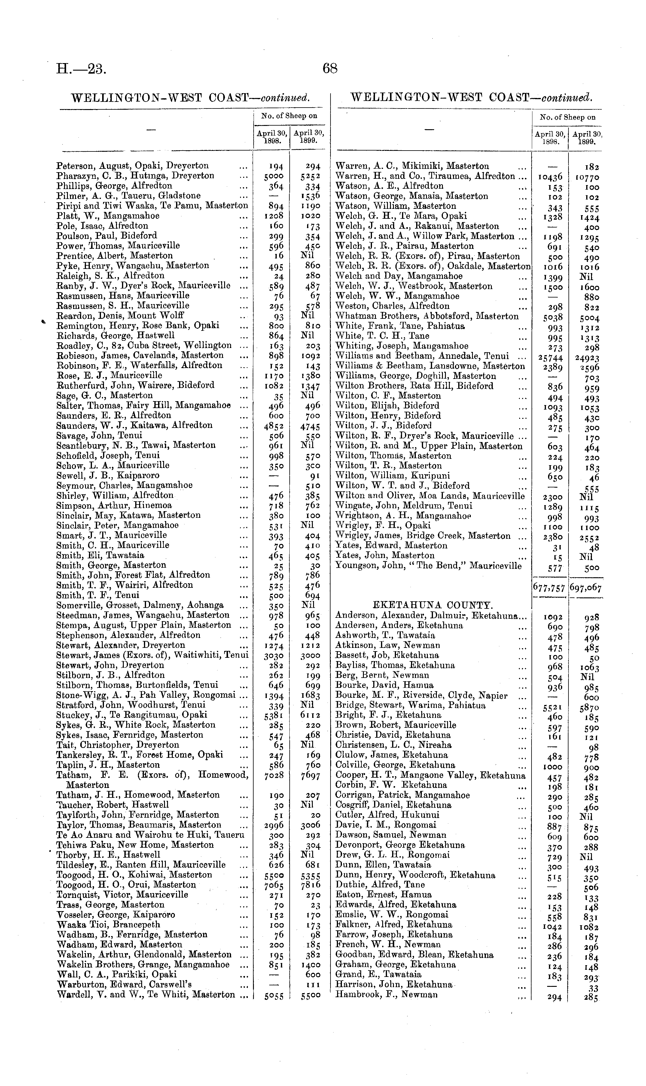 Xo. of Sheep on April 30, April 30, 1898. 1899. Warren, A. C, Mikimiki, Masterton Warren, H., and Co., Tiraumea, Alfredton ... Watson, A. E., Alfredton Watson, George, Manaia, Masterton Watson, William, Masterton Welch, G. H., Te Mara, Opaki Welch, J. and A., Rakanui, Masterton Welch, J. and A., Willow Park, Masterton ... Welch, J. E., Pairau, Masterton Welch, E. E. (Exora. of), Pirau, Masterton Welch, E. E. (Exors. of), Oakdale, Masterton Welch and Day, Mangamahoe Welch, W. J.,'Westbrook, Masterton Welch, W. W., Mangamahoe Weston, Charles, Alfredton Whatman Brothers, Abbotsford, Masterton White, Frank, Tane, Pahiatua White, T. C. H., Tane Whiting, Joseph, Mangamahoe Williams and Beetham, Annedale, Tenui ... Williams & Beetham, Lansdowne, Maeterton Williams, George, Doghill, Masterton Wilton Brothers, Eata Hill, Bideford Wilton, C. F., Masterton Wilton, Elijah, Bideford Wilton, Henry, Bideford Wilton, J. J., Bideford Wilton, R. P., Dryer's Bock, Mauriceville ... Wilton, E. and M., Upper Plain, Masterton Wilton, Thomas, Masterton Wilton, T. E., Masterton Wilton, William, Kuripuni Wilton, W. T. and J., Bideford Wilton and Oliver, Moa Lands, Mauriceville Wingate, John, Meldrum, Tenui Wrightson, A. H., Mangamahoe Wrigley, P. H., Opaki Wrigley, James, Bridge Creek, Masterton ... Yates, Edward, Masterton Yates, John, Masterton Youngson, John, " The Bend," Mauriceville 10436 153 102 343 1328 1198 691 500 1016 "399 1500 298 5°38 993 995 2 73 25744 2389 182 10770 IOO IO2 555 1424 400 I2 95 54° 49° 1016 Ml 1600 880 822 5°°4 1312 298 24923 2596 7°3 959 493 •°53 43° 300 170 464 220 183 46 836 494 1093 485 275 603 224 199 650 2300 1289 998 1100 2380 3 1 15 577 ins 993 I IOO 2552 48 Nil 500 EKETAHUNA COUNTY. Anderson, Alexander, Dalmuir, Eketahuna... Andersen, Anders, Eketahuna Ashworth, T., Tawataia Atkinson, Law, Newman Bassett, Job, Eketahuna Bayliss, Thomas, Eketahuna Berg, Bernt, Newman Bourke, David, Hamua Bourke, M. P., Riverside, Clyde, Napier Bridge, Stewart, Warima, Pahiatua Bright, P. J., Eketahuna Brown, Robert, Mauriceville Christie, David, Eketahuna Christensen, L. C, Nireaha Clulow, James, Eketahuna Colville, George, Eketahuna Cooper, H. T., Mangaone Valley, Eketahuna Corbin, P. W. Eketahuna Corrigan, Patrick, Mangamahoe Cosgriff, Daniel, Eketahuna Cutler, Alfred, Hukunui Davie, I. M., Rongomai Dawson, Samuel, Newman Devonport, George Eketahuna Drew, G. L. H., Rongomai Dunn, Ellen, Tawataia Dunn, Henry, Woodcroft, Eketahuna Duthie, Alfred, Tane Eaton, Ernest, Hamua Edwards, Alfred, Eketahuna Emslie, W. W., Rongomai Palkner, Alfred, Eketahuna Farrow, Joseph, Eketahuna French, W. H., Newman Goodban, Edward, Blean, Eketahuna Graham, George, Eketahuna Grand, E., Tawataia Harrison, John, Eketahuna Hambrook, F., Newman ,,. 677.757 697,067 1092 690 478 475 100 968 5°4 9.?6 55 2[ 460 597 161 928 798 496 48S 50 1063 Nil' 98s 600 5870 •8 5 59° 121 98 778 900 482 [81 I 5 460 Nil 875 600 288 Nil 482 1000 457 198 290 500 100 887 609 37° 729 300 515 228 '53 558 1042 184 286 236 124 183 493 35° 5°6 133 148 831 1082 .87 296 184 148 293 33 285 294