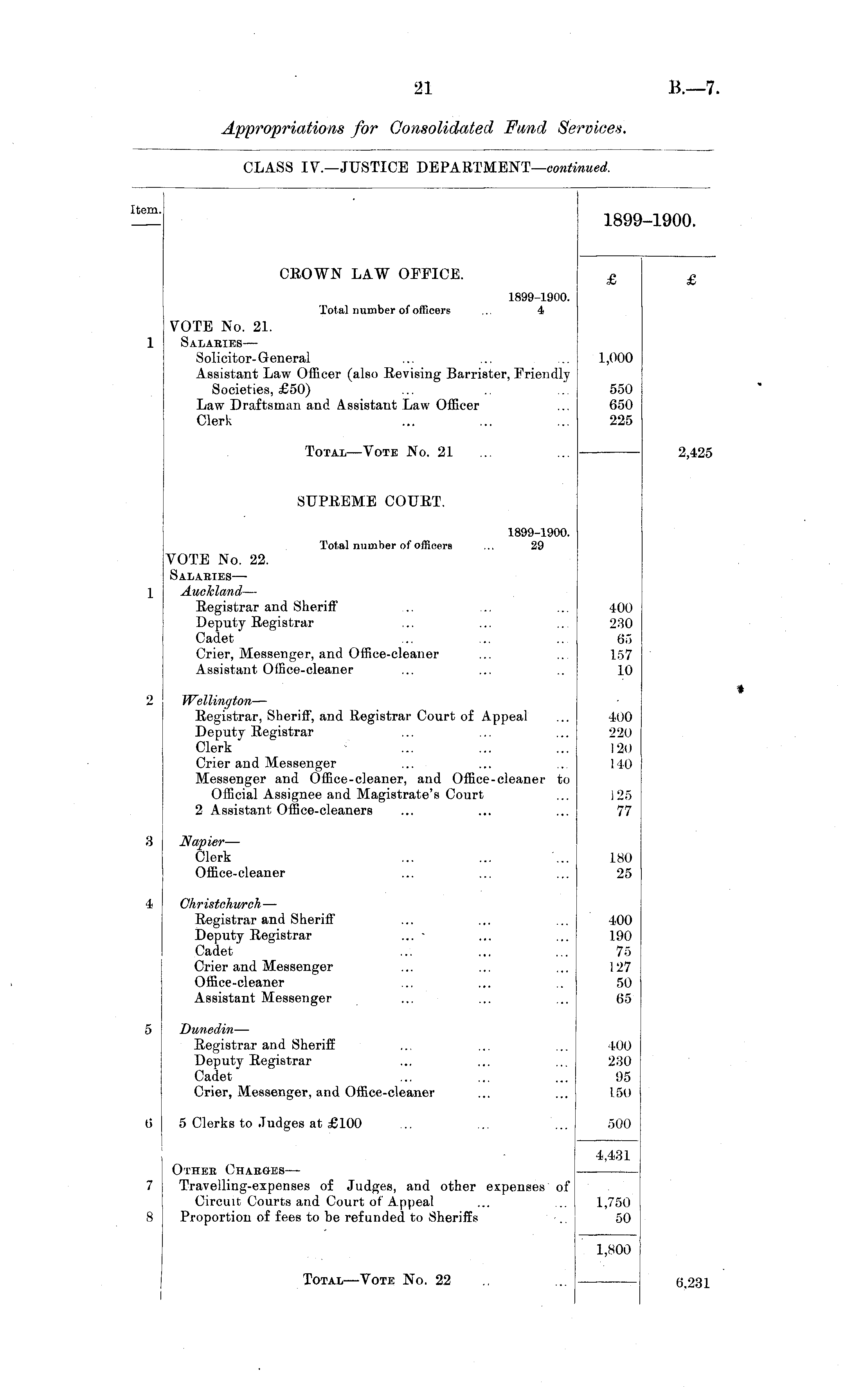 Item. 189! 1-1900. CEOWN LAW OFFICE. 1899-1900. Total number of officers ... 4 VOTE No. 21. Salaries— Solicitor-General Assistant Law Officer (also Bevising Barrister, Friendly Societies, £50) Law Draftsman and Assistant Law Officer Clerk 1,000 550 650 225 Total —Vote No. 21 2,425 SUPBEME COUET. 1899-1900. Total number of officers ... 29 VOTE No. 22. Salaries— Auckland — Eegistrar and Sheriff Deputy Eegistrar Cadet Crier, Messenger, and Office-cleaner Assistant Office-cleaner 400 230 65 157 10 2 Wellington — Eegistrar, Sheriff, and Eegistrar Court of Appeal Deputy Eegistrar Clerk Crier and Messenger Messenger and Office-cleaner, and Office-cleaner to Official Assignee and Magistrate's Court 2 Assistant Office-cleaners 400 220 120 140 125 77 3 Napier — Clerk Office-cleaner 180 25 Christchurch — Eegistrar and Sheriff Deputy Eegistrar ... - Cadet Crier and Messenger Office-cleaner Assistant Messenger 400 190 75 127 50 65 Dunedin — Eegistrar and Sheriff Deputy Eegistrar Cadet Crier, Messenger, and Office-cleaner 4.00 230 95 150 6 5 Clerks to Judges at £100 500 4,431 7 Other Charges— Travelling-expenses of Judges, and other expenses of Circuit Courts and Court of Appeal Proportion of fees to be refunded to Sheriffs 1,750 50 8 1,800 Total—Vote No. 22 6.231