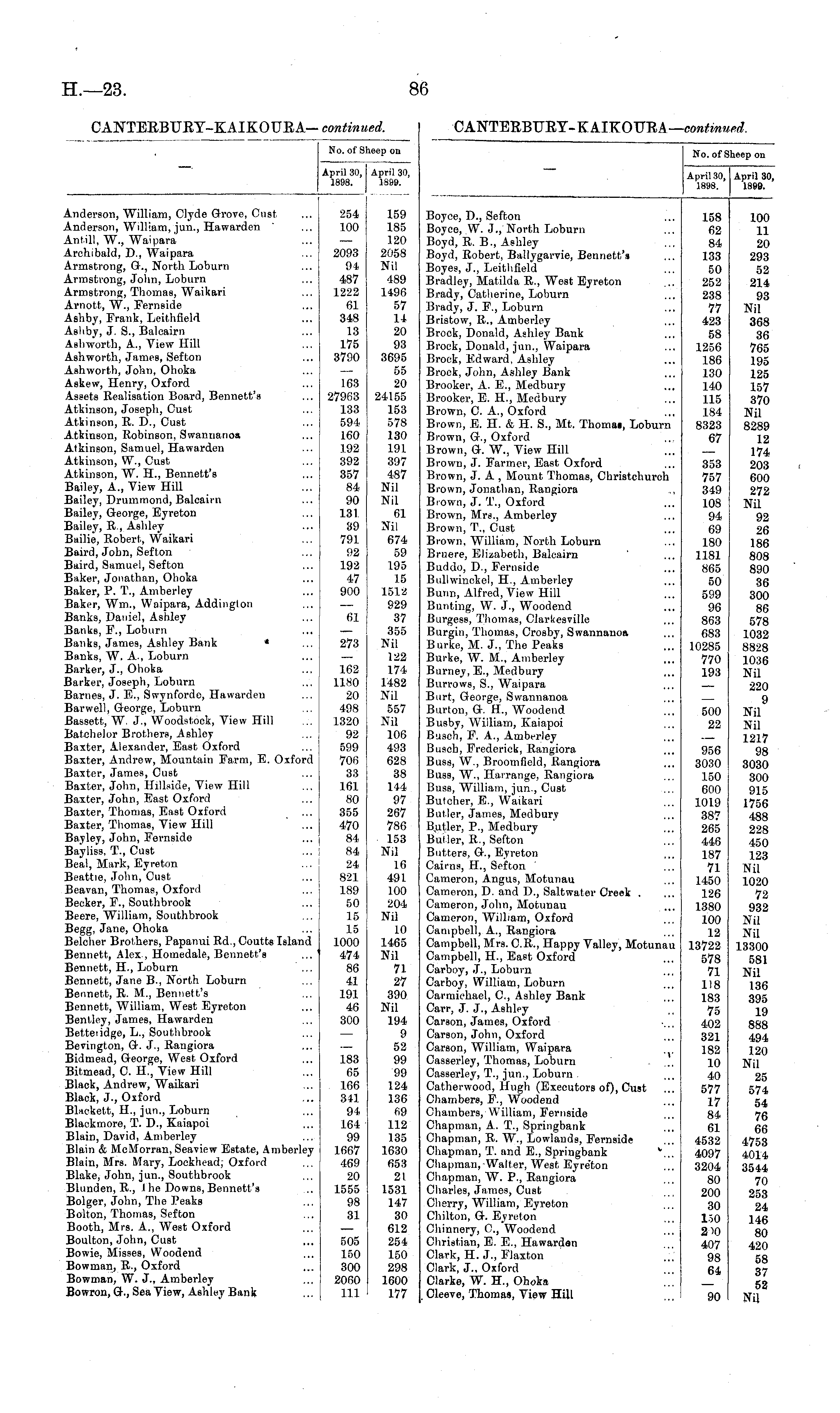 No. of Sheep on April 30, April 30, 1898. 1899. Anderson, William, Clyde Grove, Oust Anderson, William, jun., Hawarden Ant ill, W., Wai para Archibald, D., Waipara Armstrong, G., North Loburn Armstrong, John, Loburn Armstrong, Thomas, Waikari Arnott, W., Fernside Ash by, Frank, Leithfleld Ashby, J. S., Balcairn Aeliworth, A., View Hill Ash worth, James, Sefton Ashworth, John, Ohoka Askew, Henry, Oxford Assets Realisation Board, Bennett's Atkinson, Joeeph, Oust Atkinson, R. D., Oust Atkinson, Robinson, Swanrianoa Atkinson, Samuel, Hawarden Atkinson, W., Oust Atkinson, W. H., Bennett's Bailey, A., View Hill Bailey, Drummond, Balcairn Bailey, George, Eyreton Bailey, R., Ashley Bailie, Robert, Waikari Baird, John, Sefton Baird, Samuel, Sefton Baker, Jonathan, Ohoka Baker, P. T., Amberley Baker, Wm., Waipara, Addinglon Banks, Daniel, Ashley Banks, P., Loburn Banks, James, Ashley Bank Banks, W. A., Loburn Barker, J., Ohoka Barker, Joseph, Loburn Barnes, J. E., Swynforde, Hawarden Barwell, George, Loburn Bassett, W. J., Woodstock, View Hill Batchelor Brothers, Ashley Baxter, Alexander, East Oxford Baxter, Andrew, Mountain Fa,rm, E. Oxford Baxter, James, Oust Baxter, John, Hillside, View Hill Baxter, John, East Oxford Baxter, Thomas, East Oxford Baxter, Thomas, View Hill Bayley, John, Fernside Bayliss, T., Oust Beal, Mark, Evreton Beattie, John, Oust Beavan, Thomae, Oxford Becker, F., Southbrook Beere, William, Southbrook Begg, Jane, Ohoka Belcher Brothers, Papanui Rd., Coutts Island Bennett, Alex, Homedale, Bennett's Bennett, H., Loburn ... Bennett, Jane B., North Loburn Bennett, R. M., Bennett's Bennett, William, West Eyreton Bent.ley, James, Hawarden Betteridge, L., Southbrook Bevington, G. J., Rangiora Bidmead, George, West Oxford Bitmead, C. H., View Hill Black, Andrew, Waikari Black, J., Oxford Blaekett, H., jun., Loburn Blaekrnore, T. D., Kaiapoi Blain, David, Amberley Blain & McMorran, Seaview Estate, Amberley Blain, Mrs. Mary, Lockhead, Oxford Blake, John, jun., Southbrook Blunden, R., H he Downs, Bennett's Bolger, John, The Peaks Bolton, Thomas, Sefton Booth, Mrs. A., West Oxford Boulton, John, Oust Bowie, Misses, Woodend Bowman, R., Oxford Bowman, W. J., Amberley Bowron, Gk, Sea View, Ashley Bank 254 100 2093 04 487 1222 61 348 13 175 3790 163 27963 133 594 160 192 392 357 84 90 131 39 791 92 192 47 900 61 273 162 1180 20 498 1320 92 599 706 33 161 80 355 470 84 84 24 821 189 50 15 15 1000 474 86 41 191 46 300 159 185 120 2058 Nil 489 1496 57 14 20 93 3695 55 20 24155 153 578 130 191 397 487 Nil Nil 61 Nil 674 59 195 15 1513 929 37 355 Nil 122 174 1482 Nil 557 Nil 106 493 628 38 144 97 267 786 153 Nil 16 491 100 204 Nil 10 1465 Nil 71 27 390 Nil 194 9 52 99 99 124 136 69 112 135 1630 653 21 1531 147 30 612 254 150 298 1600 177 183 65 166 341 94 164 99 1667 469 20 1555 98 31 505 150 300 2060 111