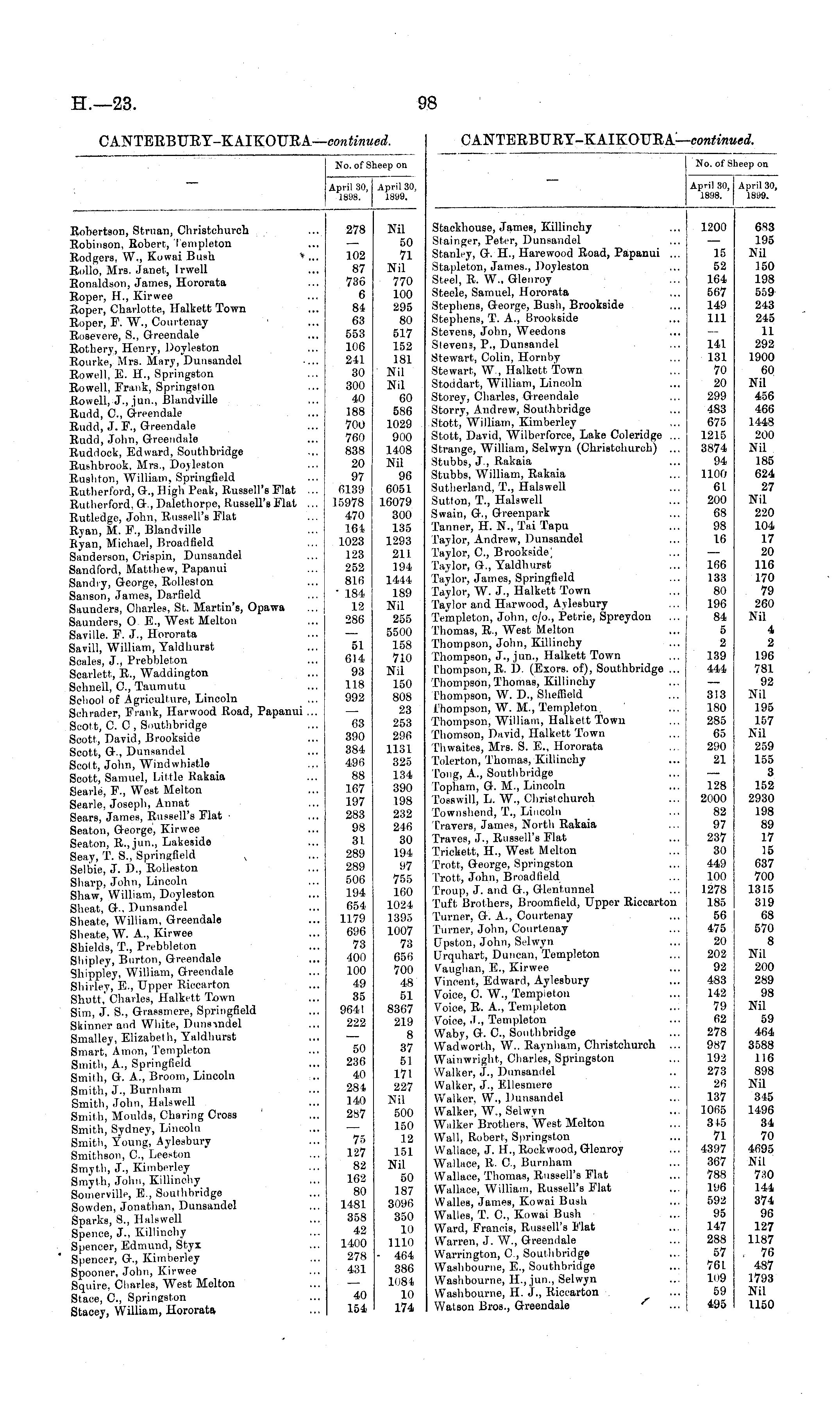 No. of Sheep on April 30, April 30, 1898. 1899. Staekhouse, James, Killinchy Stainger, Peter, Dunsandel Stanley, G. H., Harewood Road, Fapauui ... Stapleton, James., Doyleston Steel, R. W., Glenroy Steele, Samuel, Uororata Stephens, George, Bush, Brookside Stephens, T. A., Broobside Stevens, John, Weedons Sleven3, P., Dunsandel Stewart, Colin, Hornby Stewart, W, Halkett Town Stoddart, William, Lincoln Storey, Cliarles, Greendale Storry, Andrew, Southbridge Stott, William, Kimberley Stott, David, Wilberforce, Lake Coleridge ... Strange, William, Selwyn (Chriatchurch) ... Stubbe, J., Rakaia Stubbs, William, Rakaia Sutherland, T., Halswell Sutton, T., Halswell Swain, G., Greenpark Tanner, H. N., Tai Tapu Taylor, Andrew, Dunsandel Taylor, C, Taylor, G., Yaldhurst Taylor, James, Springfield Taylor, W. J., Halkett Town Taylor and Harwood, Aylesbury Templeton, John, c/o., Petrie, Spreydon Thomas, E., West Melton Thompson, John, Killinchy Thompson, J., Jan., Halkett Town rhompson, R. D. (Exors. of), Southbridge ... Thompson, Thomas, Killinchy Thompson, W. D., Sheffield Thompson, W. M., Templeton Thompson, William, Halkett Town Thomson, David, Halkett Town Thwaites, Mrs. S. E., Hororata Tolerton, Thomas, Killinchy Tong, A., Southbridge Topham, G. M., Lincoln Toeswill, L. W., Ohrislchurch Townshend, T., Lincoln [ravers, James, North Rakaia Traves, J., Russell's Flat Trickett, H., West Melton Trott, George, Springston Trott, John, BroadHeld Troup, J. and G., Glentunnel Tuft Brothers, Broomfield, Upper Kiccarton Turner, G. A., Coiu-tenay Turner, John, Courtenay CI pston, John, Selwyn Urquhart, Duncan, Templeton Vaughan, E., Kirwee Vincent, Edward, Ayleebury Voice, 0. W., Tempielon Voice, R. A., Templeton Voice, J., Templeton Waby, G. 0., Southbridge Wadworth, W.. Raynliam, Christchurch ... Wainwright, Cliarles, Springston Walker, J., Dimsanrtel Walker, J., Elleemere Walker, W., Dunsandel Walker, W», Selvryn Wiiiker Brothers, West Melton Wall, Robert, Springston Wallace, J. H., Roekwood, Glenroy Wallace, R. C, Burnham Wallace, Thomas, Russell's Flat Wallace, William, Russell's Flat Walles, James, Kowai Bush Walles, T. C, Kowai Bush Ward, Francis, Russell's Mat Warren, J. W., Greendale Warrington, C, Southbridge Washbourne, E., Southbridge Washbourne, H.,jun., Selwyn Washbourne, H. J., Riecarton . Watson Bros., Greendale ' 1200 15 52 164 567 149 111 141 131 70 20 299 483 675 1215 3874 94 1100 6L 200 68 98 16 166 133 80 196 84 5 2 139 444 313 180 285 65 290 21 6S3 195 Nil 150 198 559 243 245 11 292 1900 60 Nil 456 466 1448 200 Nil 185 624 27 Nil 220 104 17 20 116 170 79 260 Nil 4, 2 196 781 92 Nil 195 157 Nil 259 155 3 152 2930 198 89 17 15 637 700 1315 319 68 570 8 Nil 200 289 98 Nil 59 464 3588 116 898 Nil 345 1496 34 70 4R95 Nil 7H0 144 374 96 127 1187 76 487 1793 Nil U50 128 2000 82 97 237 30 449 100 1278 185 56 475 20 202 92 483 142 79 f>2 278 987 192 273 26 137 1065 3+5 71 4397 367 788 196 592 95 147 288 57 76L 109 59 495