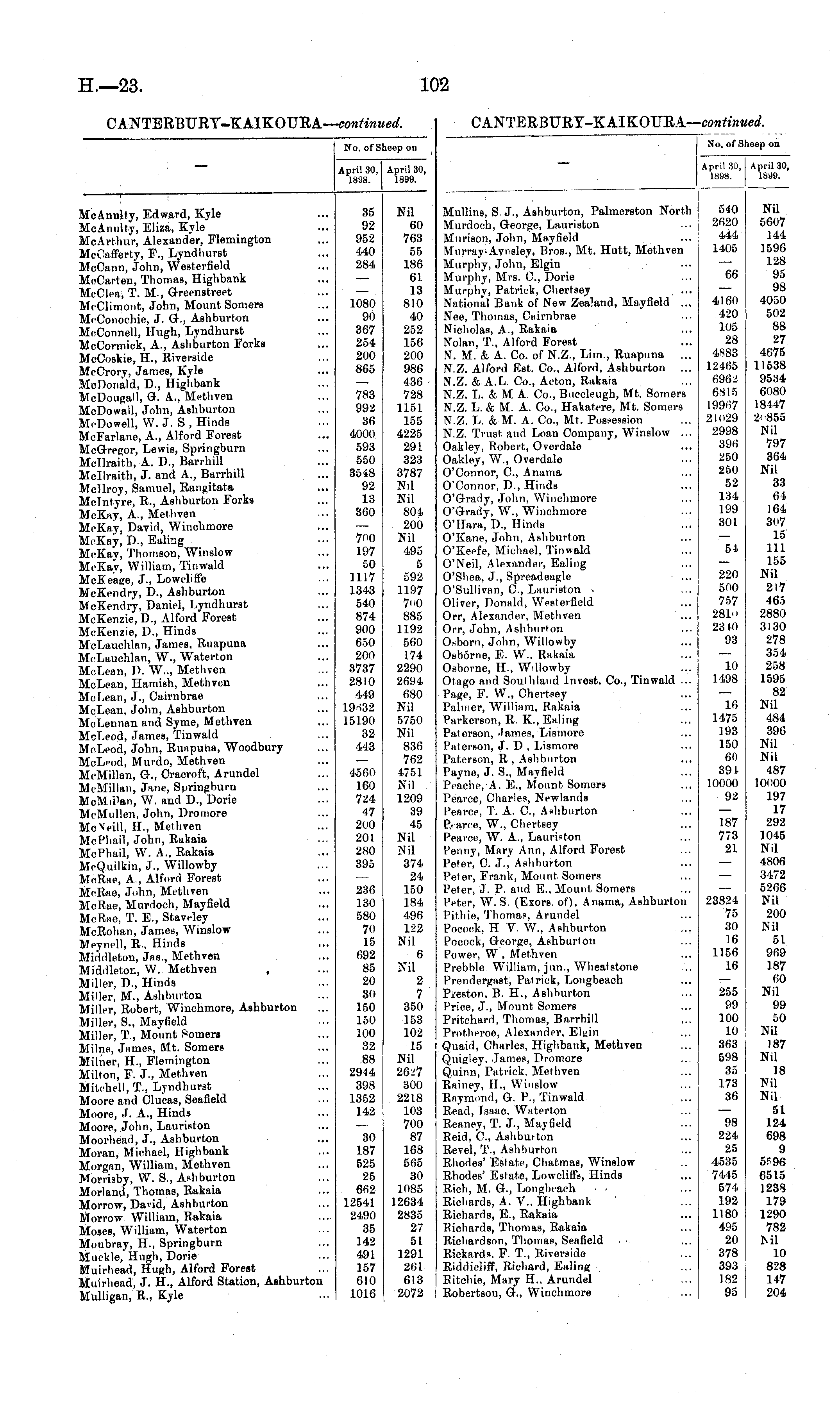 No. of Sheep on April 30, 1898. April 30, 1899. i ; MeAnuHy, Edward, Kyle McAnuky, Eliza, Kyle McArthur, Alexander, Flemington MeOafferty, F., Lyndhurst McOann, John, Westerfield McCarten, Thomas, Highbank McClea, T. M., Greenstreet McClimont, John, Mount Somers MoConochie, J. G., Ashburton MeConnell, Hugh, Lyndhurst McCormick, A., Ashburton Forks McCoskie, H., Riverside MeCrory, James, Kyle McDonald, D., Highbank McDougall, 9. A., Methven McDowall, John, Ashburton McDowell, VV. J. S , Hinds McFarlane, A., Alford Forest McGregor, Lewis, Springburn Mcllraith, A. D., Barrhill Mcllraith, J. and A., Barrhill Mcllroy, Samuel, Rangitata Mclntyre, E., Ashburton Forks McKay, A., Mel.hven McKay, Davirl, Winchmore McKay, D., EaliDg McKay, Thomson, Winslow McKay, William, Tinwald McKeage, J., Lowcliffe McKendry, I)., Ashburton McKendry, Daniel, Lyndhurst McKenzie, D., Alford Forest McKenzie, D., Hinds McLauehlan, James, Ruapuna MeLauchlan, W., Waterton McLean, D. W.., Methven McLean, Hamish, Methveu McLean, J., Cairnbrae McLean, John, Ashburton McLennan and Syme, Methven MoLeod, James, Tinwald McLeod, John, Ruapuna, Woodbury McLeod, Murdo, Methven McMillan, G., Cracroft, Arundel McMillan, Jane, S|iringburn McMii'an, W. and D., Dorie McMullen, John, Dromore McN'eill, H., Methven McPhail, John, Rakaia McPhail, W. A., Rakaia McQuilkin, J., Willowby Mr.Rae, A , Alford Forest McRae, John, Methven McRaei, Murdoch, Mayfield McR«e, T. E., Staveley McRolian, James, Winslow Meynell, R., Hinds Mirldletou, Jas., Methven Middletor., W. Methven , Miller, P., Hinds Miller, M., AehburtoB Miller, Robert, Winchmore, Ashburton Miller, S., May6eld Miller, T., Mo'unt Somers Milne, James, Mt. Somers Milner, H., Flemington Milton, F. J., Methven Mitchell, T., Lyndhurst Moore and Clucae, Seafield Moore, J. A., Hinds Moore, John, Laurieton Moorhead, J., Ashburton Moran, Michael, Highbank Morgan, William, Methven Morrisby, W. S., Ashburton Morland, Thomas, Rakaia Morrow, David, Ashburton Morrow William, Rakaia Moses, William, Waterton Moubray, H., Springburn Muekle, Hugh, Dorie Muirhead, Hugh, Alford Forest Muirhead, J. H., Alford Station, Ashburton Mulligan, R., Kyle 35 92 952 440 284 1080 90 367 254 200 865 783 992 36 4000 593 550 3548 92 13 360 7oo 197 50 1117 1343 540 874 900 650 200 3737 2810 449 19o32 15190 32 443 Nil 60 763 55 186 61 13 810 40 252 156 200 986 436 728 1151 155 4225 291 323 3787 Nil Nil 804 200 Nil 495 5 592 1197 7"0 885 1192 560 174 2290 2694 680 Nil 5750 Nil 836 762 4751 Nil 1209 39 45 Nil Nil 374 24 150 184 496 122 Nil 6 Nil 2 7 350 153 102 15 Nil 26^7 300 2218 103 700 87 168 565 30 1085 12634 2835 27 51 1291 261 613 2072 4560 160 724 47 200 201 280 395 236 130 580 70 15 692 85 20 30 150 150 100 32 88 2944 398 1352 142 30 187 525 25 6fi2 12541 2490 35 142 491 157 610 1016