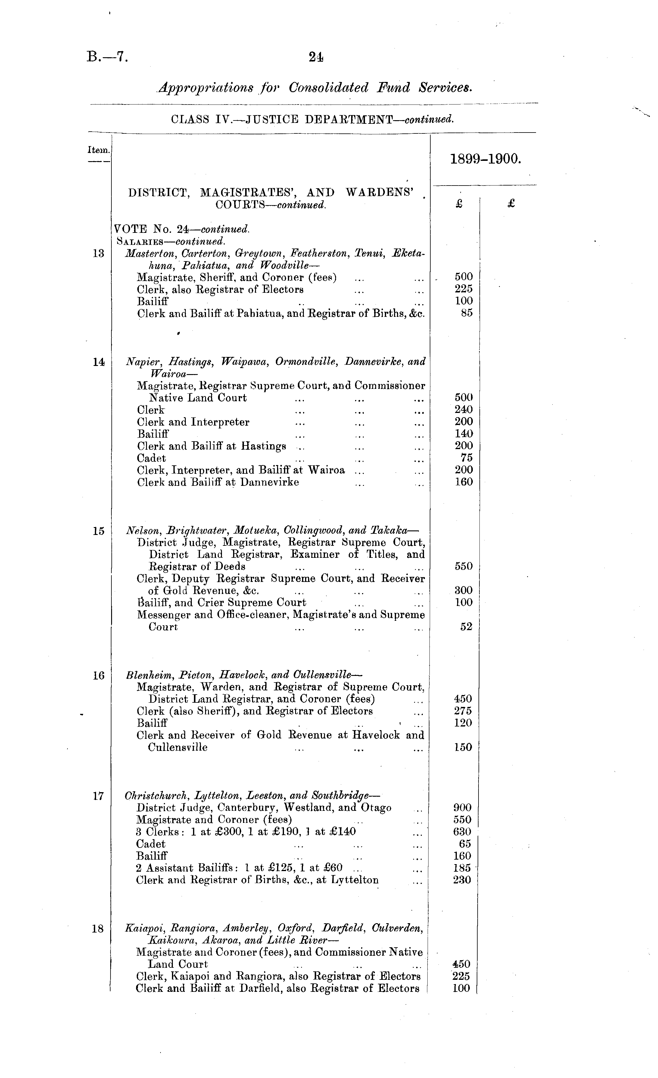 Item. 1899-1900 DISTBICT, MAGISTEATES', AND WARDENS* COURTS— continued. £ £ 13 VOTE No. 24— continued. Salaries — continued. Masterton, Carterton, Greytown, Featherston, Tenui, Fketahuna, Pahiatua, and Woodville — Magistrate, Sheriff, and Coroner (fees) Clerk, also Registrar of Electors Bailiff Clerk and Bailiff at Pahiatua, and Eegistrar of Births, &c. 500 225 100 85 * 14 Napier, Hastings, Waipawa, Ormondville, Dannevirke, and Wairoa — Magistrate, Eegistrar Supreme Court, and Commissioner Native Land Court Clerk Clerk and Interpreter Bailiff Clerk and Bailiff at Hastings ... Cadet Clerk, Interpreter, and Bailiff at Wairoa ... Clerk and Bailiff at Dannevirke 500 240 200 140 200 75 200 160 15 Nelson, Brightwater, Motueka, Collingwood, and Takaka — District Judge, Magistrate, Eegistrar Supreme Court, District Land Eegistrar, Examiner of Titles, and Eegistrar of Deeds Clerk, Deputy Eegistrar Supreme Court, and Eeceiver of Gold Eevenue, &c. Bailiff, and Crier Supreme Court Messenger and Office-cleaner, Magistrate's and Supreme Court 550 300 100 52 16 Blenheim, Picton, Havelock, and Cullensville — Magistrate, Warden, and Eegistrar of Supreme Court, District Land Eegistrar, and Coroner (fees) Clerk (also Sheriff), and Eegistrar of Electors Bailiff .... ' ... Clerk and Eeceiver of Gold Eevenue at Havelock and Cullensville 450 275 120 150 17 Christchurch, Lyttelton, Leeston, and Southbridge — District Judge, Canterbury, Westland, and Otago Magistrate and Coroner (fees) 3 Clerks: 1 at £300, 1 at £190, 1 at £140 Cadet Bailiff 2 Assistant Bailiffs: 1 at £125, 1 at £60 ... Clerk and Eegistrar of Births, &c, at Lyttelton 900 550 630 65 160 185 230 18 Kaiapoi, Bangiora, Amberley, Oxford, Darfield, Culverden, Kaikoura, Akaroa, and Little Biver — Magistrate and Coroner (fees), and Commissioner Native Land Court Clerk, Kaiapoi and Bangiora, also Eegistrar of Electors Clerk and Bailiff at Darfield, also Eegistrar of Electors 450 225 100