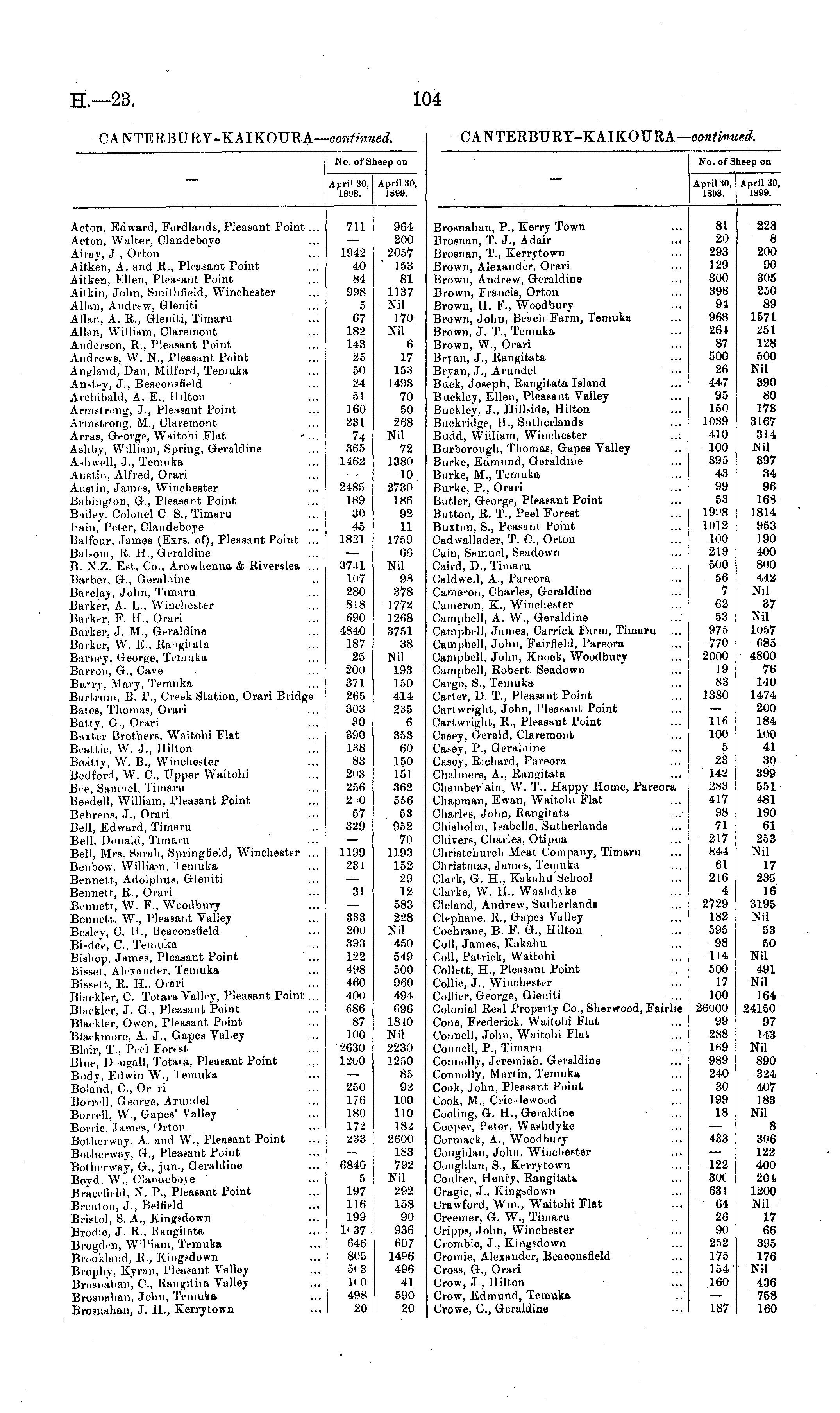 No. of Sheep on April 30, April 30, 181)8. 1899. Acton, Edward, Fordlands, Pleasant Point... Acton, Walter, Clandeboye Airay, J , Orton Aitken, A. and R., Pleasant Point Aitken, Ellen, Pleasant Point Aiikin, John, Smitlifield, Winchester Allan, Andrew, Gleniti Allan, A. R., Gleniti, Timaru Allim, William, Clareiuoiit Anderson, R., Pleasant Point Andrews, W. N., Pleasant Point Analond, Dan, Milford, Temuka An>tey, J., Beaconsfield Archibald, A. E., Hilton Armstrong, J , Pleasant Point Armstrong, M., Olaremont Arras, George, Wtiitohi Flat Ashby, William, Spring, Geraldine Ailiwell, J., Temuka Austin, Alfred, Orari Austin, James, Winchester Biibinglon, G , Pleasant Point Bailey. Colonel C S., Timaru Hain, Peler, Olaudeboye Ballbur, James (Exrs. of), Pleasant Point ... Bal.-om, R. H., Geraldine B. N.Z. Est. Co., Arowhenua & Riverslea ... Barber, G , Geraldine Barclay, John, 'I , imaru Barker, A. L , Winchester Barker, F. U , Orari Barker, J. M., Geraldine Barker, W. E., Rangiiata Barney, (-Jeorge, Temuka Barron, G., Cave Barry, Mary, Temuka Burtrurn, B. P., Creek Station, Orari Bridge Bales, Thomas, Orari Batty, G., Orari Baxter Brothers, Waitohi Flat Beattie, VV. J., Hilton Beal.iv, W. B., Winchester Bedford, W. C, Upper Waitohi Bee, Samuel, Timaru Beedell, William, Pleasant Point Behrens, J., Orari Bell, Edward, Timaru Bell, Donald, Timaru Bell, Mrs. Sarali, Springfield, Winchester ... Benbow, William, leniuka Bennett, Atlolphus, Gleniti Bennett, R., Orari Bennett, W. F., Woodbury Bennett, W., Pleasant Valley Besley, C. H., Heaconsfield BUdee, C, Temuka Bishop, James, Pleasant Point Bissel, Alexander, Temuka Bissett, R. H., Orari Biaekler, C. Tolara Valley, Pleasant Point... Blnckler, J. G., Pleasant Point Biaekler, Owen, Pleasant Point Blarkmore, A. J., Gapes Valley Bluir, T., Peei Forest Blue, D.'iigall, Tota''a, Pleasant Point Body, Edwin W., leniuka Boland, C, Or n Borrell, George, Arundel Borrell, W., Gapes' Valley Borrie, James, ( )rton Botherway, A. and W., Pleasant Point Botherway, G., Pleasant Point Botherway, G., jun., Geraldine Boyd, W., Clandeboye Biacefield, N. P., Pleasant Point Brenton, J., Belfield Bristol, S. A., Kingsdown Brodie, J. R., Kangilata Brogdi n, WilHam, Temuka Bri'Oklinid, R., Kingsdown Brophy, Kyran, Pleasant Valley Brosnahan, C, Rangitira Valley Brosnahan, John, Temuka Brosnahai), J. H., Kerrytown 711 1942 40 84 998 5 67 182 143 25 50 24 51 160 231 74 365 1462 2485 189 30 45 1821 3731 107 280 818 fi90 4840 187 25 200 371 265 303 ?0 390 138 83 203 256 Z 0 57 329 964 200 2057 153 81 1137 Nil 170 Nil 6 17 153 1493 70 50 268 Nil 72 1380 10 2730 186 92 11 1759 66 Nil 9S 378 1772 1268 3751 38 Nil 193 lnO 414 235 6 353 60 150 151 362 556 53 952 70 1193 152 29 12 583 228 Nil 450 549 500 960 494 696 18 iO Nil 2230 1250 85 92 100 110 182 2600 183 792 Nil 292 158 90 936 607 1496 496 41 590 20 1199 231 31 333 200 393 122 498 460 400 686 87 100 2630 12uO 250 176 180 172 233 6840 5 197 116 199 1"37 646 805 5(3 ICO 498 20