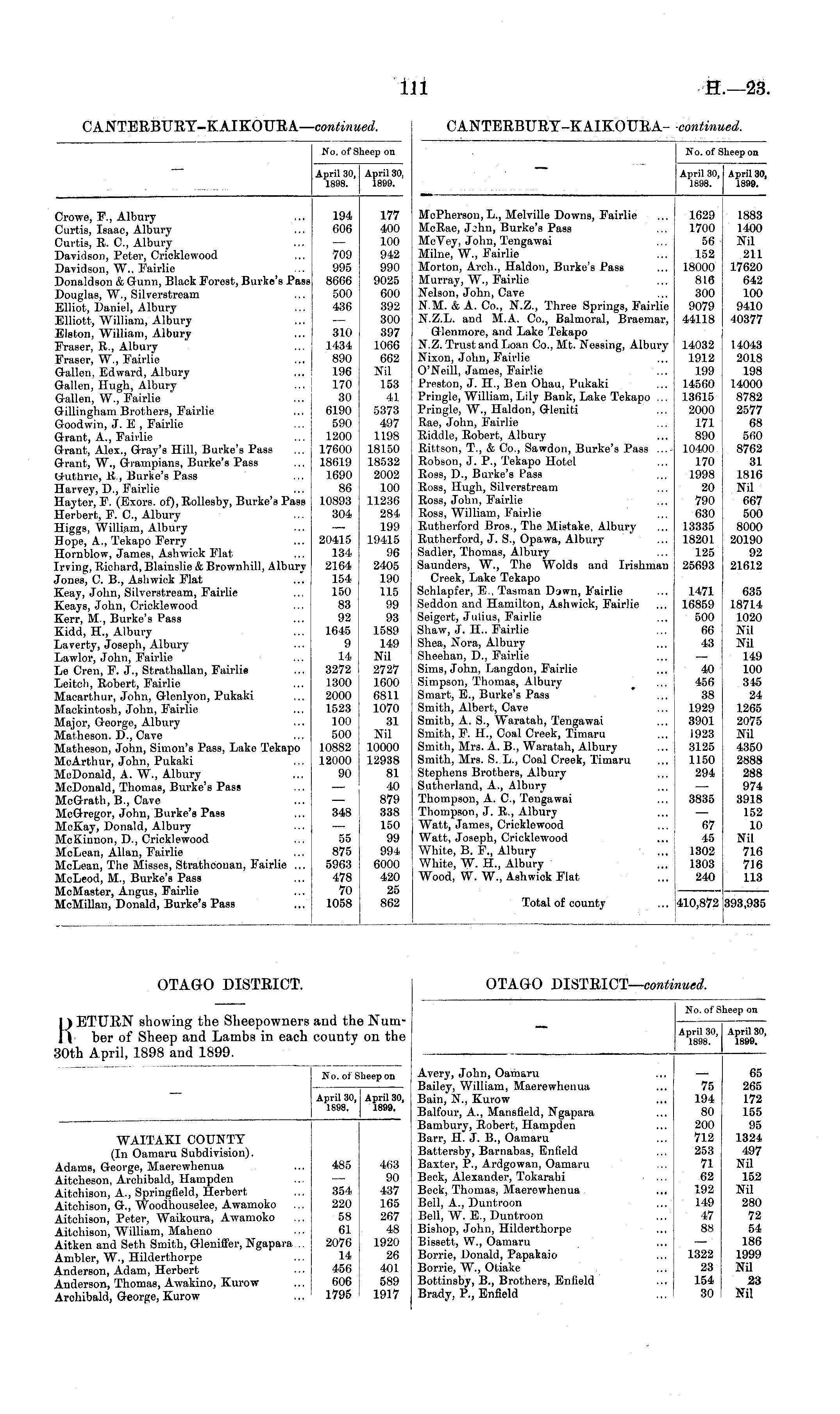 No. of Sheep on April 30, April 30, 1898. 1899. Crowe, F., Albury Curtis, Isaac, Albury Curtis, R. C, Albury Davidson, Peter, Crieklewood Davidson, W., Fairlie Donaldson & G-unn, Black Forest, Burke's Pass Douglas, W., Silverstream Elliot, Daniel, Albury Elliott, William, Albury Elston, William, Albury Fraser, R., Albury Fraser, W., Fairlie G-allen, Edward, Albury Gallen, Hugh, Albury ... \ G-allen, W., Fairlie Gillingham Brothers, Fairlie Goodwin, J. E , Fairlie Grant, A., Fairlie Grant, Alex., Gray's Hill, Burke's Pass Grant, W., Grampians, Burke's Pass U-uthne, K, Burke's Pass Harvey, D., Fairlie Hayter, F. (Exors. of), Rollesby, Burke's Pass Herbert, F. C, Albury Higgs, William, Albury Hope, A., Tekapo Ferry Hornblow, James, Ashwick Flat Irving, Richard, Blainslie & Brownhill, Albury Jones, C. B., Ashwick Flat Keay, John, Silverstream, Fairlie Keays, John, Crieklewood Kerr, M., Burke's Pass Kidd, H., Albury Laverty, Joseph, Albury Lawlor, John, Fairlie Le Cren, F. J., Strathallan, Fairlie Leitch, Robert, Fairlie Macarthur, John, Glenlyon, Pukaki Mackintosh, John, Fairlie Major, George, Albury Matheeon. D., Cave Matheson, John, Simon's Pass, Lake Tekapo McArthur, John, Pukaki McDonald, A. W., Albury McDonald, Thomas, Burke's Pass McGrath.B., Cave McGregor, John, Burke's Pass McKay, Donald, Albury McKinnon, D., Crieklewood McLean, Allan, Fairlie McLean, The Misses, Strathconan, Fairlie ... McLeod, M., Burke's Pass McMaster, Angus, Fairlie McMillan, Donald, Burke's Pass 194 606 177 400 100 942 990 9025 600 392 300 397 1066 662 Nil 153 41 5373 497 1198 18150 18532 2002 100 11236 284 199 19415 96 2405 190 115 99 93 1589 149 Nil 2727 1600 6811 1070 31 Nil 10000 12938 81 40 879 338 150 99 994 6000 420 25 862 709 995 8666 500 436 310 1434 890 196 170 30 6190 590 1200 17600 18619 1690 86 10893 304 20415 134 2164 154 150 83 92 1645 9 14 3272 1300 2000 1523 100 500 10882 12000 90 343 55 875 5963 478 70 1058