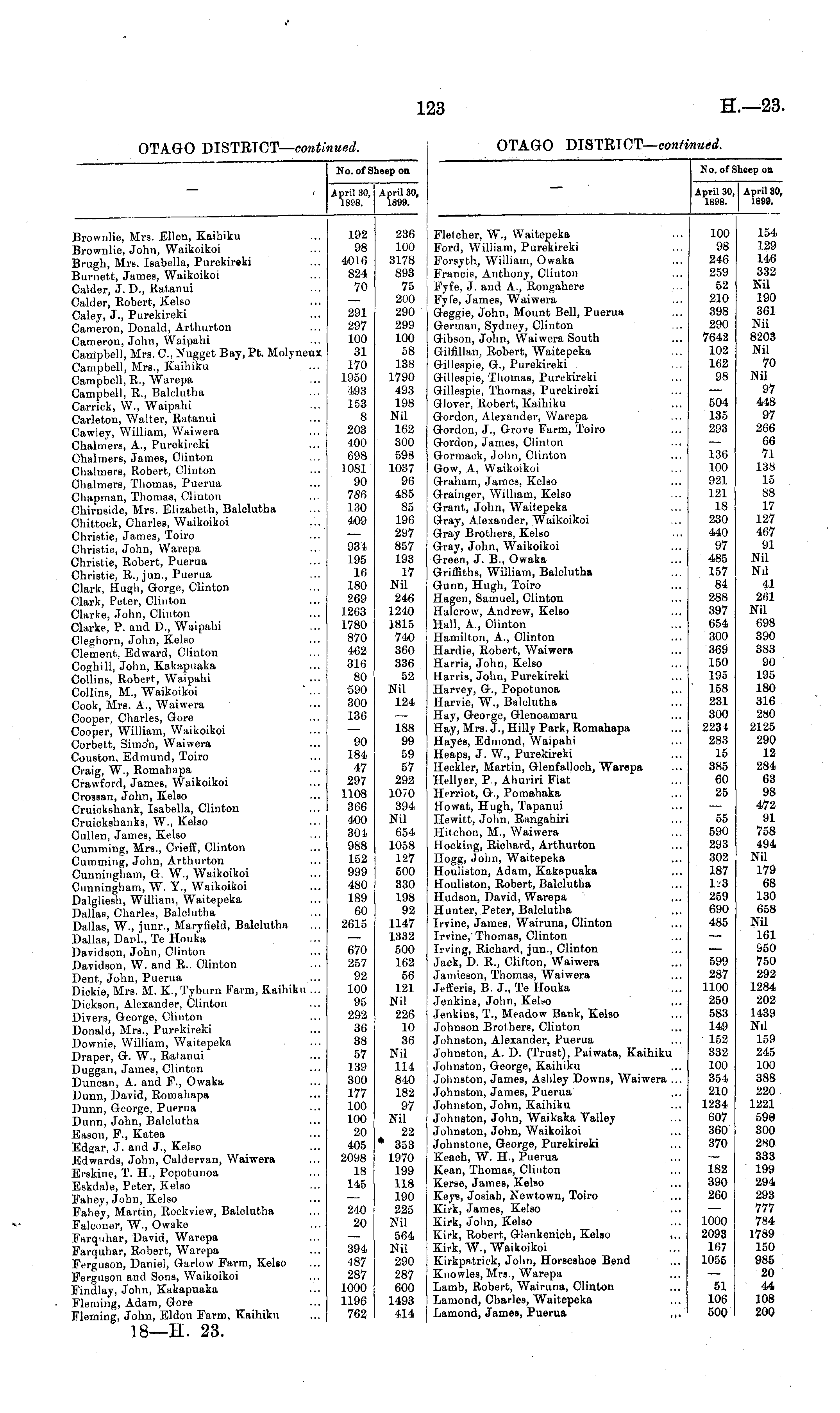 No. of Sheep on April 30, April 30, 1898. 1899. Brownlie, Mrs. Ellen, Kaihiku Brownlie, John, Waikoikoi Brugh, Mrs. Isabella, Purekireki Burnett, James, Waikoikoi Calder, J. D., Ratanui Calder, Robert, Kelso Caley, J., Purekireki Cameron, Donald, Arthurton Cameron, John, Waipahi Campbell, Mrs. C, Nugget Bay, Pt. Molyneux Campbell, Mrs., Kaihiku Campbell, R., Warepa Campbell, R., Balclutha Carrick, W., Waipahi Carleton, Walter, Ratanui Cawley, William, Waiwera Chalmers, A., Purekireki Chalmers, James, Clinton Chalmers, Robert, Clinton Chalmers, Thomas, Puerua Chapman, Thomas, Clinton Chirnside, Mrs. Elizabeth, Balclutha Chittock, Charles, Waikoikoi Christie, James, Toiro Christie, John, Warepa Christie, Robert, Puerua Christie, R.,jun., Puerua Clark, Hugh, Gorge, Clinton Clark, Peter, Clinton Clarke, John, Clinton Clarke, P. and D., Waipahi Cleghorn, John, Kelso Clement, Edward, Clinton Coghill, John, Kakapuaka Collins, Robert, Waipahi Collins, M., Waikoikoi "... Cook, Mrs. A., Waiwera Cooper, Charles, Gore Cooper, William, Waikoikoi Corbett, Simon, Waiwera Couston, Edmund, Toiro Craig, W., Romahapa Crawford, James, Waikoikoi Crosean, John, Keleo Cruieishank, Isabella, Clinton Cruickshanks, W., Kelso Cullen, James, Kelso Cumming, Mrs., Crieff, Clinton Cumming, John, Arthurton Cunningham, G. W., Waikoikoi Cunningham, W. Y., Waikoikoi Dalgliesh, William, Waitepeka Dallas, Charles, Balclutha Dallas, W., jum\, Maryfield, Balclutha Dallas, Danl., Te Houka Davidson, John, Clinton Davidson, W. and R.. Clinton Dent, John, Puerua Dickie, Mrs. M. K., Tyburn Farm, Raihiku ... Dickson, Alexander, Clinton Divers, George, Clinton Donald, Mrs., Purekireki Downie, William, Waitepeka Draper, G. W., Ratanui Duggan, JameB, Clinton Duncan, A. and F., Owaka Dunn, David, Romahapa Dunn, George, Puerua Dunn, John, Balclutha Eason, F., Katea Edgar, J. and J., Kelso Edwards, John, Caldervan, Waiwera Erskine, T. H., Popotunoa Eskdale, Peter, Kelso Fahey, John, Kelso Fahey, Martin, Rockview, Balclutha Falconer, W., Owake Farquhar, David, Warepa Farquhar, Robert, Warepa Ferguson, Daniel, Garlow Farm, Keleo Ferguson and Sons, Waikoikoi Findlay, John, Kakapuaka Fleming, Adam, Gore Fleming, John, Eldon Farm, Kaihiku 192 98 4016 824 70 291 297 100 31 170 1950 493 153 8 203 400 698 1081 90 786 130 409 236 100 3178 893 75 200 290 299 100 58 138 1790 493 198 Nil 162 300 598 1037 96 485 85 196 297 857 193 17 Nil 246 1240 1815 740 360 336 52 Nil 124 934 195 16 180 269 1263 1780 870 462 316 80 ■590 300 136 90 184, 47 297 1108 366 400 301 988 152 999 480 189 60 2615 670 257 92 100 95 292 36 38 57 139 300 177 100 100 20 405 2098 18 145 188 99 59 57 292 1070 394 Nil 654 1058 127 500 330 198 92 1147 1332 500 162 56 121 Nil 226 10 36 Nil 114 840 182 97 Nil 22 * 353 1970 199 118 190 225 Nil 564 Nil 290 287 600 1493 414 240 20 394 487 287 1000 1196 762