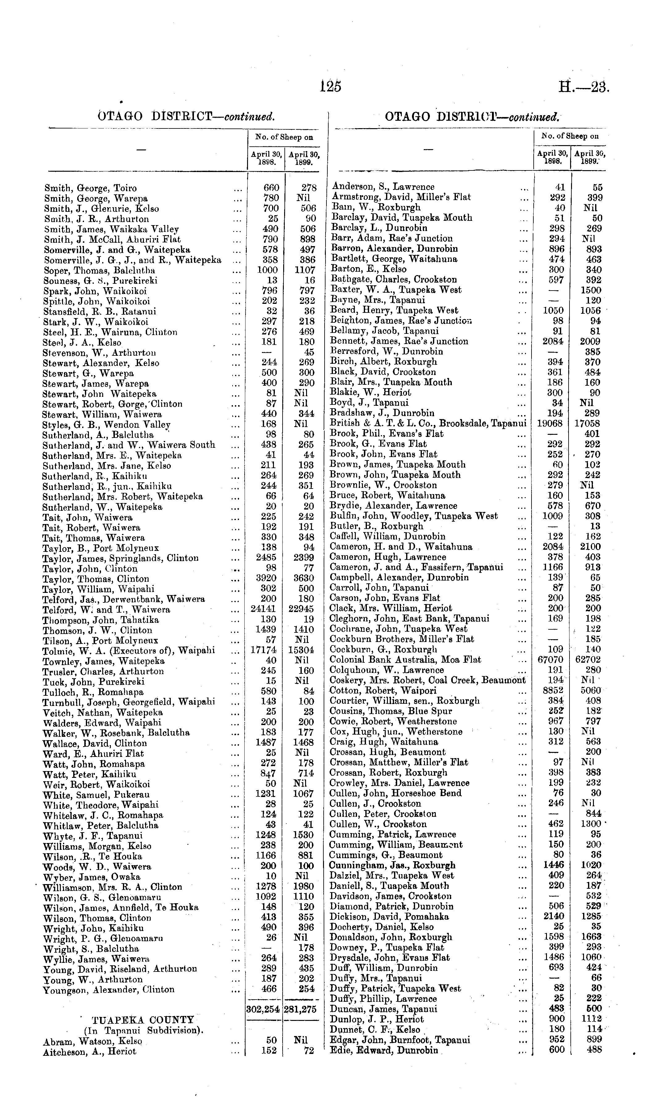 No. of Sheep on April 30, April 30, 1898. 1899. Anderson, S., Lawrence Armstrong, David, Miller's Plat Bam, W., Roxburgh Barclay, David, Tuapeka Mouth Barclay, L., Dunrobin Barr, Adam, Rae's Junction Barron, Alexander, Dunrobin Bartlett, Q-eorge, Waitahuna Barton, E., Kelso Bathgate, Charles, Crooketon Baxter, W. A., Tuapeka West Bayue, Mrs., Tapanui Beard, Henry, Tuapeka West Beighton, James, Rae's Junction Bellamy, Jacob, Tapanui Bennett, James, Rae's Junction Berresford, W., Dunrobin Birch, Albert, Roxburgh Black, David, Crookston Blair, Mrs., Tuapeka Mouth Blakie, W., Heriot Boyd, J., Tapanui Bradshaw, J., Dunrobin British & A. T. & L. Co., Brooksdale, Tapanui Brook, Phil., Evans's Flat Brook, G-., Evans Flat Brook, John, Evans Flat Brown, James, Tuapeka Mouth Brown, John, Tuapeka Mouth Brownlie, W., Crookston Bruce, Robert, Waitahuna Brydie, Alexander, Lawrence Bu'lfln, John, Woodley, Tuapeka West Butler, B., Roxburgh Caffell, William, Dunrobin Cameron, H. and D., Waitahuna Cameron, Hugh, Lawrence Cameron, J. and A., Faseifern, Tapanui Campbell, Alexander, Dunrobin Carroll, John, Tapanui Carson, John, Evans Flat Clack, Mrs. William, Heriot Clegnorn, John, Baet Bank, Tapanui Cochrane, John, Tuapeka West Cockburn Brothers, Miller's Flat Cockburn, G\, Roxburgh Colonial Bank Australia, Moa Flat ' ... Colquhoun, W., Lawrence Coskery, Mrs. Robert, Coal Creek, Beaumont Cotton, Robert, Waipori Courtier, William, sen., Roxburgh Cousins, Thomas, Blue Spur Cowie, Robert, Weatherstone Cox, Hugh, jun., Wetherstone Craig, Hugh, Waitahuna Crossan, Hugh, Beaumont Crossan, Matthew, Miller's Flat Crossan, Robert, Roxburgh Crowley, Mrs. Daniel, Lawrence Cullen, John, Horseshoe Bend Cullen, J., Crookston Cullen, Peter, Crookston Cullen, W., Crookston Cumming, Patrick, Lawrence Cumming, William, Beaumont Cummings, Gγ., Beaumont Cunningham, Jas., Roxburgh Dalziel, Mrs., Tuapeka West Daniell, S., Tuapeka Mouth Davidson, James, Crookston .<. Diamond, Patrick, Dunrobin Dickison, David, Pomahaka Docherty, Daniel, Kelso Donaldson, John, Roxburgh Downey, P., Tuapeka Flat ... Drysdale, John, Evans Flat Duff, William, Dunrobin Duffy, Mrs., Tapanui Duffy, Patrick, Tuapeka West Duffy, Phillip, Lawrence Duncan, James, Tapanui Dunlop, J. P., Heriot Dunnet, C. F., Kelso , Edgar, John, Burnfoot, Tapanui Edie, Edward, Dunrobia 41 292 40 51 298 294 896 474 300 597 1050 98 91 2084 394 361 186 300 34 194 19068 292 252 60 292 279 160 578 1009 122 2084 378 1166 139 87 200 200 169 55 399 Nil 50 269 Nil 893 463 340 392 1500 120 1056 94 81 2009 385 370 484 160 90 Nil 289 17058 401 292 270 102 242 Nil 153 670 308 13 162 2100 403 913 65 50 285 200 198 , 122 185 140 62702 280 ■ Nil 5060 408 182 797 Nil 563 200 Nil 383 232 30 Nil 844 130095 200 36 1020 264 187 532 529 1285 35 1663 293 1060 424 66 30 222 500 1112 114 •• 899 488 109 67070 191 194 8852 384 252 967 130 312 97 398 199 76 246 462 119 150 80 1446 409 220 506 2140 25 1598 399 J 486 693 82 25 483 900 180 952 600