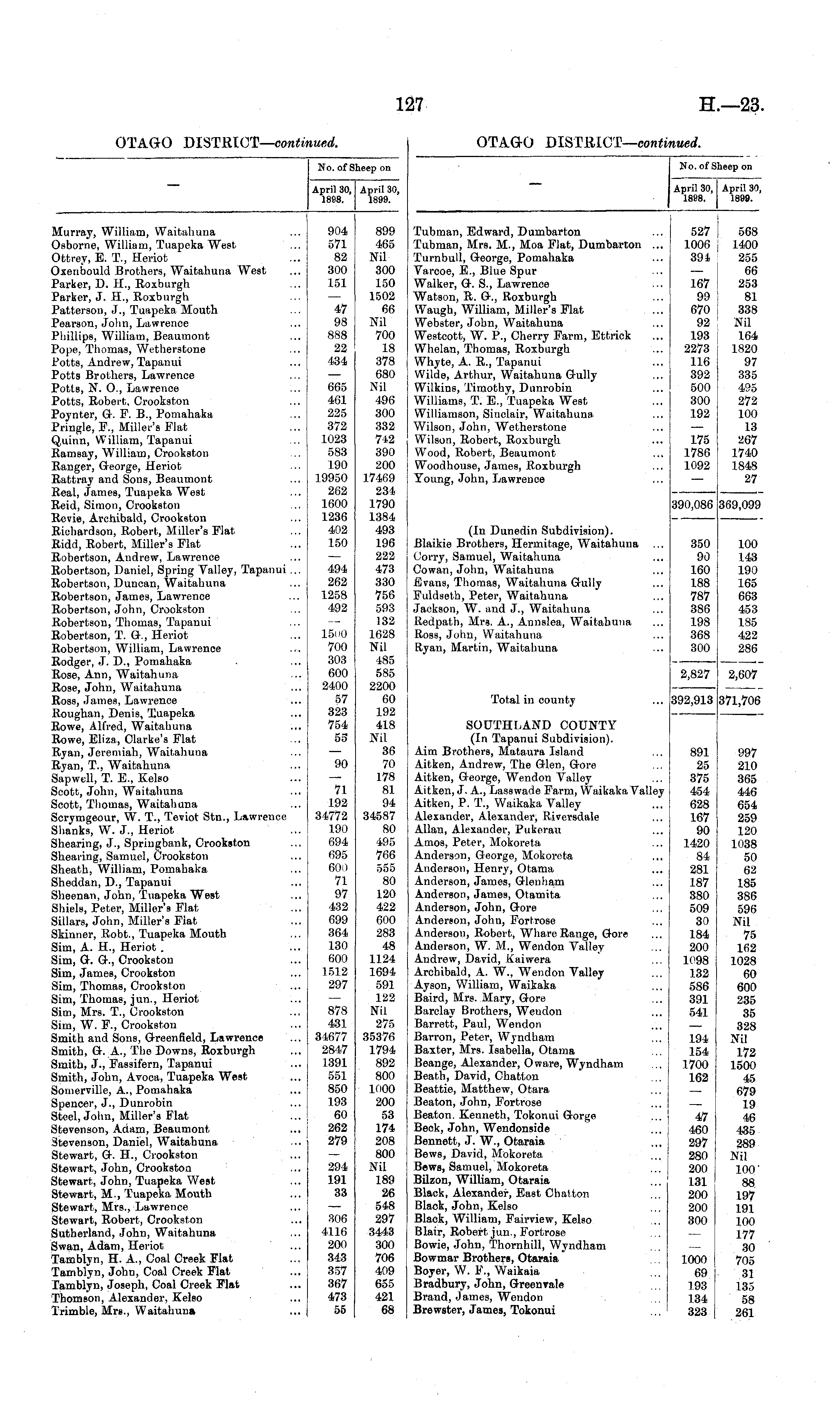 No. of Sheep on April 30, April 30, 1898. 1899. Tubman, Edward, Dumbarton Tubman, Mrs. M., Moa Flat, Dumbarton ... Turnbull, George, Pomahaka Vareoe, E., Blue Spur Walker, G. S., Lawrence Watson, R. G., Roxburgh Waugh, William, Miller's Flat Webeter, John, Waitahuna Westcott, W. P., Cherry Farm, Ettriok Whelan, Thomas, Roxburgh Whyte, A. R., Tapanui Wilde, Arthur, Waitahuna Gully Wilkins, Timothy, Dunrobin Williams, T. E., Tuapeka West Williamson, Sinclair, Waitahuna Wilson, John, Wetherstone Wilson, Robert, Roxburgh Wood, Robert, Beaumont Woodhouse, James, Roxburgh Young, John, Lawrence 527 j 1006 ; 391 ! I 568 j 1400 255 66 253 81 338 Nil 164 1820 97 335 495 272 100 13 267 1740 1848 27 167 99 670 92 193 2273 116 392 500 300 192 175 1786 1092 390,086 369,099 (In Dunedin Subdivision). Blaikie Brothers, Hermitage, Waitahuna Oorry, Samuel, Waitahuna Cowan, John, Waitahuna -fivans, Thomas, Waitahuna Gully Fuldeeth, Peter, Waitahuna Jackson, W. and J., Waitahuna Redpath, Mrs. A., Annslea, Waitahuna Ross, John, Waitahuna Ryan, Martin, Waitahuna 350 90 160 188 787 386 198 368 300 100 143 190 165 663 453 185 422 286 Total in county 2,827 392,913 2,607 371,706 SOUTHLAND COUNTY (In Tapanui Subdivision). Aim Brothers, Mataura Island Aitken, Andrew, The Glen, Gore Aitken, George, Wendon Valley Aitken, J. A., Lasswade Farm, Waikaka Valley Aitken, P. T., Waikaka Valley Alexander, Alexander, Riversdale Allan, Alexander, Pukerau Amos, Peter, Mokoreta Anderson, George, Mokoreta Anderson, Henry, Otama Anderson, James, Glenham Anderson, James, Otamita Anderson, John, Gore Anderson, John, Fortrose Anderson, Robert, Whare Range, Gore Anderson, W. M., Wendon Valley Andrew, David, iiaiwera Archibald, A. W., Wendon Valley Ayson, William, Waikaka Baird, Mrs. Mary, Gore Barclay Brothers, Wendon Barrett, Paul, Wendon Barron, Peter, Wyndham Baxter, Mrs. Isabella, Otama Beange, Alexander, Oware, Wyndham Beath, David, Chatton Beattie, Matthew, Otara Beaton, John, Fortrose Beaton. Kenneth, Tokonui Gorge Beek, John, Wendonside Bennett, J. W., Otaraia Bews, David, Mokoreta Bews, Samuel, Mokoreta Bilzon, William, Otaraia Black, Alexander, East Chatton Black, John, Kelso Black, William, Fairview, Kelso Blair, Robert jun., Fortrose Bowie, John, Thornhill, Wyndham Bowmar Brothers, Otaraia Boyer, W. F., Waikaia Bradbury, John, Greenvale Brand, James, Wendon Brewster, James, Tokonui 891 25 375 454 628 167 90 1420 84 281 187 380 509 30 184 200 1098 132 586 391 541 997 210 365 446 654 259 120 1038 50 62 185 386 596 Nil 75 162 1028 60 600 235 35 328 Nil 172 1500 45 679 19 46 435 289 Nil 100' 88 197 191 100 111 30 705 31 135 58 261 194 154 1700 162 47 460 297 280 200 131 200 200 300 1000 69 ! 193 134 323
