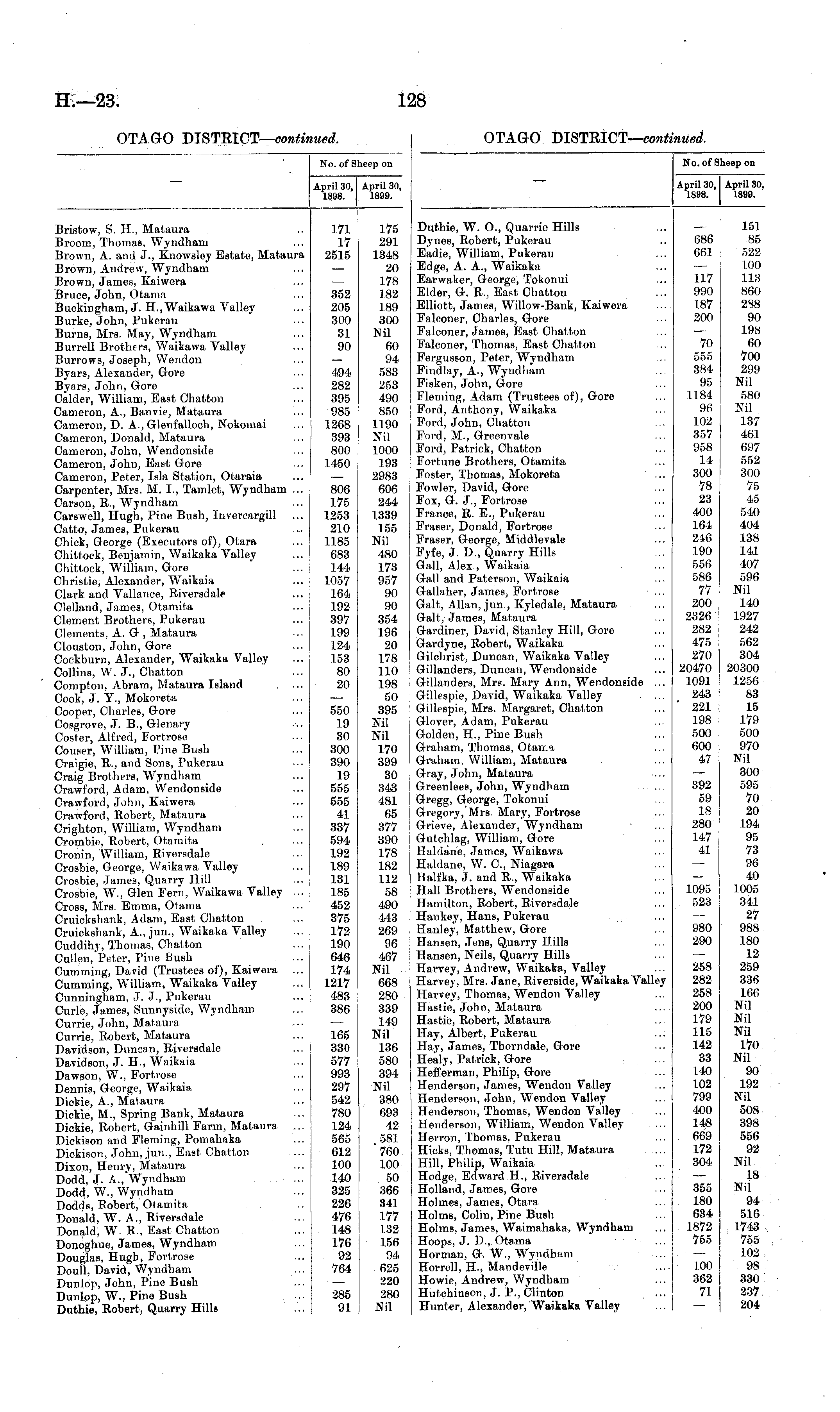 No. of Sheep on April 30, April 30, 1898. 1899. Bristow, S. H., Mataura Broom, Thomas, Wyndham Brown, A. and J., Knowaley Estate, Mataura Brown, Andrew, Wyndham Brown, James, Kaiwera Bruce, John, Otama Buckingham, J. H., Waikawa Valley Burke, John, Pukerau Burns, Mrs. May, Wyndham Burrell Brothers, Waikawa Valley Burrows, Joseph, Wendon Byars, Alexander, Gore Byars, John, Gore Calder, William, East Chatton Cameron, A., Banvie, Mataura Cameron, D. A., Glenfalloch, Nokomai Cameron, Donald, Mataura Cameron, John, Wendonside Cameron, John, East Gore Cameron, Peter, Isla Station, Otaraia Carpenter, Mrs. M. I., Tamlet, Wyndham ... Carson, B., Wyndham Carswell, Hugh, Pine Bush, Invercargill Catta, James, Pukerau Chick, George (Executors of), Otara Chittock, Benjamin, Waikaka Valley Chittock, William, Gore Christie, Alexander, Waikaia Clark and Vallance, Eiversdale Clelland, James, Otamita Clement Brothers, Pukerau Clements, A. G , Mataura Clouston, John, Gore Cockburn, Alexander, Waikaka Valley Collins, W. J., Chatton Compton, Abram, Mataura Island Cook, J. Y., Mokoreta Cooper, Charles, Gore Cosgrove, J. B., Glenary Coster, Alfred, Fortrose Coueer, William, Pine Bush Craigie, E., and Sons, Pukerau Craig Brothers, Wyndham Crawford, Adam, Wendonside Crawford, John, Kaiwera Crawford, Eobert, Mataura Crighton, William, Wyndham Crombie, Eobert, Otamita Cronin, William, Biversdale Crosbie, George, Waikawa Valley Crosbie, James, Quarry Hill Crosbie, W., Glen Fern, Waikawa Valley ... Cross, Mrs. Emma, Otama Cruickshank, Adam, East Chatton Cruickshank, A., jun., Waikaka Valley Cuddihy, Thomas, Chatton Cullen, Peter, Pine Bush Cumming, David (Trustees of), Kaiwera ... Cumming, William, Waikaka Valley Cunningham, J. J., Pukerau Curie, James, Sunnyside, Wyndham Currie, John, Mataura Currie, Robert, Mataura Davidson, Duncan, Biversdale Davidson, J. H., Waikaia Dawson, W., Fortrose Dennis, George, Waikaia Dickie, A., Mataura Dickie, M., Spring Bank, Mataura Dickie, Eobert, Gainhill Farm, Mataura Dickieon and Fleming, Pomahaka Dickison, John, jun., East Chatton Dixon, Henry, Mataura Dodd, J. A., Wyndham . . ... Dodd, W., Wyndham Dodds, Eobert, Otamita Donald, W. A., Eiversdale Donald, W. B., East Chatton Donoghue, James, Wyndham Douglas, Hugh, Fortrose Doull, David, Wyndham Dunlop, John, Pine Bush Dunlop, W., Pine Bush Duthie, Robert, Quarry Hills 171 17 2515 352 205 300 31 90 494 282 395 985 1268 393 800 1450 806 175 1253 210 1185 683 144 1057 164 192 397 199 124 153 80 20 550 19 30 300 390 19 555 555 41 337 594 192 189 131 185 452 375 172 190 646 174 1217 483 386 175 291 1348 20 178 182 189 300 Nil 60 94 583 253 490 850 1190 Nil 1000 193 2983 606 244 1339 155 Nil 480 173 957 90 90 354 196 20 178 110 198 50 395 Nil Nil 170 399 30 343 481 65 377 390 178 182 112 58 490 443 269 96 467 Nil 668 280 339 149 Nil 136 580 394 Nil 380 693 42 581 760 100 50 366 341 177 132 156 94 625 220 280 Nil 165 330 577 993 297 542 780 124 565 612 100 140 325 226 476 148 176 92 764 285 91