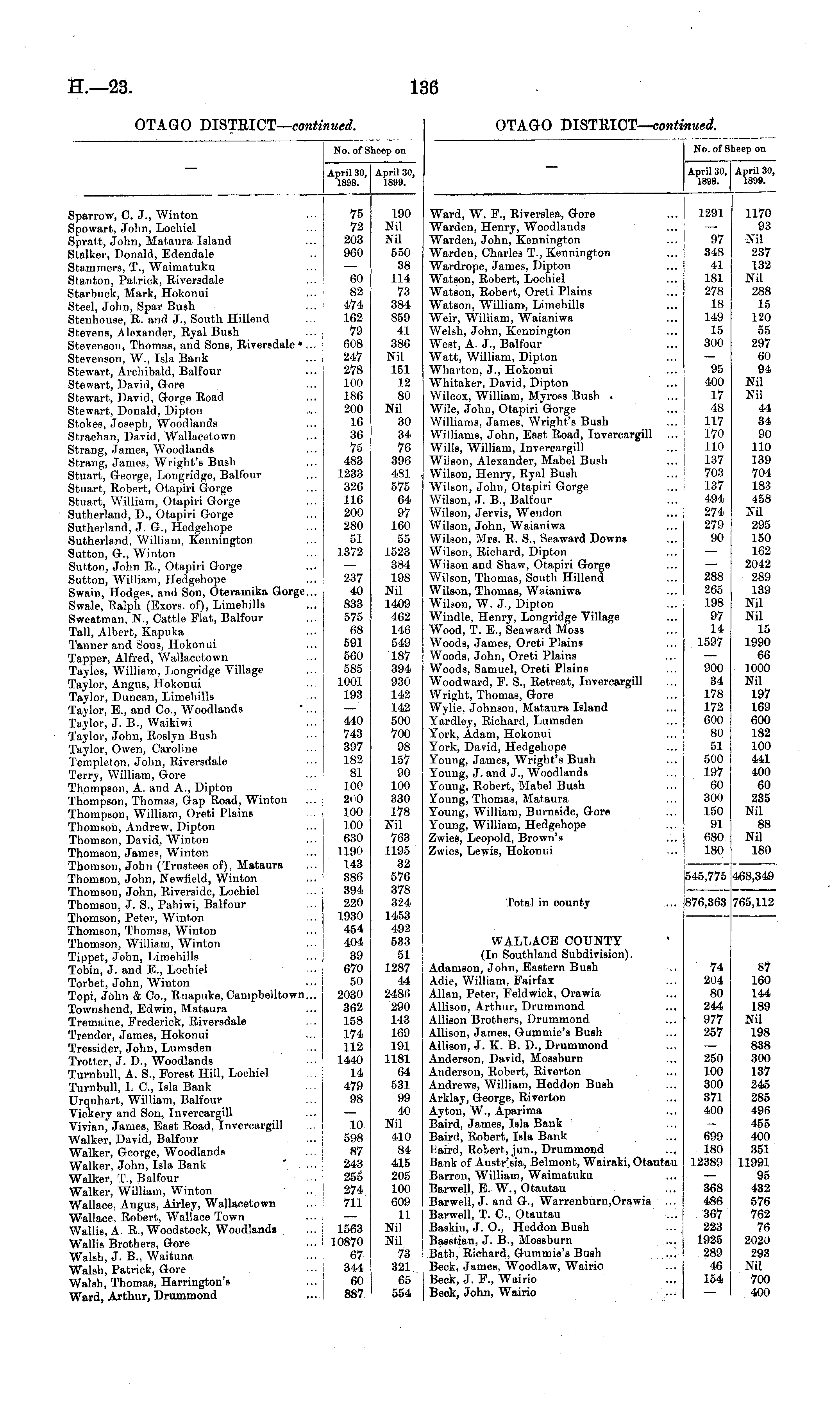 No. of Sheep on April 30, 1898. April 30, 1899. Ward, W. F., Riverslea, Gore Warden, Henry, Woodlands Warden, John, Kennington Warden, Charles T., Kennington Wardrope, James, Dipton Watson, Robert, Lochiel Watson, Robert, Oreli Plains Watson, William, Limehills Weir, William, Waianiwa Welsh, John, Kennington West, A. J., Balfour Watt, William, Dipton Wharton, J., Hokonui Whitaker, David, Dipton Wilcox, William, Myross Bush . Wile, John, Otapiri Gorge Williams, James, Wright's Bush Williams, John, East Road, Invercargill Wills, William, Inrercargill Wilson, Alexander, Mabel Bush Wilson, Henry, Ryal Bush Wilson, John, Otapiri Gorge Wilson, J. B., Balfour Wilson, Jervis, Wendon Wilson, John, Waianiwa Wilson, Mrs. R. S., Seaward Downs Wilson, Richard, Dipton Wilson and Shaw, Otapiri Gorge Wilson, Thomas, South Hillend Wilson, Thomas, Waianiwa Wilson, W. J., Dipton Windle, Henry, Longridge Village Wood, T. E., Seaward Moss Woods, James, Oreti Plains Woods, John, Oreti Plains Woods, Samuel, Oreti Plains Woodward, F. S., Retreat, Invercargill Wright, Thomas, Gore Wylie, Johnson, Mataura Island Yardley, Richard, Lumsden York, Adam, Hokonui York, David, Hedgehope Young, James, Wright's Bush Young, J. and J., Woodlands Young, Robert, Mabel Bush Young, Thomas, Mataura Young, William, Burnside, Gore Young, William, Hedgehope Zwies, Leopold, Brown's Zwies, Lewis, Hokonui I 1291 1170 93 Nil 237 132 Nil 288 15 120 55 297 60 94 Nil Nil 44 34 90 110 139 704 183 458 Nil 295 150 162 2042 289 139 Nil Nil 15 1990 66 1000 Nil 197 169 600 182 100 441 400 60 235 Nil 88 Nil 180 97 348 41 181 278 18 149 15 300 95 400 17 48 117 170 110 137 703 137 494 274 279 90 288 265 198 97 14 1597 900 34 178 172 600 80 51 500 197 60 300 150 91 680 180 545,775 468,349 Total in county 876,363 765,112 WALLACE COUNTY (In Southland Subdivision). Adamson, John, Eastern Bush Adie, William, Fairfax Allan, Peter, Feldwick, Orawia Allison, Arthur, Drummond Allison Brothers, Drummond Allison, James, Gummie's Bush Allison, J. K. B. D., Drummond Anderson, David, Mossburn Anderson, Robert, Riverton Andrews, William, Heddon Bush Arklay, George, Riverton Ayton, W., Aparima Baird, James, Isla Bank Baird, Robert, Isla Bank Haird, Robert, jun., Drummond Bank of Austr'sia, Belmont, Wairaki, Otautau Barron, William, Waimatuku Barwell, E. W., Otautau Barwell. J. and G., Warrenburn,Orawia Barwellj T. C, Otautau Baekin, J. O., Heddon Bush Basstian, J. B., Mossburn Bath, Richard, Gummie's Bush ... Beck, James, Woodlaw, Wairio Beck, J. F., Wairio Beck, John, Wairio 74 204 80 244 977 257 250 100 300 371 400 87 160 144 189 Nil 198 838 300 137 245 285 496 455 400 351 11991 95 432 576 762 76 2020 293 Nil 700 400 699 180 12389 368 486 367 223 1925 289 46 154