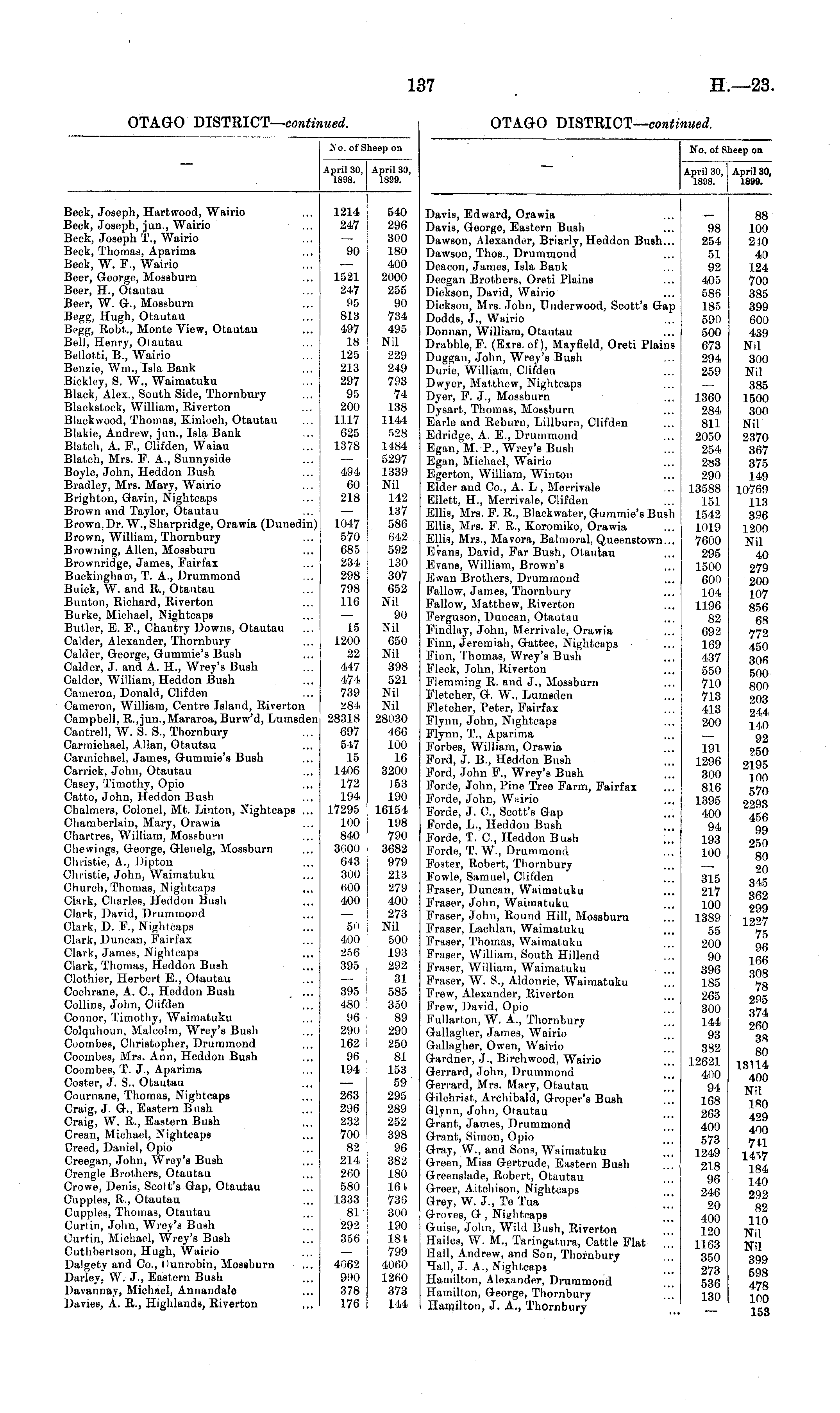 No. of Sheep on April 30, 1898. April 30, 1899. Davis, Edward, Orawia Davis, George, Eastern Bueli Dawson, Alexander, Briarly, Heddon Bush... Daweon, Thos., Drummond Deacon, James, Isla Bank Deegan Brothers, Oreti Plains Dickson, David, Wairio Dickson, Mrs. John, TTnderwood, Scott's Gap Dodds, J., Wairio Donnan, William, Otautau Drabble, P. (Exrs. of), Mayfield, Oreti Plains Duggan, John, Wrey's Bush Durie, William, Clifden Dwyer, Matthew, Nightcaps Dyer, F. J., Mossburn Dysart, Thomas, Mossburn Earle and Reburn, Lillburn, Clifden Edridge, A. E., Drummond Bgan, M. P., Wrey's Bush Egan, Michael, Wairio Egerton, William, Winton Elder and Co., A. L., Merrivale Ellett, H., Merrivale, Clifden Ellie, Mrs. P. R., Blackwater, Gummie's Bush Ellis, Mrs. P. R., Koromiko, Orawia Ellis, Mrs., Mavora, Balmoral, Queenstown... Evans, David, Far Bush, Otautau Evans, William, Brown's Ewan Brothers, Drummond Fallow, James, Thornbury Fallow, Matthew, Riverton Ferguson, Duncan, Otautau Findlay, John, Merrivale, Orawia Finn, Jeremiah, Gattee, Nightcaps Finn, Thomas, Wrey's Bush Fleck, John, Riverton Plemming R. and J., Mossburn Fletcher, G. W., Lumsden Fletcher, Peter, Fairfax Flynn, John, Nightcaps Flynn, T., Aparima Forbes, William, Orawia Ford, J. B., Heddon Bush Ford, John P., Wrey'e Bush Forde, John, Pine Tree Farm, Fairfax Porde, John, Wairio Forde, J. C, Scott's Gap Forde, L., Heddon Bush Forde, T. C, Heddon Bush „. Forde, T. W., Drummond Foster, Robert, Thornbury Fowle, Samuel, Clifden Fraser, Duncan, Waimatuku Fraser, John, Waimatuku Praser, John, Round Hill, Mossburn Praser, Lachlan, Waimatuku Fraser, Thomas, Waimatuku Fraser, William, South Hillend Fraser, William, Waimatuku Fraser, "W. S., Aldonrie, Waimatuku Frew, Alexander, Riverton Frew, David, Opio Fullarton, W. A., Thornbury ... Gallagher, James, Wairio Gallagher, Owen, Wairio Gardner, J., Birchwood, Wairio Gerrard, John, Drummond Gerrard, Mrs. Mary, Otautau Gilchrist, Archibald, Groper's Bush Glynn, John, Otautau Grant, James, Drummond Grant, Simon, Opio Gray, W., and Sons, Wrtimatuku Green, Miss Gertrude, Eastern Bush Greenslade, Robert, Otautau Greer, Aitehison, Nightcaps Grey, W. J., Te Tua [" Groves, G , Nishtcaps Guise, John, Wild Bush, Riverton Hailes, W. M., Taringatura, Cattle Flat Hall, Andrew, and Son, Thornbury Hall, J. A., Nightcaps Hamilton, Alexander, Drummond Hamilton, George, Thornbury Hamilton, J. A., Thornbury 98 254 51 92 405 586 185 590 500 673 294 259 1360 284 811 2050 254 283 290 13588 151 1542 1019 7600 295 1500 600 104 1196 82 692 169 437 550 710 713 413 200 191 1296 300 816 1395 400 94 193 100 88 100 210 40 124 700 385 399 600 439 Nil 300 Nil 385 1500 300 Nil 2370 367 375 149 10769 113 396 1200 Nil 40 279 200 107 856 68 772 450 306 500 800 203 244 140 92 s>50 2195 100 570 2293 456 99 250 80 20 345 362 299 1227 75 96 166 308 78 295 374 260 38 80 13U4 400 Nil 180 429 400 HI 14.V7 184 140 292 82 110 Nil Nil 399 598 478 100 153 315 217 100 1389 55 200 90 396 185 265 300 144 93 382 12621 400 94 168 263 400 573 1249 218 96 246 20 400 120 1163 350 273 536 130
