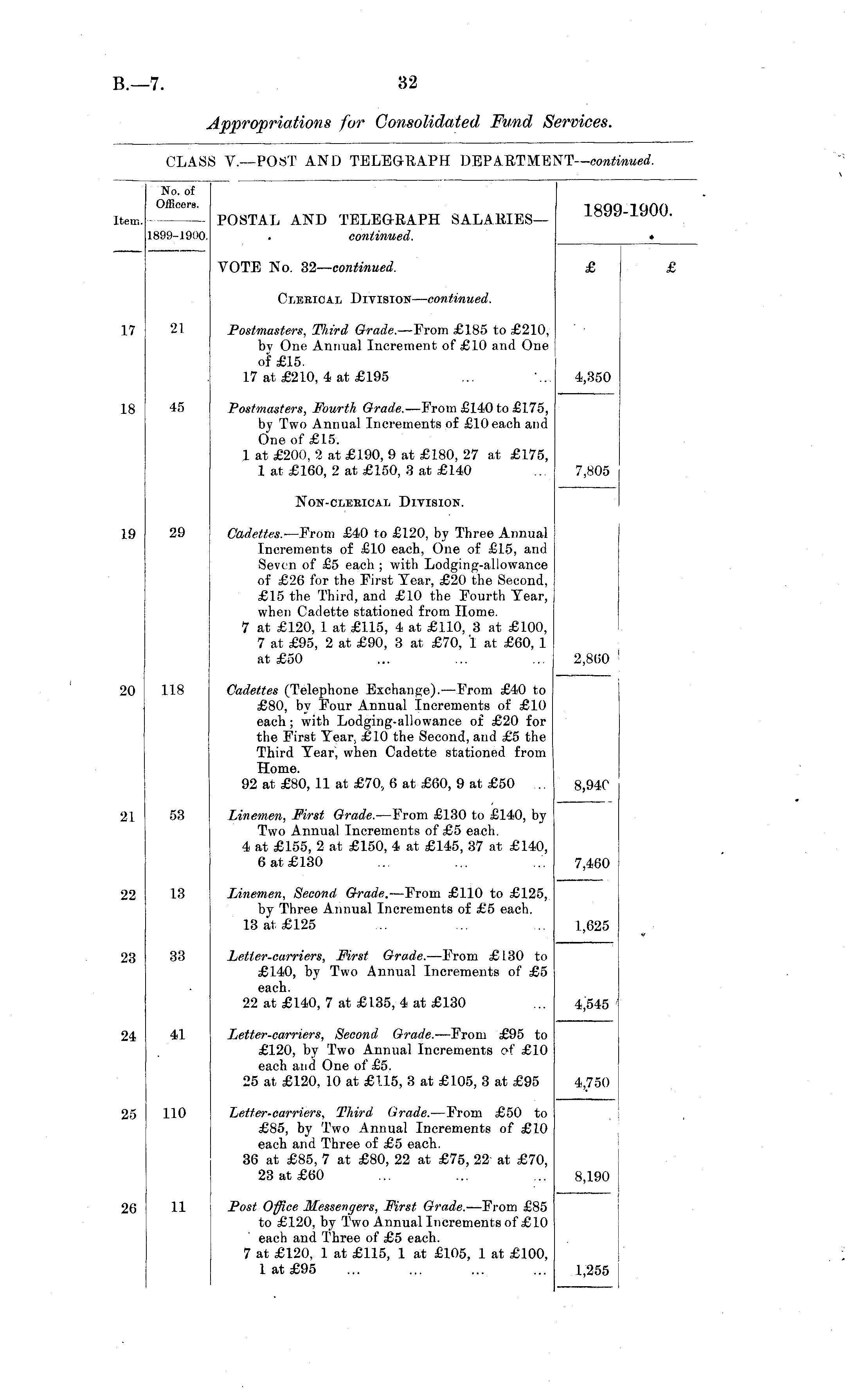 No. of Officers. POSTAL AND TELEGBAPH SALARIES— continued. 189 1-1900. Item. 1899-1900. * VOTE No. 32— continued. £ Clerical Division — continued. 17 21 Postmasters, Third Grade. —From £185 to £210, bv One Annual Increment of £10 and One of £15. 17 at £210, 4 at £195 4,350 18 45 Postmasters, Fourth Grade. —From £140 to £175, by Two Annual Increments of £10 each and One of £15. 1 at £200, 2 at £190, 9 at £180, 27 at £175, 1 at £160, 2 at £150, 3 at £140 7,805 Non-clerical Division. 19 29 Cadettes.— From £40 to £120, by Three Annual Increments of £10 each, One of £15, and Seven of £5 each ; with Lodging-allowance of £26 for the First Year, £20 the Second, £15 the Third, and £10 the Fourth Year, when Cadette stationed from Home. 7 at £120, 1 at £115, 4 at £110, 3 at £100, 7 at £95, 2 at £90, 3 at £70, 1 at £60, 1 at £50 2,860 20 118 Cadettes (Telephone Exchange).—From £40 to £80, by Four Annual Increments of £10 each; with Lodging-allowance of £20 for the First Year. £l0 the Second, and £5 the Third Year, when Cadette stationed from Home. 92 at £80, 11 at £70, 6 at £60, 9 at £50 ... 8,940 21 53 Linemen, First Grade. —From £130 to £140, by Two Annual Increments of £5 each. 4 at £155, 2 at £150, 4 at £145, 37 at £140, 6 at £130 7,460 22 13 Linemen, Second Grade. —From £110 to £125, by Three Annual Increments of £5 each. 13 at £125 1,625 33 Letter-carriers, First Grade. —From £ 130 to £140, by Two Annual Increments of £5 each. 22 at £140, 7 at £135, 4 at £130 23 4,545 41 Letter-carriers, Second Grade. —From £95 to £120, by Two Annual Increments of £10 each and One of £5. 25 at £120, 10 at £115, 3 at £105, 3 at £95 24 4,750 25 110 Letter-carriers, Third Grade. — From £50 to £85, by Two Annual Increments of £10 each and Three of £5 each. 36 at £85, 7 at £80, 22 at £75, 22 at £70, 23 at £60 8,190 26 11 Post Office Messengers, First, Grade. —From £85 to £120, by Two Annual Increments of £10 each and Three of £5 each. 7 at £120, 1 at £115, 1 at £105, 1 at £100, lat£95