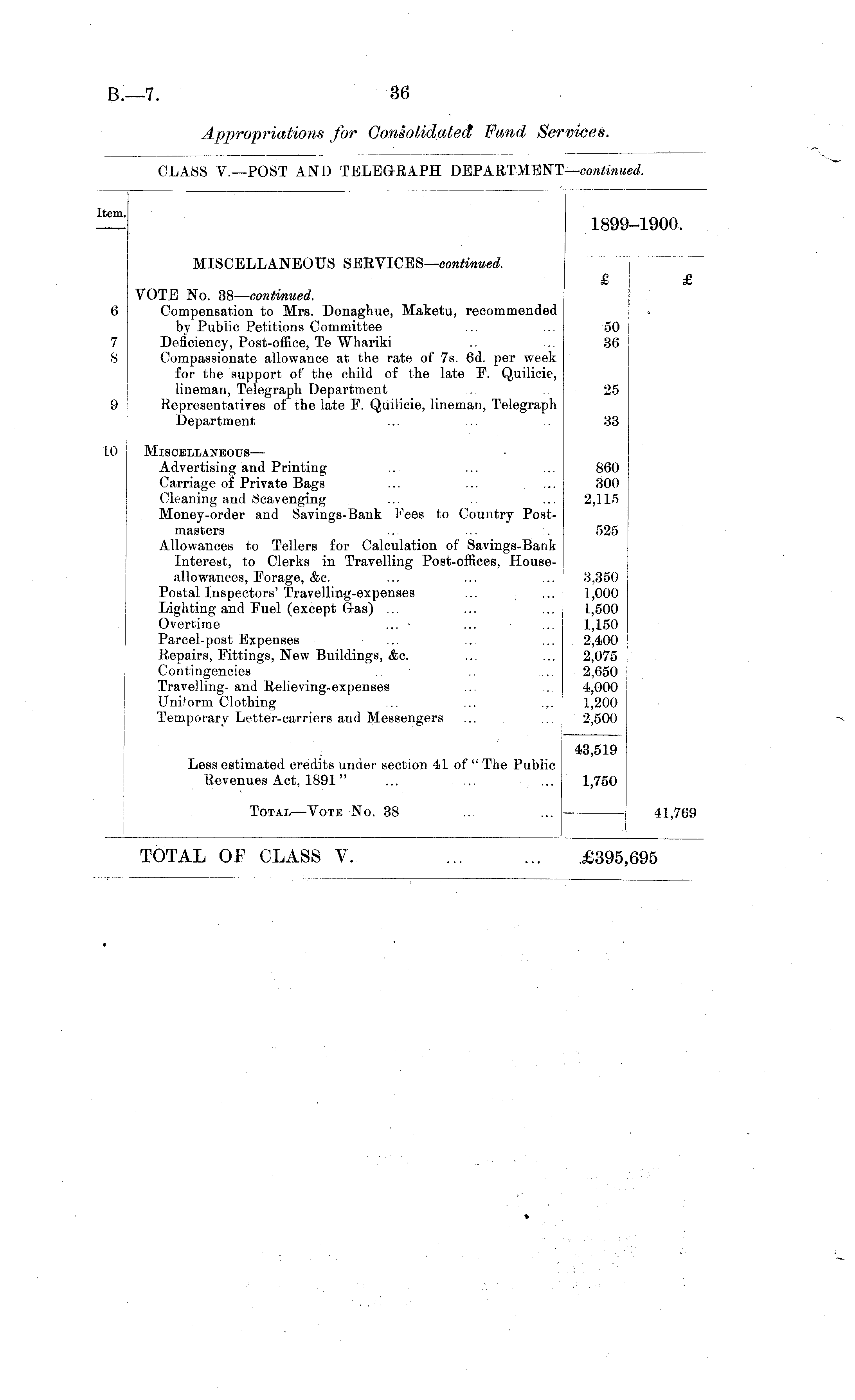 tern. 1899-1900. MISCELLANEOUS SERVICES— continued. £ i £ 6 7 8 VOTE No. 38— continued. Compensation to Mrs. Donaghue, Maketu, recommended by Public Petitions Committee Deficiency, Post-office, Te Whariki Compassionate allowance at the rate of 7s. 6d. per week for the support of the child of the late F. Quilicie, lineman, Telegraph Department Representatives of the late F. Quilicie, lineman, Telegraph Department 50 36 25 33 10 Miscellaneous— Advertising and Printing Carriage of Private Bags ... ... ... Cleaning and Scavenging Money-order and Savings-Bank Fees to Country Postmasters Allowances to Tellers for Calculation of Savings-Bank Interest, to Clerks in Travelling Post-offices, Houseallowances, Forage, &c. Postal Inspectors' Travelling-expenses Lighting and Fuel (except Gas) ... Overtime ... - Parcel-post Expenses Repairs, Fittings, New Buildings, &c. Contingencies Travelling- and Believing-expenses Uniform Clothing Temporary Letter-carriers aud Messengers 860 300 2,115 525 3,350 1,000 1,500 1,150 2,400 2,075 2,650 4,000 1,200 2,500 Less estimated credits under section 41 of " The Public Eevenues Act, 1891" ... ... ... 43,519 1,750 Total—Vote No. 38 41.7* 41,76: fif TOTAL OF CLASS V. £395 695