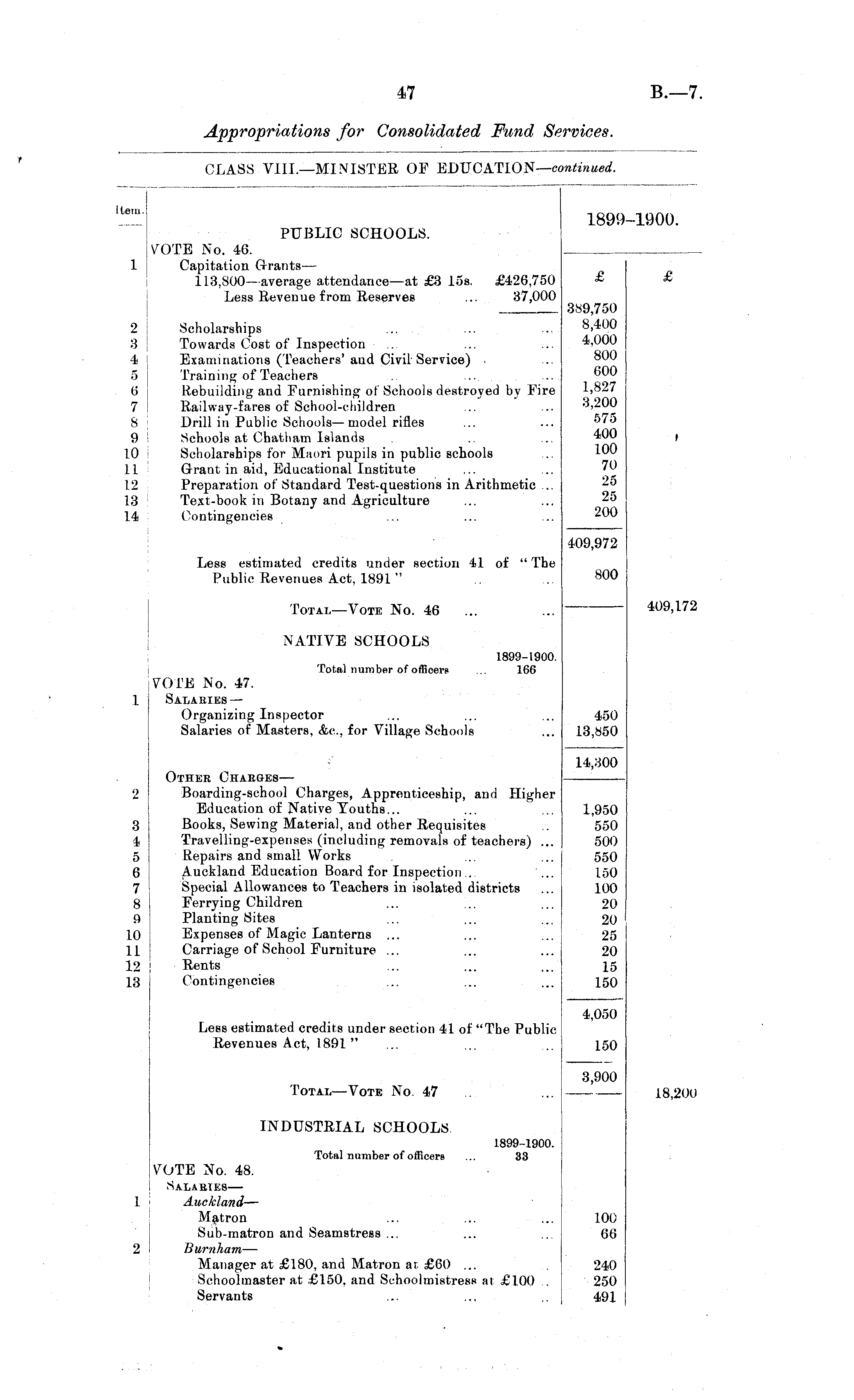 Item. 1899-1900. PUBLIC SCHOOLS. VOTE No. 46. Capitation Grants — 113,800—average attendance—at £3 15s. £426,750 Less Eevenue from Eeserves ... 37,000 £ 2 3 4 5 6 7 8 9 10 11 12 13 14 Scholarships ... Towards Cost of Inspection ■ ... Examinations (Teachers' and Civil Service) Training of Teachers ... .... ... Rebuilding and Furnishing of Schools destroyed by Fire Railway-fares of School-children Drill in Public Schools —model rifles Schools at Chatham Islands Scholarships for Maori pupils in public schools Grant in aid, Educational Institute Preparation of Standard Test-questions in Arithmetic ... Text-book in Botany and Agriculture Contingencies 389,750 8,400 4,000 800 600 1,827 3,200 575 400 100 70 25 25 200 409,972 Less estimated credits under section 41 of " The Public Eevenues Act, 1891 " 800 Total —Vote No. 46 409,17: NATIVE SCHOOLS 1899-1900. Total number of officers ... 166 VOTE No. 47. Salaries — Organizing Inspector Salaries of Masters, &c, for Village Schools 450 13,850 14,300 2 3 4 5 6 7 8 1) 10 11 12 13 Other Charges— Boarding-school Charges, Apprenticeship, and Higher Education of Native Youths... Books, Sewing Material, and other Eequisites Travelling-expenses (including removals of teachers) ... Repairs and small Works Auckland Education Board for Inspection... ... Special Allowances to Teachers in isolated districts Ferrying Children Planting Sites Expenses of Magic Lanterns ... Carriage of School Furniture ... Bents Contingencies 1,950 550 500 550 150 100 20 20 25 20 15 150 Less estimated credits under section 41 of "The Public Eevenues Act, 1891" 4,050 150 Total—Vote No. 47 3,900 18,20i INDUSTRIAL SCHOOLS 1899-1900. Total number of officers ... 33 VOTE No. 48. Salaries— Auckland — Matron Sub-matron and Seamstress ... Burnham — Manager at £180, and Matron at £60 ... Schoolmaster at £150, and Schoolmistress at £100 . Servants 100 66 240 250 491