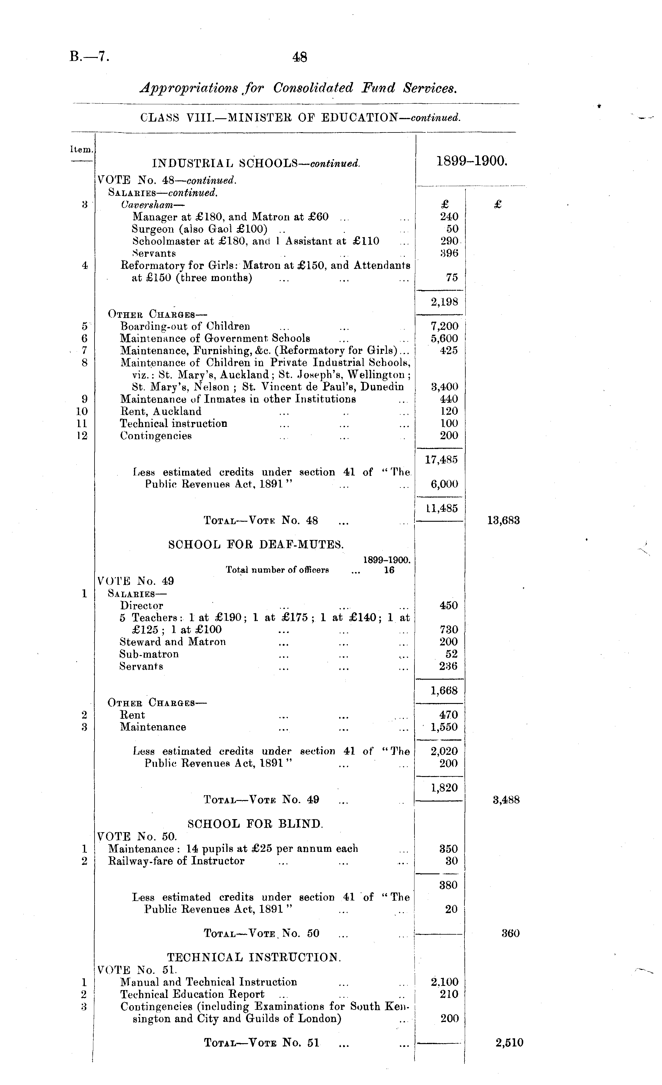 tern. INDUSTBIAL SCHOOLS— continued. 1899-1900. 3 VOTE No. 48— continued. Salaries — continued. Caversham — Manager at £ 180, and Matron at £60 . Surgeon (also Gaol £100) .. Schoolmaster at £180, and 1 Assistant at £110 Servants Eeformatory for Girls: Matron at £150, and Attendants at £150 (three months) £ £ 240 50 290 396 75 Other Charges— Boarding-out of Children Maintenance of Government Schools Maintenance, Furnishing,&c. (Eeformatory for Girls)... Maintenance of Children in Private Industrial Schools, viz.: St. Mary's, Auckland; St. Joseph's, Wellington ; St. Mary's, Nelson ; St. Vincent de Paul's, Dunedin Maintenance of Inmates in other Institutions Bent, Auckland Technical instruction Contingencies 2,198 5 6 7 8 7,200 5,600 425 9 10 11 12 3,400 440 120 100 200 Less estimated credits under section 41 of " The Public Eevenues Act, 1891 " 17,485 6,000 Total—Vote No. 48 LI,485 13.6! 13,683 SCHOOL FOE DEAF-MUTES. 1899-1900. Total number of officers ... 16 VOTE No. 49 Salaries — Director 5 Teachers: 1 at £190; 1 at £175 ; 1 at £140; 1 at £125; 1 at £100 Steward and Matron Sub-matron Servants 450 730 200 52 236 Other Charges— Eent Maintenance 1,668 470 1,550 2 3 Less estimated credits under section 41 of " The Public B,evenues Act, 1891 " 2,020 200 1,820 Total—Vote No. 49 3,488 SCHOOL FOE BLIND. 1 2 VOTE No. 50. Maintenance: 14 pupils at £25 per annum each Bail way-fare of Instructor 350 30 Less estimated credits under section 41 of " The Public Eevenues Act, 1891 " 380 20 Total—Vote. No. 50 360 1 2 3 TECHNICAL INSTEUCTION. VOTE No. 51. Manual and Technical Instruction Technical Education Eeport Contingencies (including Examinations for South Kensington and City and Guilds of London) 2.100 210 200