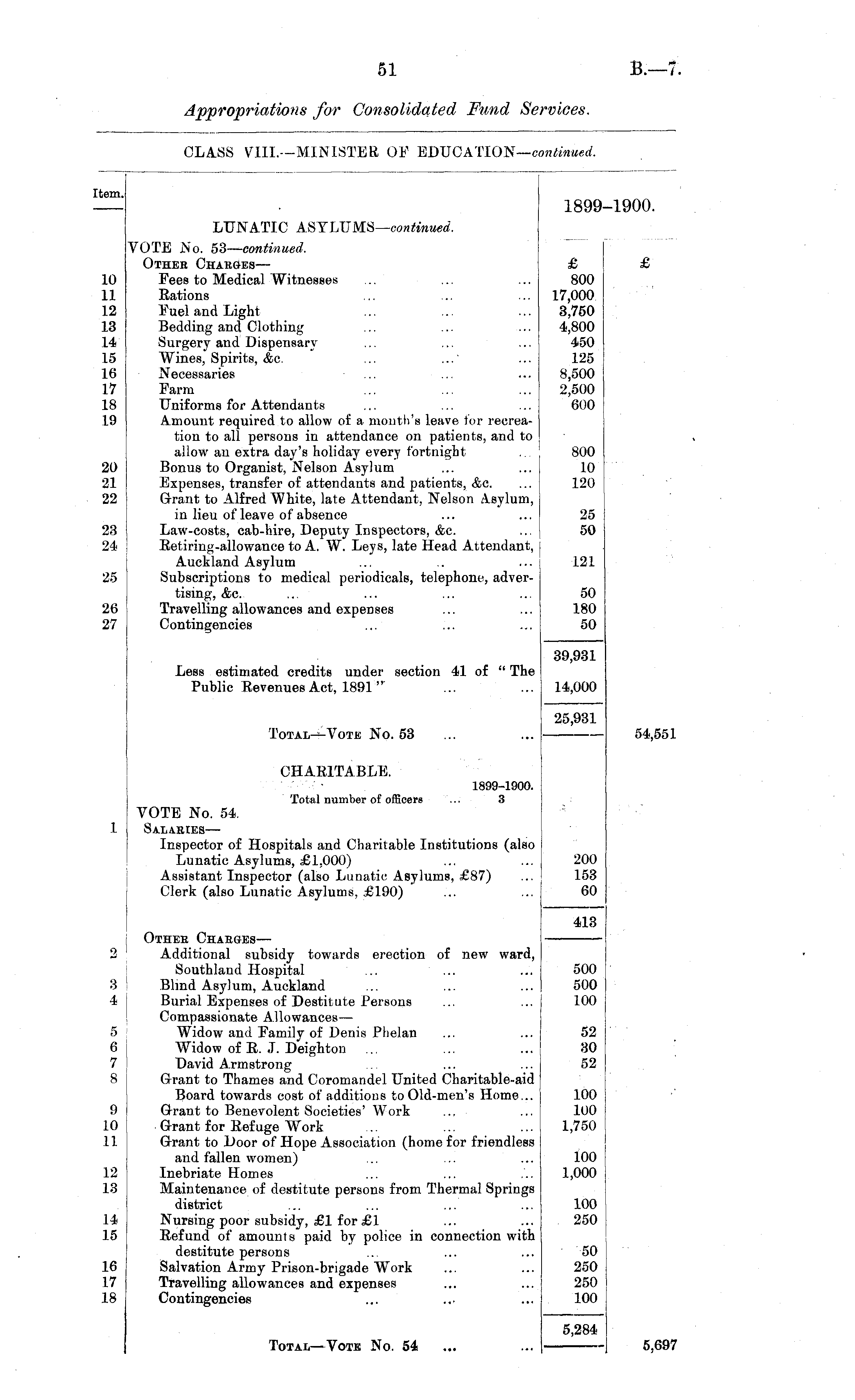 Item. 1899-1900. LUNATIC ASYLUMS—continued. 10 11 12 13 14 15 16 17 18 19 VOTE No. 53 — continued. Other Charges— Fees to Medical Witnesses Bations Fuel and Light Bedding and Clothing Surgery and Dispensary Wines, Spirits, &c. Necessaries Farm Uniforms for Attendants Amount required to allow of a month's leave tor recreation to all persons in attendance on patients, and to allow an extra day's holiday every fortnight Bonus to Organist, Nelson Asylum Expenses, transfer of attendants and patients, &c. Grant to Alfred White, late Attendant, Nelson Asylum, in lieu of leave of absence Law-costs, cab-hire, Deputy Inspectors, &c. Betiring-allowance to A. W. Leys, late Head Attendant, Auckland Asylum Subscriptions to medical periodicals, telephone, advertising, &c. Travelling allowances and expenses Contingencies £ £ 800 17,000 3,750 4,800 450 125 8,500 2,500 600 800 10 120 20 21 22 23 24 25 50 25 121 26 27 50 180 50 Less estimated credits under section 41 of " The Public Eevenues Act, 1891"" 39,931 14,000 Total—Vote No. 53 25,931 54,551 54.5J CHAE1TABLE. 1899-1900. Total number of officers ... 3 VOTE No. 54. Salaries — Inspector of Hospitals and Charitable Institutions (also Lunatic Asylums, £1,000) Assistant Inspector (also Lunatic Asylums, £87) Clerk (also Lunatic Asylums, £190) 200 153 60 Other Charges— Additional subsidy towards erection of new ward, Southland Hospital Blind Asylum, Auckland Burial Expenses of Destitute Persons Compassionate Allowances — Widow and Family of Denis Phelan Widow of E. J. Deighton David Armstrong Grant to Thames and Coromandel United Charitable-aid Board towards cost of additions to Old-men's Home... Grant to Benevolent Societies' Work .., Grant for Eefuge Work Grant to Door of Hope Association (home for friendless and fallen women) Inebriate Homes Maintenance of destitute persons from Thermal Springs district Nursing poor subsidy, £1 for £1 Befund of amounts paid by police in connection with destitute persons Salvation Army Prison-brigade Work Travelling allowances and expenses Contingencies 413 2 500 500 100 3 4 5 6 7 8 52 30 52 9 10 11 100 100 1,750 12 13 100 1,000 14 15 100 250 16 17 1.8 50 250 250 100 Total —Vote No. 54 5,284 5,69'