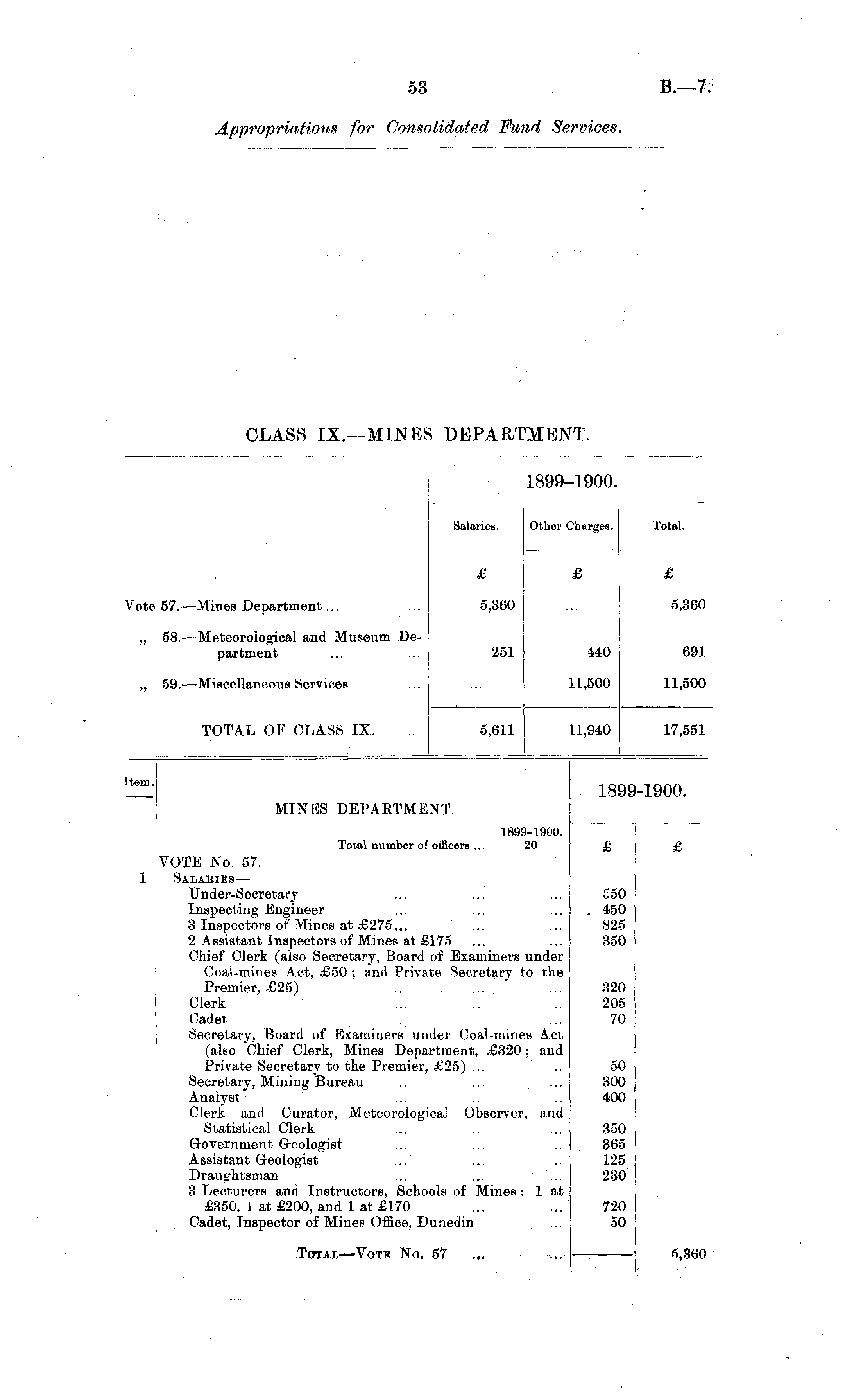 1899-1900. Salaries. Other Charges. Total. £ £ £ ote 57.—Mines Department... 5,360 5,360 „ 58. —Meteorological and Museum Department 251 440 691 „ 59. —Miscellaneous Services 11,500 11,500 TOTAL OF CLASS IX. 5,611 11,940 17,551 Item. 18 '9-1900. MINES DEPABTMENT. 1899-1900. Total number of officers ... 20 VOTE No. 57. Salaries— Under-Secretary Inspecting Engineer 3 Inspectors of Mines at £275... 2 Assistant Inspectors of Mines at £175 Chief Clerk (also Secretary, Board of Examiners under Coal-mines Act. £50 ; and Private Secretary to the Premier, £25) Clerk Cadet Secretary, Board of Examiners under Coal-mines Act (also Chief Clerk, Mines Department, £320; and Private Secretary to the Premier, £25) ... Secretary, Mining Bureau ... ... Analyst Clerk and Curator, Meteorological Observer, and Statistical Clerk Government Geologist Assistant Geologist Draughtsman 3 Lecturers and Instructors, Schools of Mines : 1 at £350, 1 at £200, and 1 at £170 Cadet, Inspector of Mines Office, Dunedin £ 550 . 450 825 350 320 205 70 50 300 400 350 365 125 230 720 50 Total—Vote No. 57 5,860