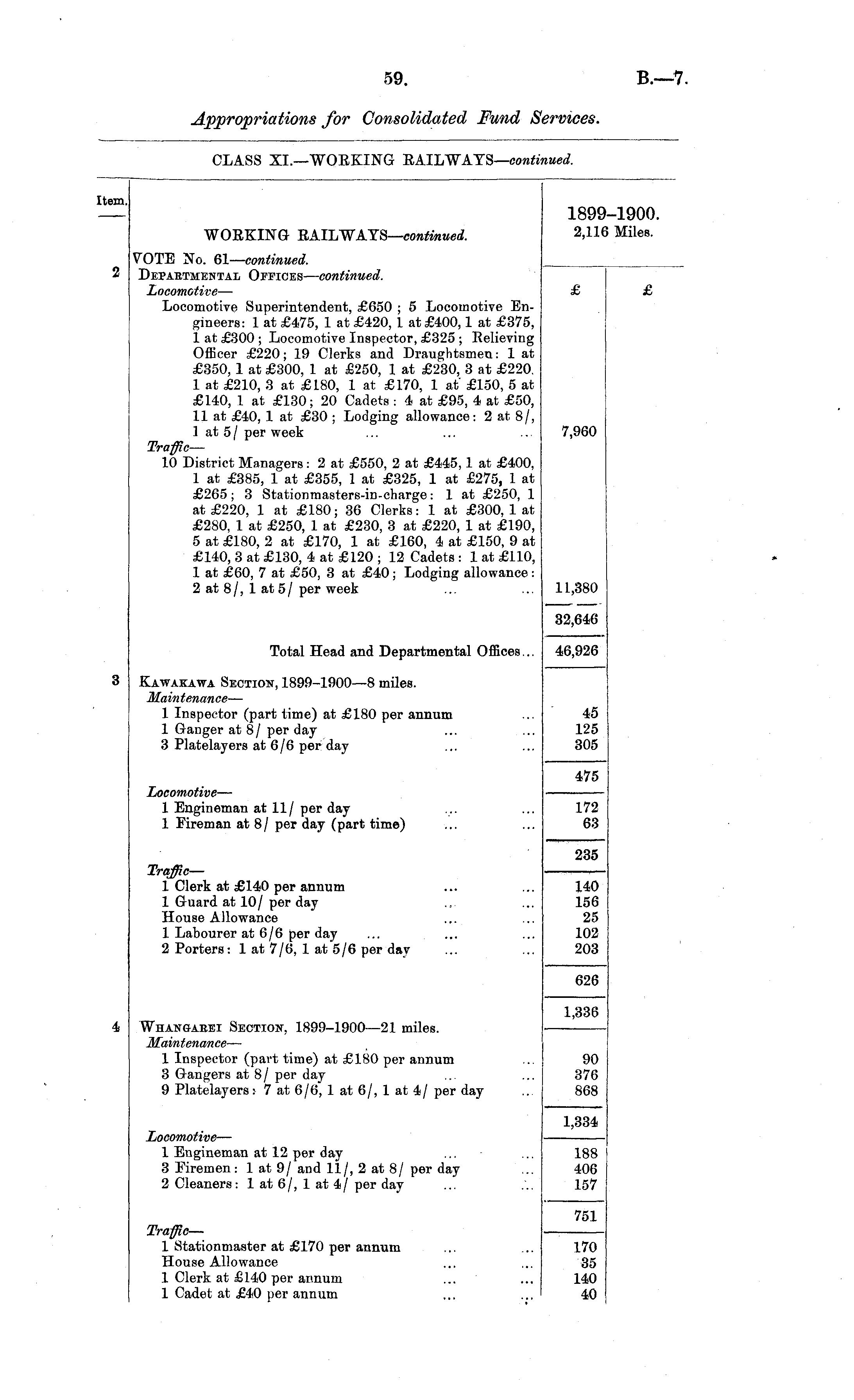 Item. 1899 2,116 -1900. Miles. WOEKING RAILWAYS— continued. VOTE No. 61— continued. Departmental Offices— continued. Locomotive — Locomotive Superintendent, £650 ; 5 Locomotive Engineers: 1 at £475, 1 at £420, 1 at £400,1 at £375, 1 at £300 ; Locomotive Inspector, £325 ; Believing Officer £220; 19 Clerks and Draughtsmen: 1 at £350, 1 at £300, 1 at £250, 1 at £230, 3 at £220. I at £210, 3 at £180, 1 at £170, 1 at £150, 5 at £140, 1 at £130; 20 Cadets : 4 at £95, 4 at £50, II at £40, 1 at £30 ; Lodging allowance: 2 at 8/, 1 at 5 / per week 7,960 Traffic— 10 District Managers: 2 at £550, 2 at £445,1 at £400, 1 at £385, 1 at £355, 1 at £325, 1 at £275, 1 at £265; 3 Stationmasters-in-charge: 1 at £250, 1 at £220, 1 at £180; 36 Clerks: 1 at £300, 1 at £280, 1 at £250, 1 at £230, 3 at £220, 1 at £190, 5 at £180, 2 at £170, 1 at £160, 4 at £150, 9 at £140, 3 at £130, 4 at £120 ; 12 Cadets : 1 at £110, 1 at £60, 7 at £50, 3 at £40; Lodging allowance: 2 at 8/, 1 at 5/ per week Total Head and Departmental Offices... 11,380 32,646 # 46,926 Kawakawa Section, 1899-1900 —8 miles. Maintenance — 1 Inspector (part time) at £180 per annum 1 Ganger at 8/ per day 3 Platelayers at 6/6 per day 45 125 305 Locomotive — 1 Engineman at 11/ per day 1 Fireman at 8 / per day (part time) 475 172 63 235 Traffic — 1 Clerk at £140 per annum 1 Guard at 10/ per day House Allowance 1 Labourer at 6/6 per day 2 Porters: 1 at 7/6, 1 at 5/6 per day 140 156 25 102 203 626 Whangarei Section, 1899-1900 —21 miles. Maintenance— 1 Inspector (part time) at £180 per annum 3 Gangers at 8/ per day 9 Platelayers: 7 at 6/6, 1 at 6/, 1 at 4/ per day 1,336 90 376 868 Locomotive — 1 Engineman at 12 per day 3 Firemen: 1 at 9/ and 11/, 2 at 8/ per day 2 Cleaners: 1 at 6/, 1 at 4/ per day 1,334 188 406 157 Traffic— 1 Stationmaster at £170 per annum House Allowance 1 Clerk at £140 per annum 1 Cadet at £40 per annum 751 170 35 140 40
