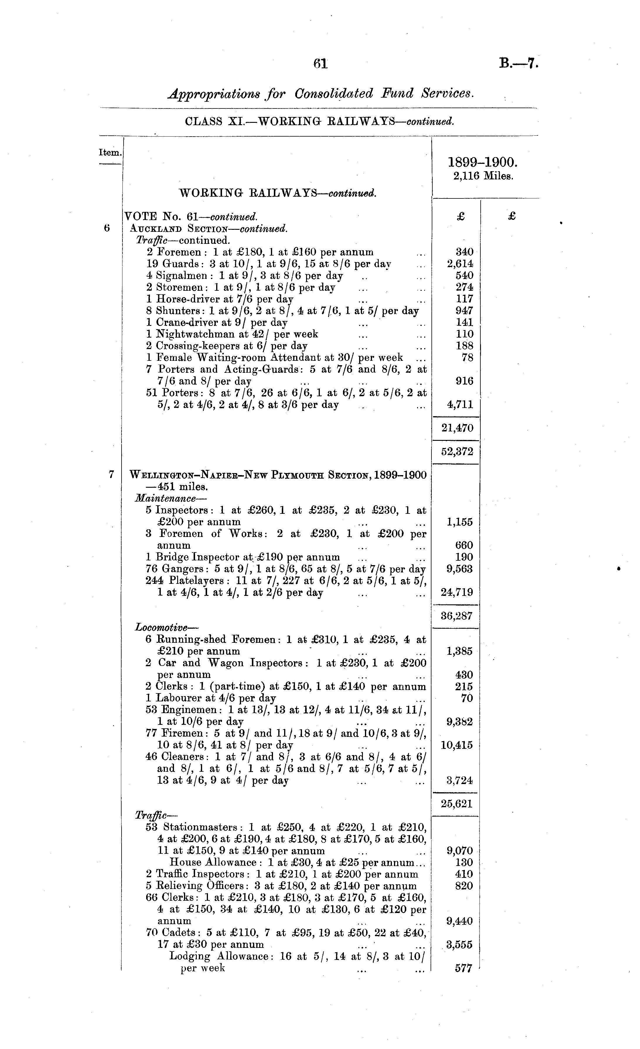 Item. 1899-1900 2,116 Miles. WOBKING EAILWAYS— continued. 6 VOTE No. 61— continued. Auckland Section — continued. Traffic —continued. 2 Foremen : 1 at £180, 1 at £160 per annum 19 Guards: 3 at 10/, 1 at 9/6, 15 at 8/6 per day 4 Signalmen : 1 at 9/, 3 at 8/6 per day 2 Storemen: 1 at 9/, 1 at 8/6 per day 1 Horse-driver at 7/6 per day 8 Shunters: 1 at 9/6, 2 at 8/, 4 at 7/6, 1 at 5/ per day 1 Crane-driver at 9 / per day 1 Nightwatchman at 42/ per week 2 Crossing-keepers at 6/ per day 1 Female Waiting-room Attendant at 30/ per week 7 Porters and Acting-Guards: 5 at 7/6 and 8/6, 2 at 7/6 and 8/per day 51 Porters: 8 at 7/6, 26 at 6/6, 1 at 6/, 2 at 5/6, 2 at 5/, 2 at 4/6, 2 at 4/, 8 at 3/6 per day £ 340 2,614 540 274 117 947 141 110 188 78 916 4,711 21,470 Wellington-Napier-New Plymouth Section, 1899-1900 —451 miles. Maintenance — 5 Inspectors: 1 at £260, 1 at £235, 2 at £230, 1 at £200 per annum 3 Foremen of Works: 2 at £230, 1 at £200 per 52,372 1,155 annum 1 Bridge Inspector at £190 per annum 76 Gangers: 5 at 9/, 1 at 8/6, 65 at 8/, 5 at 7/6 per day 244 Platelayers : 11 at 7/, 227 at 6/6, 2 at 5/6, 1 at 5/, 1 at 4/6, 1 at 4/, 1 at 2/6 per day 660 190 9,563 24,719 Locomotive — 6 Eunning-shed Foremen: 1 at £310, 1 at £235, 4 at £210 per annum 2 Car and Wagon Inspectors : 1 at £230, 1 at £200 36,287 1,385 per annum ... 2 Clerks : 1 (part-time) at £150, 1 at £140 per annum 1 Labourer at 4/6 per day 53 Enginemen: 1 at 13/, 13 at 12/, 4 at 11/6, 34 at 11/, 1 at 10/6 per day 77 Firemen: 5 at 9/ and 11/, 18 at 9/ and 10/6, 3 at 9/, 10 at 8/6, 41 at 8/per day 46 Cleaners: 1 at 7/ and 8/, 3 at 6/6 and 8/, 4 at 6/ and 8/, 1 at 6/, 1 at 5/6 and 8/, 7 at 5/6, 7 at 5/, 13 at 4/6, 9 at 4/per day 430 215 70 9,382 10,415 3,724 Traffic— 53 Stationmasters : 1 at £250, 4 at £220, 1 at £210, 4 at £200, 6 at £190, 4 at £180, 8 at £170, 5 at £160, 11 at £150, 9 at £140 per annum House Allowance : 1 at £30, 4 at £25 per annum... 2 Traffic Inspectors: 1 at £210, 1 at £200 per annum 5 Believing Officers: 3 at £180, 2 at £140 per annum 66 Clerks: 1 at £210, 3 at £180, 3 at £170, 5 at £160, 4 at £150, 34 at £140, 10 at £130, 6 at £120 per 25,621 9,070 130 410 820 annum 70 Cadets: 5 at £110, 7 at £95, 19 at £50, 22 at £40, 17 at £30 per annum ... Lodging Allowance: 16 at 5/, 14 at 8/, 3 at 10/ per week 9,440 3,555 577