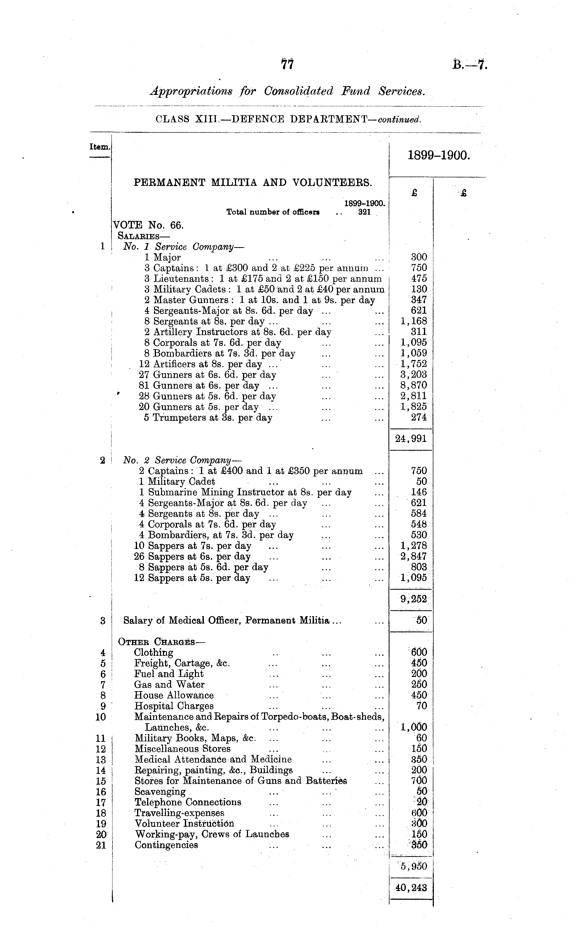 Item.! 1899-1900. PEEMANENT MILITIA AND VOLUNTEERS. 1899-1900. Total number of officers .. 321 VOTE No. 66. Salaries— 1 No. 1 Service Company — 1 Major ... ... .;. 3 Captains : 1 at £300 and 2 at £225 per annum ... 3 Lieutenants : 1 at £175 and 2 at £150 per annum 3 Military Cadets : 1 at £50 and 2 at £40 per annum 2 Master Gunners : 1 at 10s. and 1 at 9s. per day 4 Sergeants-Major at 8s. 6d. per day ... 8 Sergeants at 8s. per day ... 2 Artillery Instructors at 8s. 6d. per day 8 Corporals at 7s. 6d. per day 8 Bombardiers at 7s. 3d. per day 12 Artificers at 8s. per day ..." 27 Gunners at 6s. 6d. per day ... ' 81 Gunners at 6s. per day ... ... ... 28 Gunners at 5s. 6d. per day 20 Gunners at 5s. per day ... 5 Trumpeters at 3s. per day 300 750 475 130 347 621 1,168 311 1,095 1,059 1,752 3,203 8,870 2,811 1,825 274 I 24,991 I ■ 2 I No. 2 Service Company— 2 Captains : 1 at £400 and 1 at £350 per annum ... 1 Military Cadet 1 Submarine Mining Instructor at 8s. per day 4 Sergeants-Major at 8s. 6d. per day 4 Sergeants at 8s. per day ... 4 Corporals at 7s. 6d. per day 4 Bombardiers, at 7s. 3d. per day 10 Sappers at 7s. per day 26 Sappers at 6s. per day 8 Sappers at 5s. 6d. per day 12 Sappers at 5s. per day 750 50 146 621 584 548 530 1,278 2,847 803 1,095 3 Salary of Medical Officer, Permanent Militia ... Other Charges— 4 Clothing 5 ; Freight, Cartage, &c. 6 I Fuel and Light 7 Gas and Water 8 House Allowance ... .... 9 ' Hospital Charges 10 Maintenance and Eepairs of Torpedo-boats, Boat-sheds, Launches, &c. 11 Military Books, Maps, &c. 12 Miscellaneous Stores 13 Medical Attendance and Medicine ... ... 14 Bepairing, painting, &c., Buildings 15 Stores for Maintenance of Guns and Batteries 16 Scavenging ... ..." 17 Telephone Connections 18 Travelling-expenses ... ... ... 19 Volunteer Instruction 20 Working-pay, Crews of Launches 21 Contingencies ... ... ."••■• 9,252 50 600 450 200 250 450 70 1,000 60 150 350 200 700 50 20 600 300 150 350 =as — 5,950 40,243