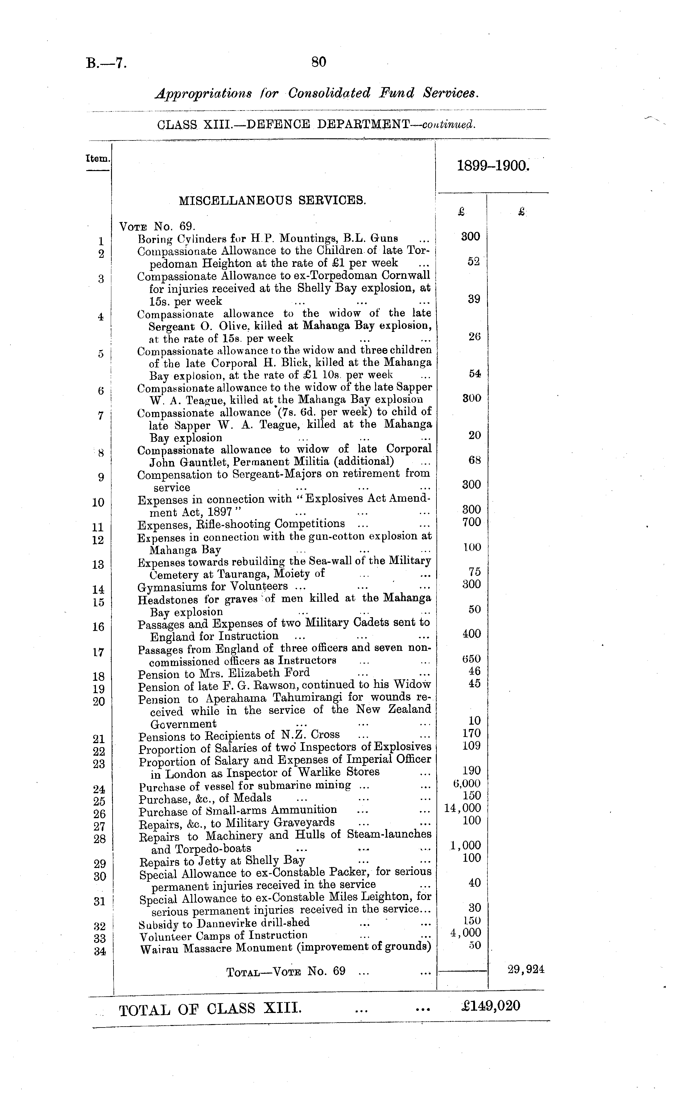 Item. 1899-1900. MISCELLANEOUS SEBVICES. £ £ 1 2 3 8 9 10 11 12 13 14 15 5 0 7 Vote No. 69. Boring Cylinders for HP. Mountings, B.L. Guns Compassionate Allowance to the Children, of late Torpedoman Heighton at the rate of £1 per week Compassionate Allowance to ex-Torpedoman Cornwall for injuries received at the Shelly Bay explosion, at 15s. per week Compassionate allowance to the widow of the late Sergeant O. Olive, killed at Mahanga Bay explosion, at the rate of 15s. per week Compassionate allowance to the widow and three children of the late Corporal H. Blick, killed at the Mahanga Bay explosion, at the rate of £1 10s per week Compassionate allowance to the widow of the late Sapper W. A. Teague, killed at the Mahanga Bay explosion Compassionate allowance '(7s. 6d. per week) to child of late Sapper W. A. Teague, killed at the Mahanga Bay explosion ... ... Compassionate allowance to widow of late Corporal John Gauntlet, Permanent Militia (additional) Compensation to Sergeant-Majors on retirement from service Expenses in connection with " Explosives Act Amendment Act, 1897 " Expenses, Rifle-shooting Competitions ... Expenses in connection with the gun-cotton explosion at Mahanga Bay ... •■• ■■■ Expenses towards rebuilding the Sea-wall of the Military Cemetery at Tauranga, Moiety of Gymnasiums for Volunteers ... Headstones for graves of men killed at the Mahanga Bay explosion Passages and Expenses of two Military Cadets sent to England for Instruction Passages from England of three officers and seven noncommissioned officers as Instructors Pension to Mrs. Elizabeth Ford Pension of late F. G. Bawson, continued to his Widow Pension to Aperahama Tahumirangi for wounds received while in the service of the New Zealand Government Pensions to Becipients of N.Z. Cross Proportion of Salaries of two' Inspectors of Explosives Proportion of Salary and Expenses of Imperial Officer in London as Inspector of Warlike Stores Purchase of vessel for submarine mining ... Purchase, &c, of Medals Purchase of Small-arms Ammunition Eepairs, &c, to Military Graveyards Bepairs to Machinery and Hulls of Steam-launches and Torpedo-boats Bepairs to Jetty at Shelly Bay Special Allowance to ex-Constable Packer, for serious permanent injuries received in the service Special Allowance to ex-Constable Miles Leighton, for serious permanent injuries received in the service... Subsidy to Dannevirke drill-shed Volunteer Camps of Instruction Wairau Massacre Monument (improvement of grounds) 300 52 39 26 54 300 20 68 300 300 700 100 75 300 50 16 400 17 650 46 45 18 19 20 10 170 109 21 22 23 24 25 26 27 28 190 6.000 150 14,000 100 1,000 100 29 30 40 31 30 1.50 4,000 50 32 33 34 Total —Vote No. 69 ... 29,924 TAL OP CLASS XIII. £149,020