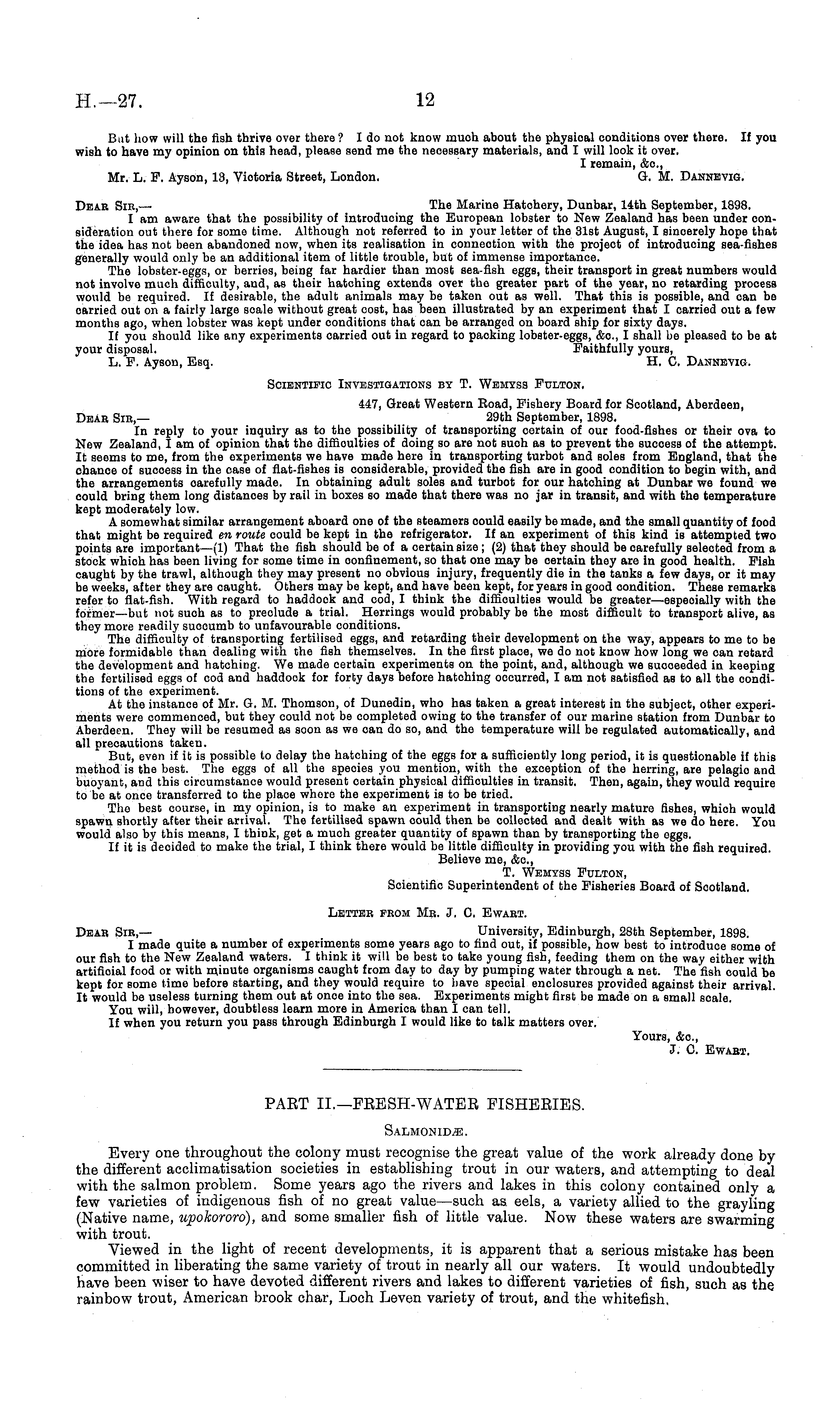 But how will the fish thrive over there ? Ido not know much about the physical conditions over there. If you wish to have my opinion on this head, please send me the necessary materials, and I will look it over. I remain, &c, Mr. L. F. Ayson, 13, Viotoria Street, London, G. M. Dannevig. Dear Sir, — The Marine Hatchery, Dunbar, 14th September, 1898. I am aware that the possibility of introducing the European lobster to New Zealand has been under consideration out there for some time. Although not referred to in your letter of the 31st August, I sincerely hope that the idea has not been abandoned now, when its realisation in connection with the projeot of introducing sea-fishes generally would only be an additional item of little trouble, but of immense importance. The lobster-eggs, or berries, being far hardier than most sea-fish eggs, their transport in great numbers would not involve much difficulty, and, as their hatching extends over the greater part of the year, no retarding process would be required. If desirable, the adult animals may be taken out as well. That this is possible, and can be oarried out on a fairly large scale without great cost, has been illustrated by an experiment that I carried out a few months ago, when lobster was kept under conditions that can be arranged on board ship for sixty days. If you should like any experiments oarried out in regard to packing lobster-eggs, &c, I shall be pleased to be at your disposal. Faithfully yours, L. F. Ayson, Esq. H. C. Dannevig. Scientific Investigations by T. Wemyss Fulton. 447, Great Western Road, Fishery Board for Scotland, Aberdeen, Dear Sir,— 29th September, 1898. In reply to your inquiry as to the possibility of transporting certain of our food-fishes or their ova to New Zealand, I am of opinion that the difficulties of aoing so are not suoh as to prevent the success of the attempt. It seems to me, from the experiments we have maae here in transporting turbot ana soles from Englana, that the chance of sucoess in the case of flat-fishes is oonsiaerable, proviaea the fish are in good conaition to begin with, ana the arrangements carefully maae. In obtaining adult soles and turbot for our hatohing at Dunbar we found we could bring them long distances by rail in boxes so maae that there was no jar in transit, ana with the temperature kept moaerately low. A somewhat similar arrangement aboara one of the steamers couia easily be maae, and the small quantity of food that might be required en route could be kept in the refrigerator. If an experiment of this kind is attempted two points are important—(l) That the fish should be of a certain size ; (2) that they should be carefully selected from a stock whioh has been living for some time in confinement, so that one may be oertain they are in good health. Fish caught by the trawl, although they may present no obvious injury, frequently die in the tanks a few days, or it may be weeks, after they are caught. Others may be kept, and have been kept, for years in good condition. These remarks refer to flat-fish. With regard to haddock and cod, I think the difficulties would be greater—especially with the former—but not such as to preclude a trial. Herrings would probably be the most difficult to transport alive, as they more readily suocumb to unfavourable conditions. The difficulty of transporting fertilised eggs, and retarding their development on the way, appears to me to be more formidable than dealing with the fish themselves. In the first place, we do not know how long we can retard the aevelopment ana hatching. We made certain experiments on the point, and, although we succeeded in keeping the fertilised eggs of cod and haddook for forty days before hatching occurred, I am not satisfied as to all the conditions of the experiment. At the instance of Mr. G. M. Thomson, of Dunedin, who has taken a great interest in the subject, other experiments were commenced, but they could not be completed owing to the transfer of our marine station from Dunbar to Aberdeen. They will be resumed as soon as we can do so, and the temperature will be regulated automatically, and all precautions taken. But, even if it is possible to delay the hatching of the eggs for a sufficiently long period, it is questionable if this method is the best. The eggs of all the speoies you mention, with the exception of the herring, are pelagic and buoyant, and this circumstance would present certain physical difficulties in transit. Then, again, they would require to be at once transferred to the place where the experiment is to be tried. The best course, in my opinion, is to make an experiment in transporting nearly mature fishes, which would spawn shortly after their arrival. The fertilised spawn could then be collected and dealt with as we do here. You would also by this means, I think, get a much greater quantity of spawn than by transporting the eggs. If it is decided to make the trial, I think there would be little difficulty in proviaing you with the fish required. Believe me, &c, T. Wemyss Fulton, Scientific Superintendent of the Fisheries Board of Scotland. Letter from Mr. J. C, Ewart. Dear Sir,— University, Edinburgh, 28th September, 1898. I made quite a number of experiments some years ago to find out, if possible, how best to introduce some of our fish to the New Zealand waters. I think it will be best to take young fish, feeding them on the way either with artificial food or with minute organisms caught from day to day by pumping water through a net. The fish could be kept for some time before starting, and they would require to have special enclosures provided against their arrival. It would be useless turning them out at once into the sea. Experiments might first be made on a small scale. You will, however, aoubtless learn more in America than I can tell. If when you return you pass through Eainburgh I wouia like to talk matters over. Yours, &c, J. C. Ewart.