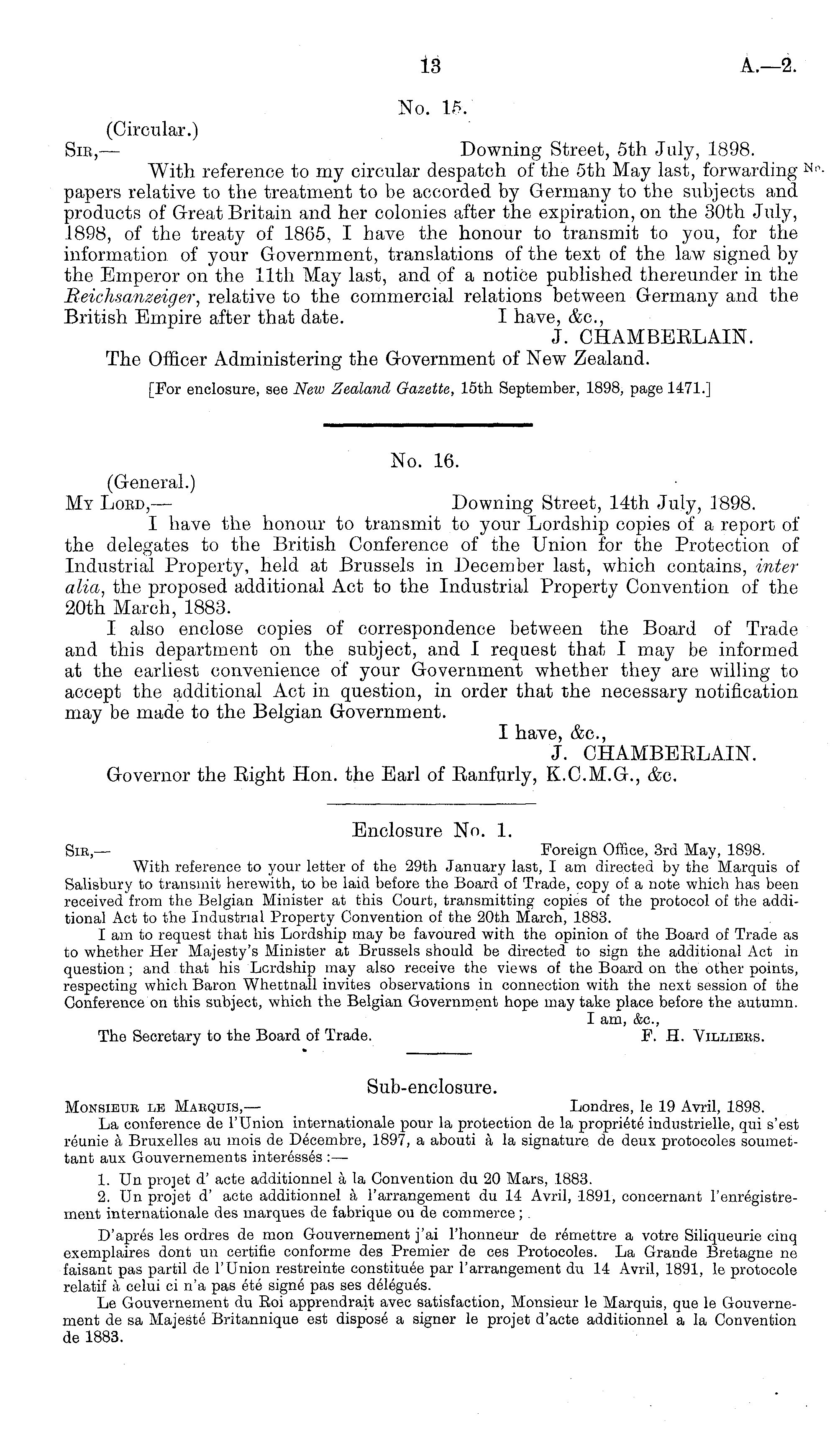 Enclosure No. 1. Sir,— Foreign Office, 3rd May, 1898. With reference to your letter of the 29th January last, I am directed by the Marquis of Salisbury to transmit herewith, to be laid before the Board of Trade, copy of a note which has been received from the Belgian Minister at this Court, transmitting copies of the protocol of the additional Act to the Industrial Property Convention of the 20th March, 1883. I am to request that his Lordship may be favoured with the opinion of the Board of Trade as to whether Her Majesty's Minister at Brussels should be directed to sign the additional Act in question; and that his Lordship may also receive the views of the Board on the other points, respecting which Baron Whectnall invites observations in connection with the next session of the Conference on this subject, which the Belgian Government hope may take place before the autumn. I am, &c, The Secretary to the Board of Trade. F. H. Villieks.