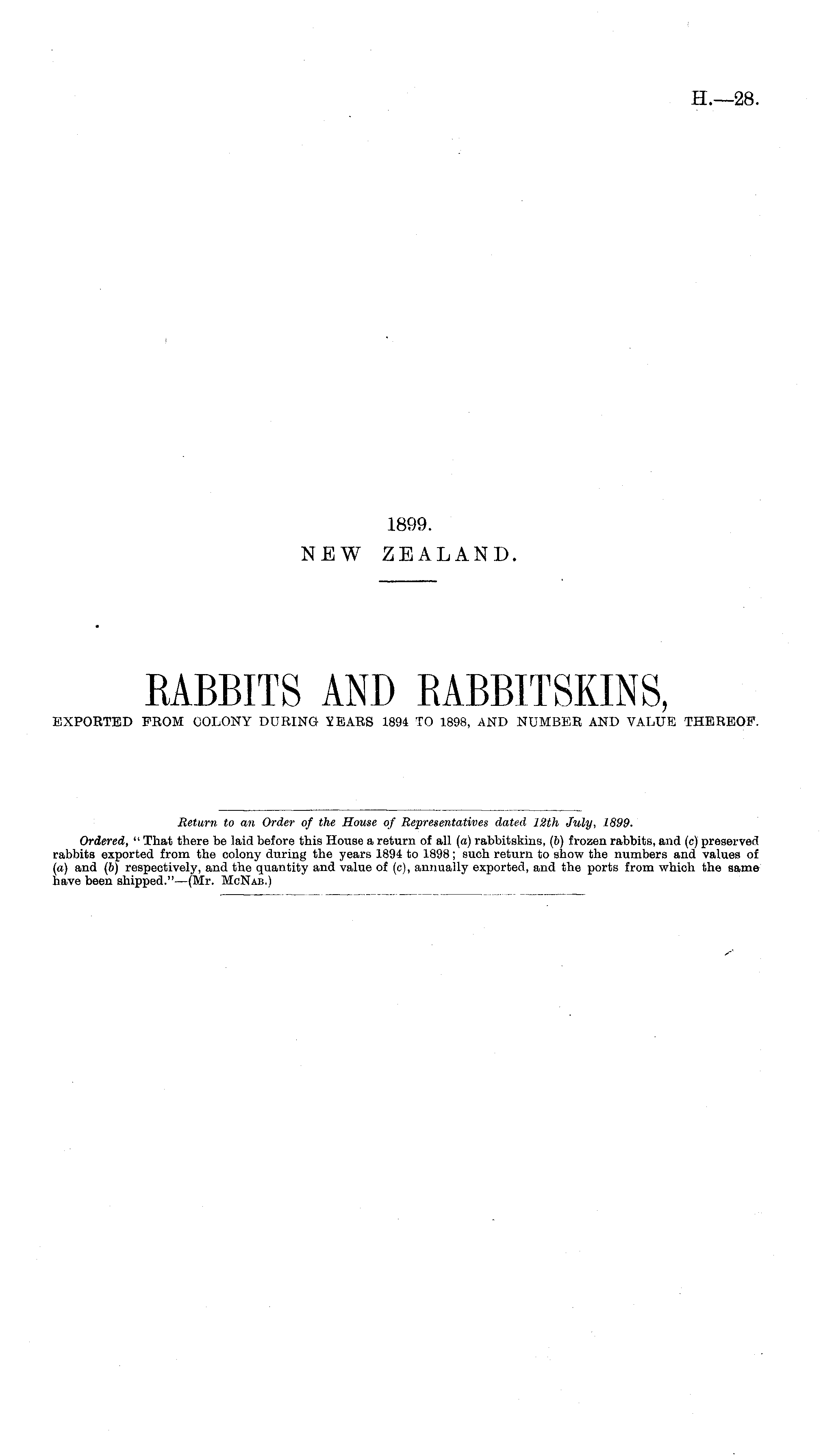 Return to an Order of the House of Representatives dated 12th July, 1899. Ordered, " That there be laid before this House a return of all (a) rabbitskins, (b) frozen rabbits, and (c) preserved rabbits exported from the colony during the years 1894 to 1898; such return to show the numbers and values of (a) and (6) respectively, and the quantity and value of (c), annually exported, and the ports from which the same have been shipped."—(Mr. McNab.)