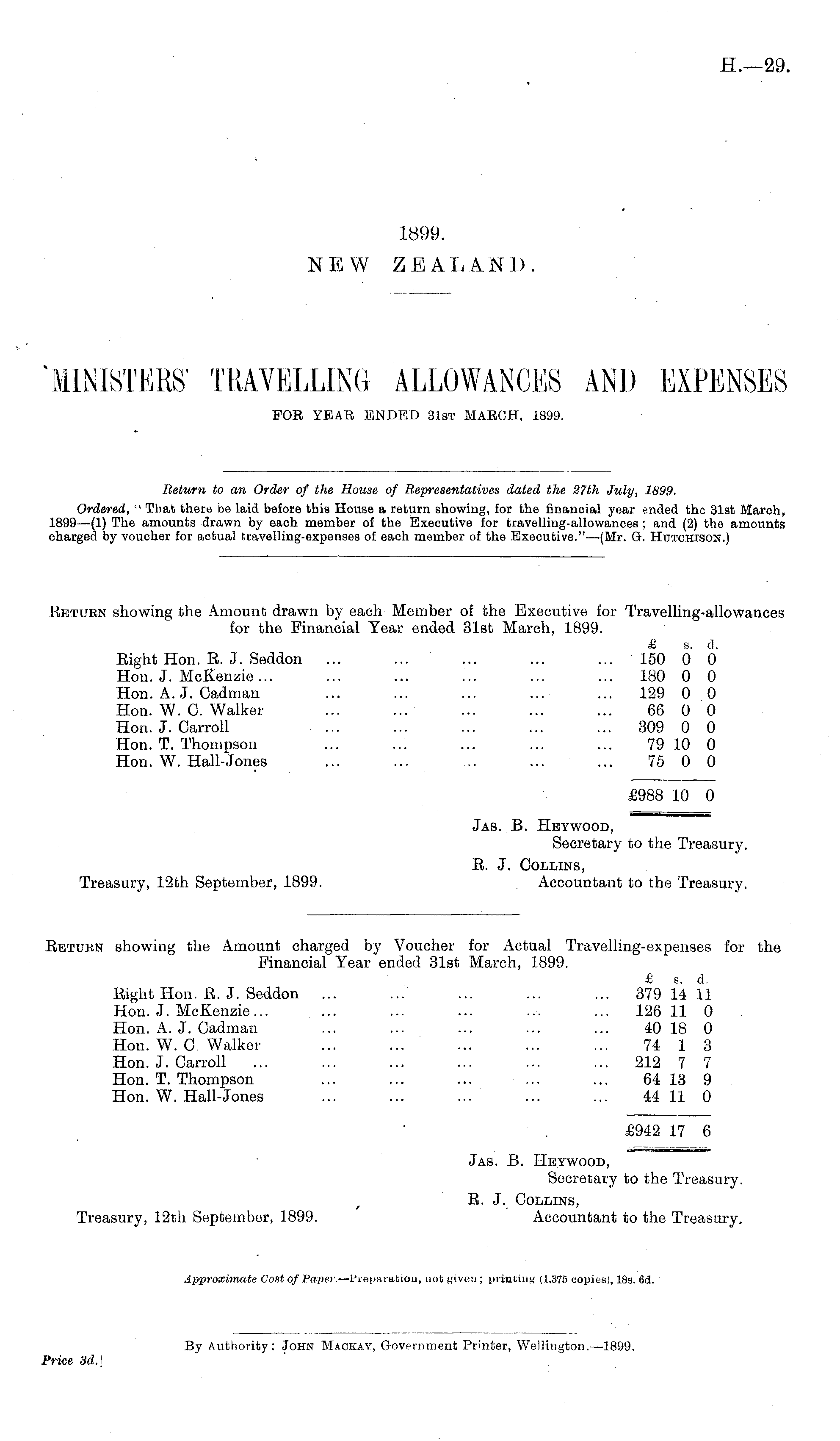 Eetukn showing the Amount charged by Voucher for Actual Travelling-expenses for the Financial Year ended 31st March, 1899. & s. d. Eight Hon. E. J. Seddon ... ... ... ... ... 379 14 11 Hon. J. McKenzie... ... ... ... ... ... 126 11 0 Hon. A. J. Cadman ... ... ... ... ... 40 18 0 Hon. W. C Walker ... ... ... ... ... 74 1 3 Hon. J. Carroll ... ... ... ... ... ... 212 7 7 Hon. T. Thompson ... ... ... ... ... 64 13 9 Hon. W. Hall-Jones ... ... ... ... ... 44 11 0 £942 17 6 Jas. B. Heywood, Secretary to the Treasury. E. J. Collins, Treasury, 12th September, 1899. Accountant to the Treasury. Approximate (lost of Papier.— Preparation, not nivan ; printing (1,375 copies), 18s. 6d.