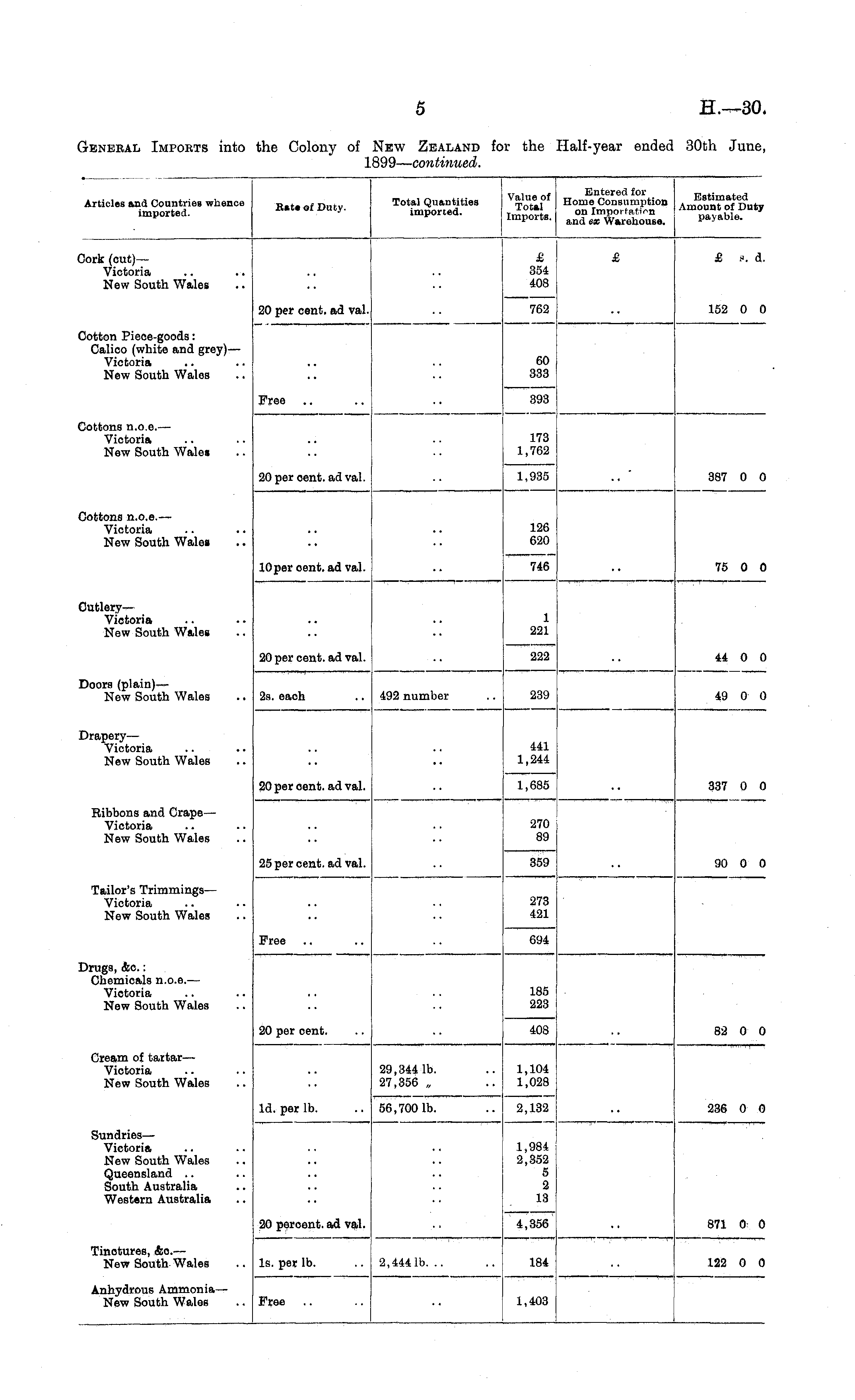 General Imports into the Colony of New Zealand for the Half-year ended 30th June, 1899 — continued.