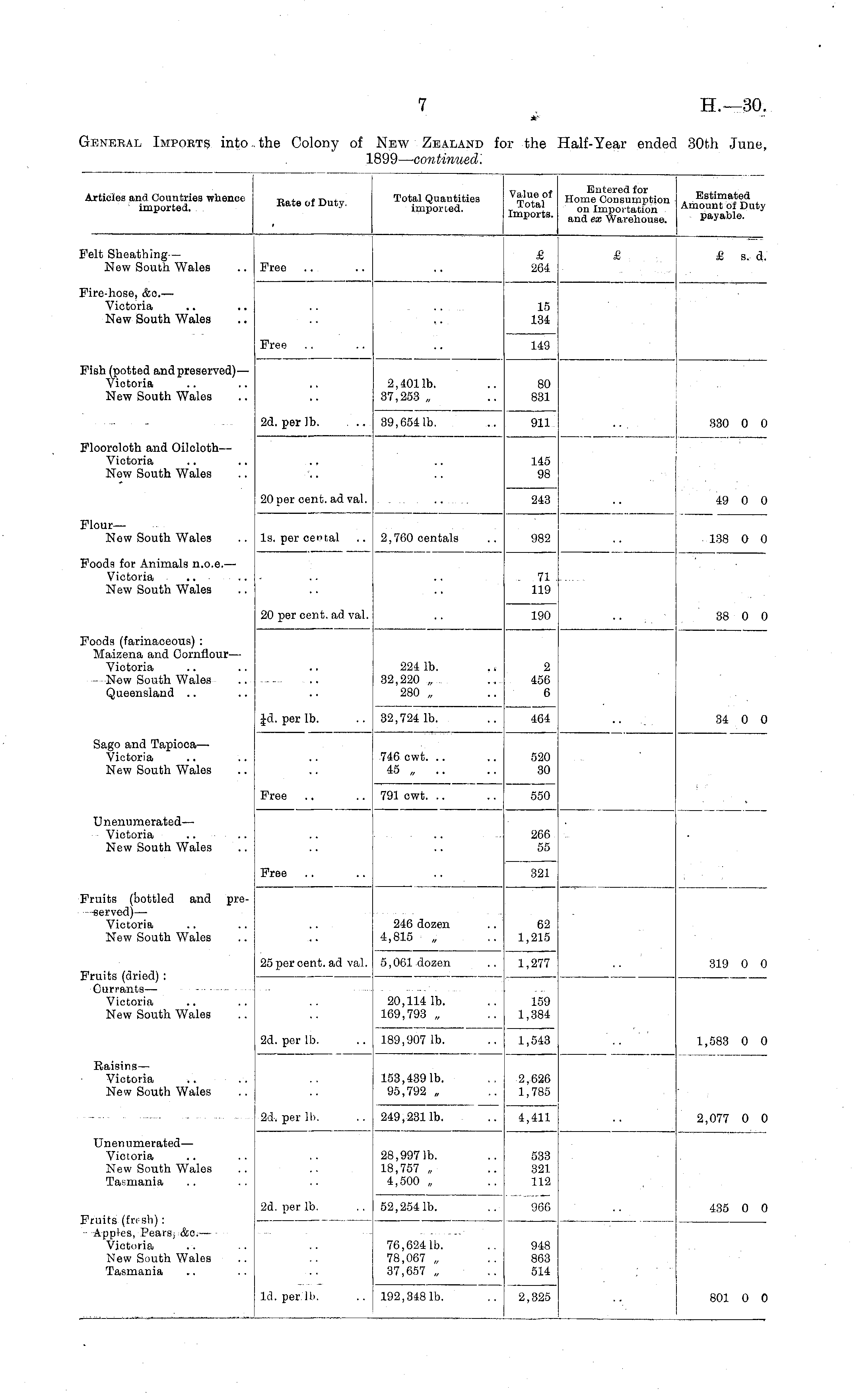 Articles and Countries whence imported. Rate of Duty. Total Quantities imported. Value of Total Imports. Entered for Home Consumption on Importation and ex Warehouse. Estimated Amount of Duty payable. Felt Sheathing— New South Wales 204 £ s. d. Free Fire-hose, &c.— Victoria New South Wales 15 134 Free .. 149 Fish (potted and preserved)— Victoria New South Wales 2,4011b. 37,253 „ 80 831 2d. per lb. 39,6541b. 911 330 0 0 Floorcloth and Oilcloth— Victoria New South Wales 145 98 20 per cent, ad val. 243 49 0 0 FlourNew South Wales Is. per cental 2,760 centals 982 138 0 0 Foods for Animals n.o.e.— Victoria .. New South Wales - 71 119 20 per cent, ad val. 190 38 0 0 Foods (farinaceous) : Maizena and Cornflour — Victoria - New South Wales Queensland 224 lb. 32,220 „ 280 „ 2 456 6 Jd. per lb. 32,724 1b. 464 34 0 0 Sago and Tapioca— Victoria New South Wales 746 owt. .. 45 „ 520 30 Free .. 791 owt. .. 550 Unenumerated — Victoria .. New South Wales __ 266 55 Free 321 Fruits (bottled and preserved) — Victoria New South Wales 246 dozen 4,815 „ 62 1,215 Fruits (dried) : Currants— Victoria New South Wales 25 per cent, ad val. 5,061 dozen 1,277 319 0 0 - 20,114 lb. 169,793 „ 159 1,384 2a. per lb. 1,583 0 0 189,907 lb. 1,543 Raisins — Victoria New South Wales 153,4391b. 95,792 „ 2,626 1,785 2d. per It). 249,2311b. 4,411 2,077 0 0 Unenomerated— Victoria New South Wales Tasmania 28,9971b. 18,757 „ 4,500 „ 533 321 112 2d. per lb. 966 435 0 0 Fruits (fresh): Apples, Pears, &c.— Victoria New South Wales Tasmania 52,2541b. 76,6241b. 78,067 „ 37,657 „ 948 863 514 801 0 0 Id. per ll>. 192,3481b. 2,325