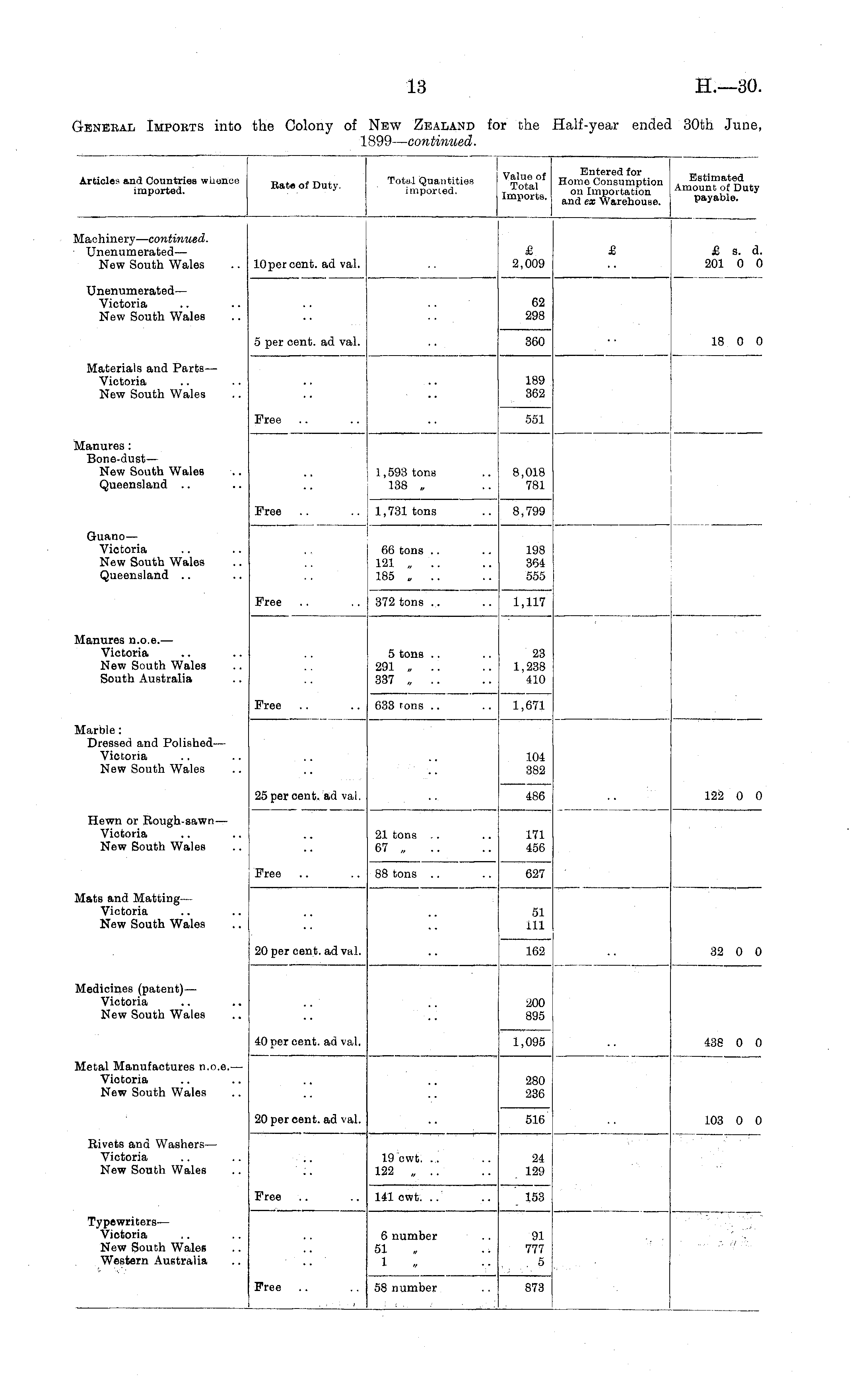 Articles and Countries wkonce imported. Rate of Duty. Total Quantities imported. I : Valua of Entered for Totnl Home Consumption Tmnnrts on Importation imports. and ex WarehoU8e . Estimated Amount of Duty payable. Machinery— continued. Unenumerated— New South Wales 2,009 £ £ s. d. 201 0 0 lOperoent. ad val. Unenumerated — Victoria New South Wales 62 298 18 0 0 5 per cent, ad val. 360 Materials and Parts — Victoria New South Wales 189 362 Free 551 Manures : Bone-dust — New South Wales Queensland 1,593 tons 138 „ 8,018 781 Free Guano — Victoria New South Wales Queensland 1,731 tons 8,799 66 tons .. 121 „ .. 185 „ 198 364 555 Free 1,117 372 tons .. Manures n.o.e.— Victoria New South Wales South Australia 5 tons 291 „.. 337 „.. 23 1,238 410 Free 633 tons 1,671 Marble : Dressed and Polished— Victoria New South Wales 104 382 486 122 0 0 Hewn or Rough-sawn— Victoria New South Wales 25 per cent, ad val. 21 tons 67 „ 171 456 Free Mats and Matting— Victoria New South Wales 88 tons .. 627 51 111 32 0 0 20 per cent, ad val. 162 Medicines (patent)— Victoria New South Wales 200 895 438 0 0 40 per cent, ad val. 1,095 Metal Manufactures n.o.e.— Victoria New South Wales 280 236 103 0 0 20 per cent, ad val. 516 Rivets and Washers— Victoria New South Wales 19 ewt. .. 122 „ .. 24 129 Free 141 cwt. .. 153 Typewriters— Victoria New South Wales Western Australia 6 number 51 1 91 777 5 Free 58 number 873
