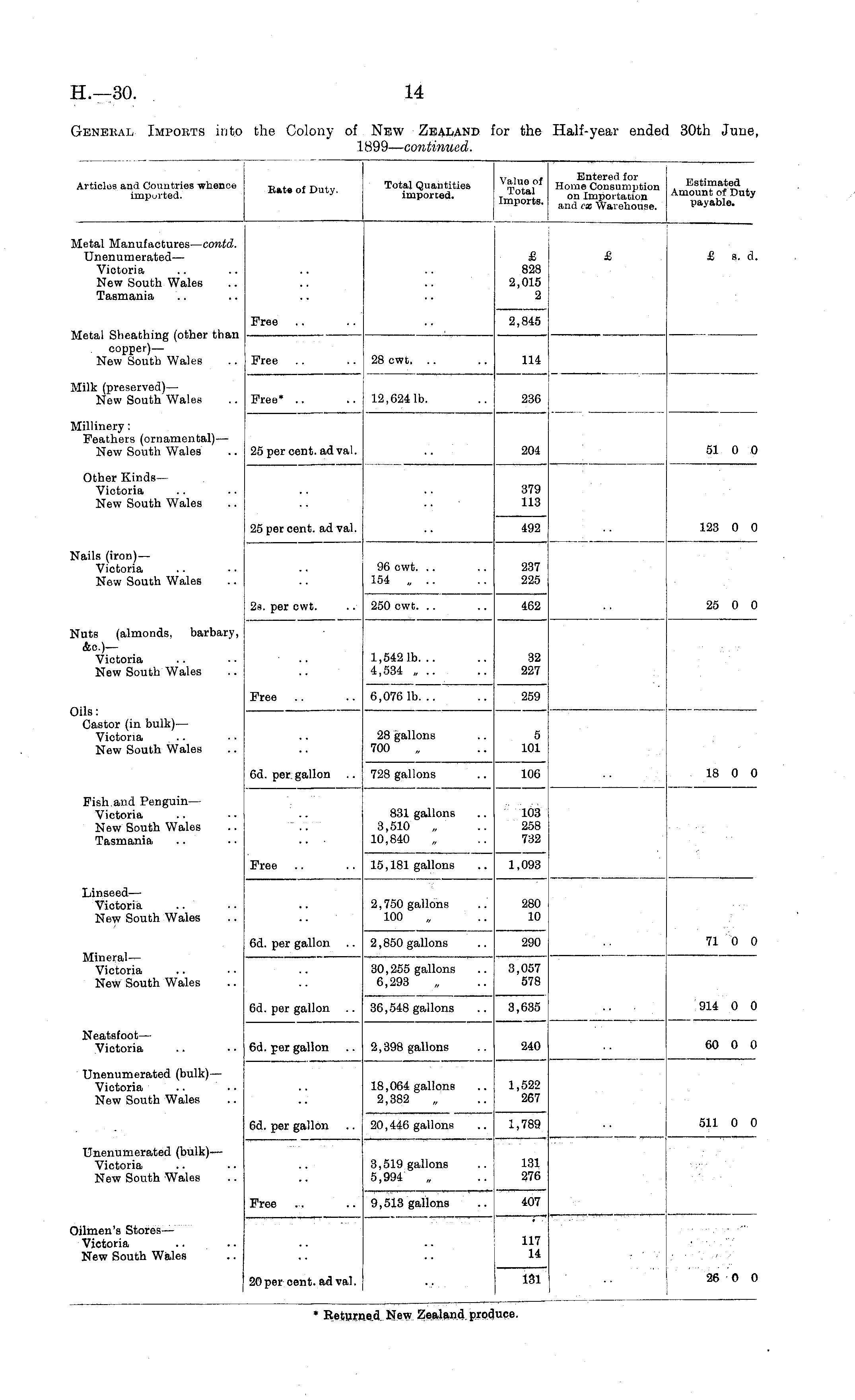 General Imports into the Colony of New Zealand for the Half-year ended 30th June, 1899 — continued.