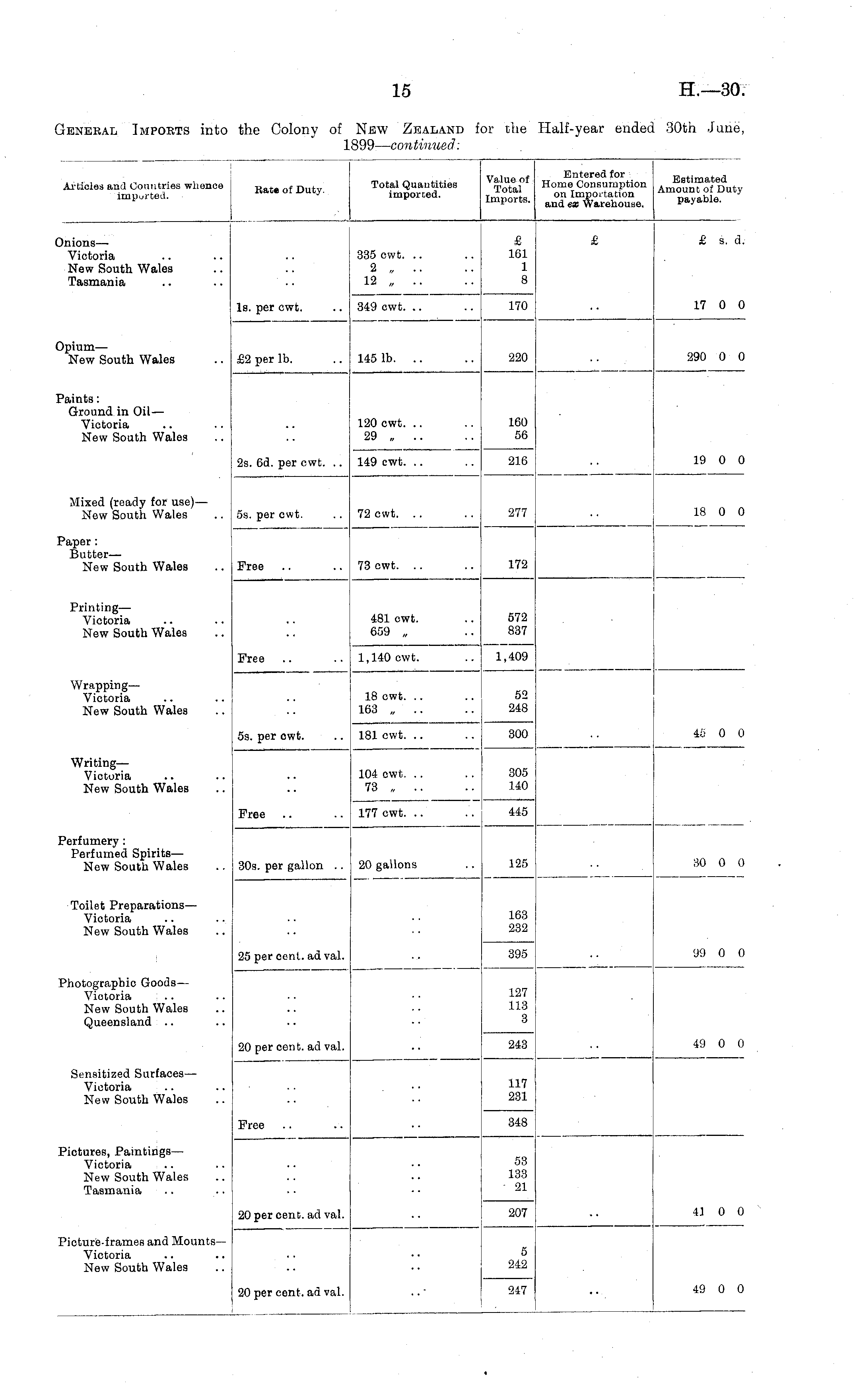 Articles and Countries whonce imparted. Kate of Duty. Total Quantities imported. Value of Total Imports. Entered for Home Consumption on Importation and ex Warehouse. Estimated Amount of Duty payable. Onions — Victoria New South Wales Tasmania £ 161 1 8 & £ s. d. 335 owt. .. 2 „ .. 12 „ .. Is. per owt. 17 0 0 349 cwt. .. 170 Opium— New South Wales £2 per lb. 290 0 0 145 lb. 220 Paints: Ground in Oil — Victoria New South Wales 120 owt. .. 29 „ 160 56 19 0 0 2s. 6d. per owt. .. 149 cwt. .. 216 Mixed (ready for use) — New South Wales 5s. per owt. i 72 cwt. 277 18 0 0 Paper: Butter— New South Wales Free 73 cwt. 172 Printing— Victoria New South Wales 481 cwt. 659 „ 572 837 Free 1,140 owt. 1,409 Wrapping— Victoria New South Wales 18 owt. 163 „ 52 248 5s. per owt. 181 cwt. .. 300 40 0 0 WritingVictoria New South Wales 104 cwt. .. 73 „ .. 305 140 Free 177 cwt. .. 445 Perfumery : Perfumed Spirits— New South Wales 30 0 0 30s. per gallon .. 20 gallons 125 Toilet Preparations— Victoria New South Wales 163 232 25 per cent, ad val. 395 99 0 0 Photographic Goods— Victoria New South Wales Queensland 127 118 3 49 0 0 20 per cent, ad val. 243 Sensitized Surfaces — Victoria New South Wales 117 231 Free 348 Pictures, Paintings— Victoria New South Wales Tasmania 53 133 21 20 per cent, ad val. 207 41 0 0 Picture-frames and MountsVictoria New South Wales 5 242 ier cent, ad val. 247 49 0 0 20