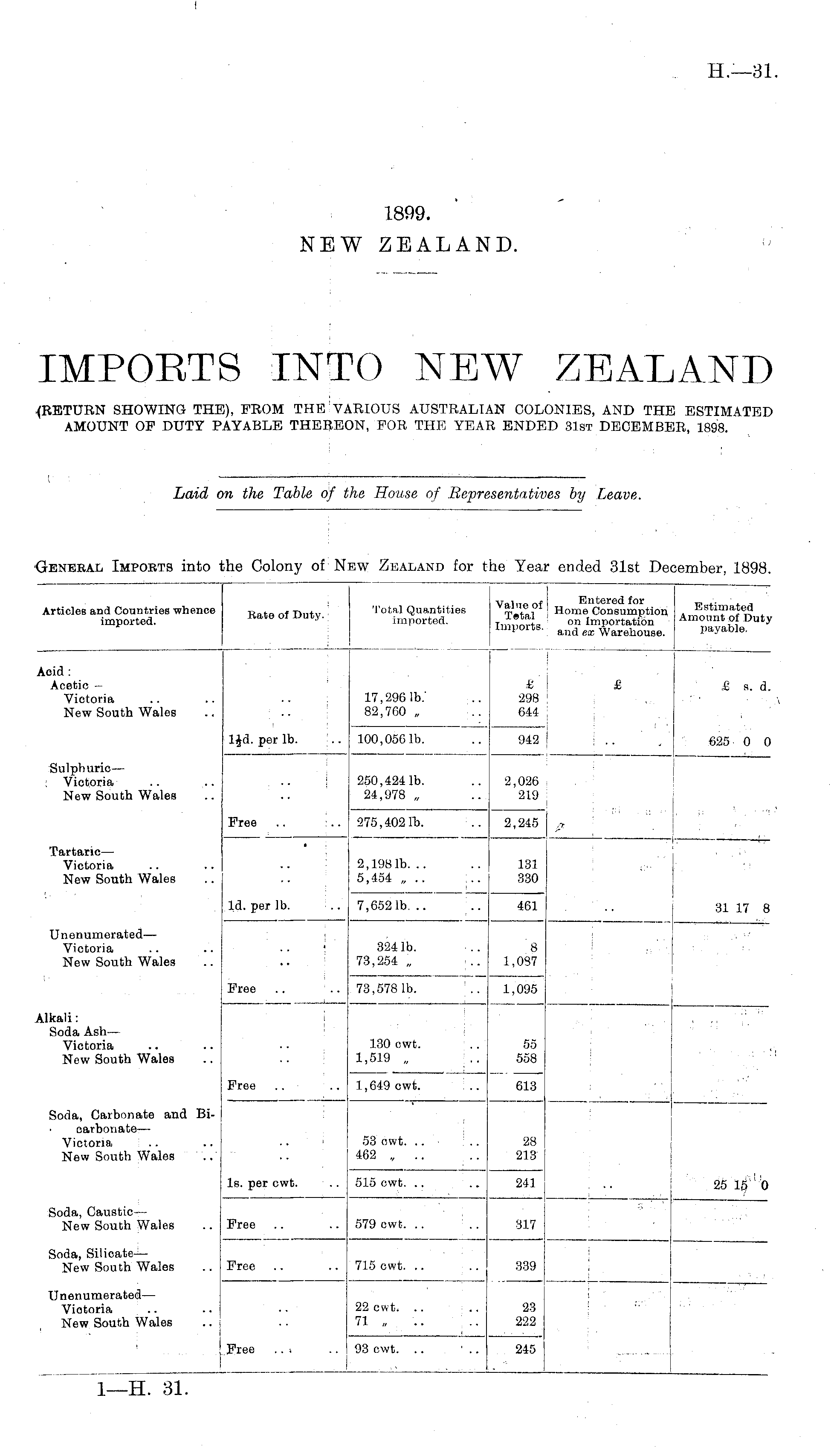 IMPORTS INTO NEW ZEALAND (RETURN SHOWING THE), FROM THE VARIOUS AUSTRALIAN COLONIES, AND THE ESTIMATED AMOUNT OF DUTY PAYABLE THEREON, FOR THE YEAR ENDED 31st DECEMBER, 1898.