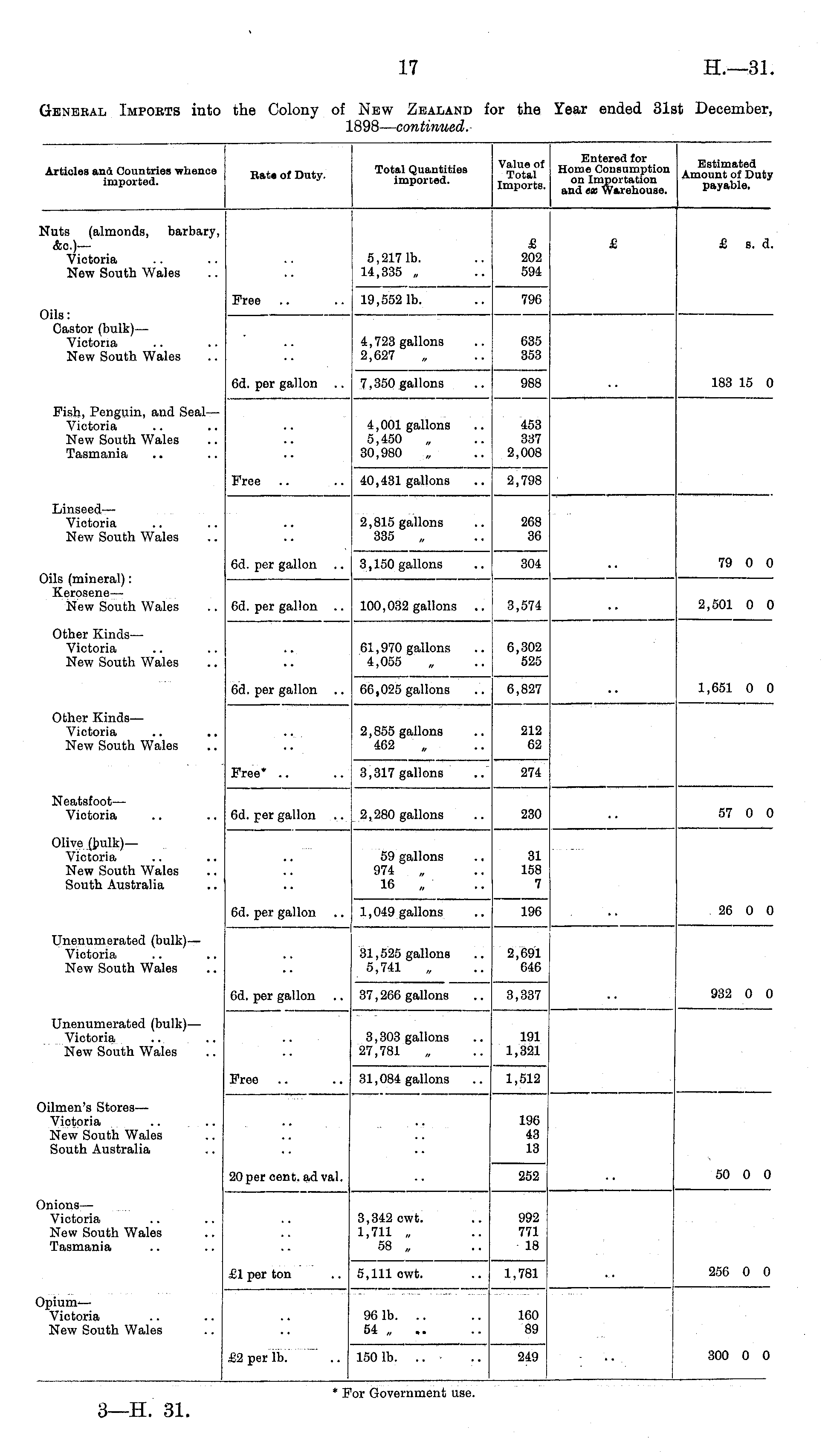 Articles and Countries whence imported. Rate of Duty. Total Quantities imported. Value of Total Imports. Entered for Home Consumption on Importation and ex Warehouse. Estimated Amount of Duty payable. Nuts (almonds, barbary, &c.)— Victoria New South Wales 5,2171b. 14,335 „ £ 202 594 £ s. a. Oils: Castor (bulk)— Victoria New South Wales Free 19,5521b. 796 4,723 gallons 2,627 635 353 6d. per gallon 7,350 gallons 988 183 15 0 Pish, Penguin, and Seal— Victoria New South Wales Tasmania 4,001 gallons 5,450 „ 30,980 „ 453 337 2,008 Free 40,431 gallons 2,798 Linseed — Victoria New South Wales 2,815 gallons 335 268 36 Oils (mineral): Kerosene — New South Wales 6d. per gallon 3,150 gallons 304 79 0 0 6d. per gallon 100,032 gallons 3,574 2,501 0 0 Other Kinds — Victoria New South Wales 61,970 gallons 4,055 6,302 525 6d. per gallon 66,025 gallons 6,827 1,651 0 0 Other Kinds— Victoria New South Wales 2,855 gallons 462 212 62 Free* .. 3,317 gallons 274 Neatsfoot — Victoria 6d. per gallon 2,280 gallons 230 57 0 0 Olive (bulk)— Victoria New South Wales South Australia 59 gallons 974 16 31 158 7 6d. per gallon 1,049 gallons 196 26 0 0 Unenumerated (bulk) — Victoria New South Wales 31,525 gallons 5,741 2,691 646 6d. per gallon 37,266 gallons 3,337 932 0 0 Unenumerated (bulk) — Victoria New South Wales 3,303 gallons 27,781 191 1,321 Free 31,084 gallons 1,512 Oilmen's Stores — Victoria New South Wales South Australia 196 43 13 20 per cent, ad val. 252 50 0 0 Onions— Victoria New South Wales Tasmania 3,342 cwt. 1,711 „ 58 „ 992 771 18 £1 per ton 5,111 owt. 1,781 256 0 0 Opium— Victoria New South Wales 961b. 54 „ ■ ■ 160 89 £2 per lb. 150 lb. 249 300 0 0 * For Government use.