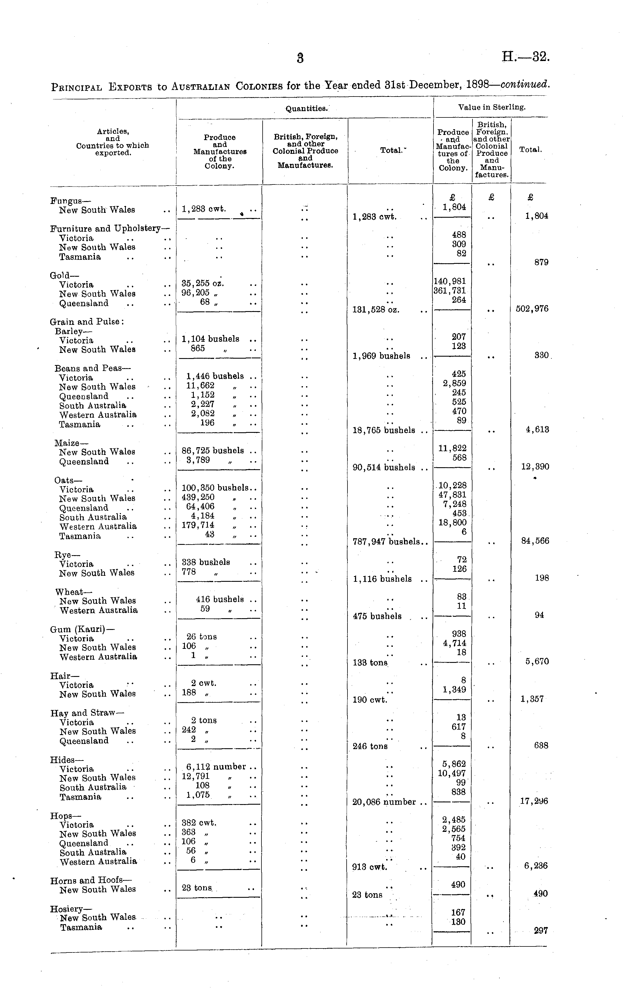 Quantities. Value in Sterling. Articles, and Countries to which exported. Produce and Manufactures of the Colony. British, Foreign, and other Colonial Produce and Manufactures. Total. Produce and Manufactures of the Colony. British, Foreign, and other Colonial Produce and Manufactures. Total. fungus— New South Wales 1,283 owt. .. 1,283 cwt. £ 1,804 £ £ 1,804 furniture and UpholsteryVictoria New South Wales Tasmania 488 309 82 879 iold— Victoria New South Wales Queensland .. • • 35,255 oz. 96,205 „ 68 „ 140,981 361,731 264 131,528 oz. 502,976 3-rain and Pulse: Barley— Victoria New South Wales 1,104 bushels .. 865 207 123 1,969 bushels .. 330 Beans and Peas— Victoria New South Wales Queensland South Australia Western Australia Tasmania 1,446 bushels .. 11,662 „ .. 1,152 „ .. 2,227 „ .. 2,082 „ .. 196 „ .. 425 2,859 245 525 470 89 18,765 bushels .. 4,613 Maize — New South Wales Queensland 86,725 bushels .. 3,789 11,822 568 12,390 90,514 bushels .. Oats — Victoria New South Wales Queensland South Australia Western Australia Tasmania 100,350 bushels.. 439,250 „ .. 64,406 „ .. 4,184 „ .. 179,714 „ .. 43 „ .. 10,228 47,831 7,248 453 18,800 6 787,947 bushels.. 84,566 RyeVictoria New South Wales 338 bushels 778 72 126 198 1,116 bushels .. WheatNew South Wales Western Australia 416 bushels .. 59 83 11 475 bushels , .. 94 3-um (Kauri)— Victoria New South Wales Western Australia 26 tons 106 „ 1 . 938 4,714 18 133 tons 5,670 Hair — Victoria New South Wales 2 cwt. 188 „ 8 1,349 1,357 190 cwt. ' Say and StrawVictoria New South Wales Queensland 2 tons 242 , 2 „ 13 617 8 246 tons 638 Hides — Victoria New South Wales South Australia Tasmania 6,112 number .. 12,791 108 1,075 5,862 10,497 99 838 20,086 number .. 17,296 Hops— Viotoria New South Wales Queensland South Australia Western Australia 382 owt. 363 „ 106 „ 56 „ 6 „ 2,485 2,565 754 392 40 913 cwt. 6,236 Horns and Hoofs— New South Wales 23 tons 490 490 23 tons HosieryNew South Wales Tasmania 167 130 297