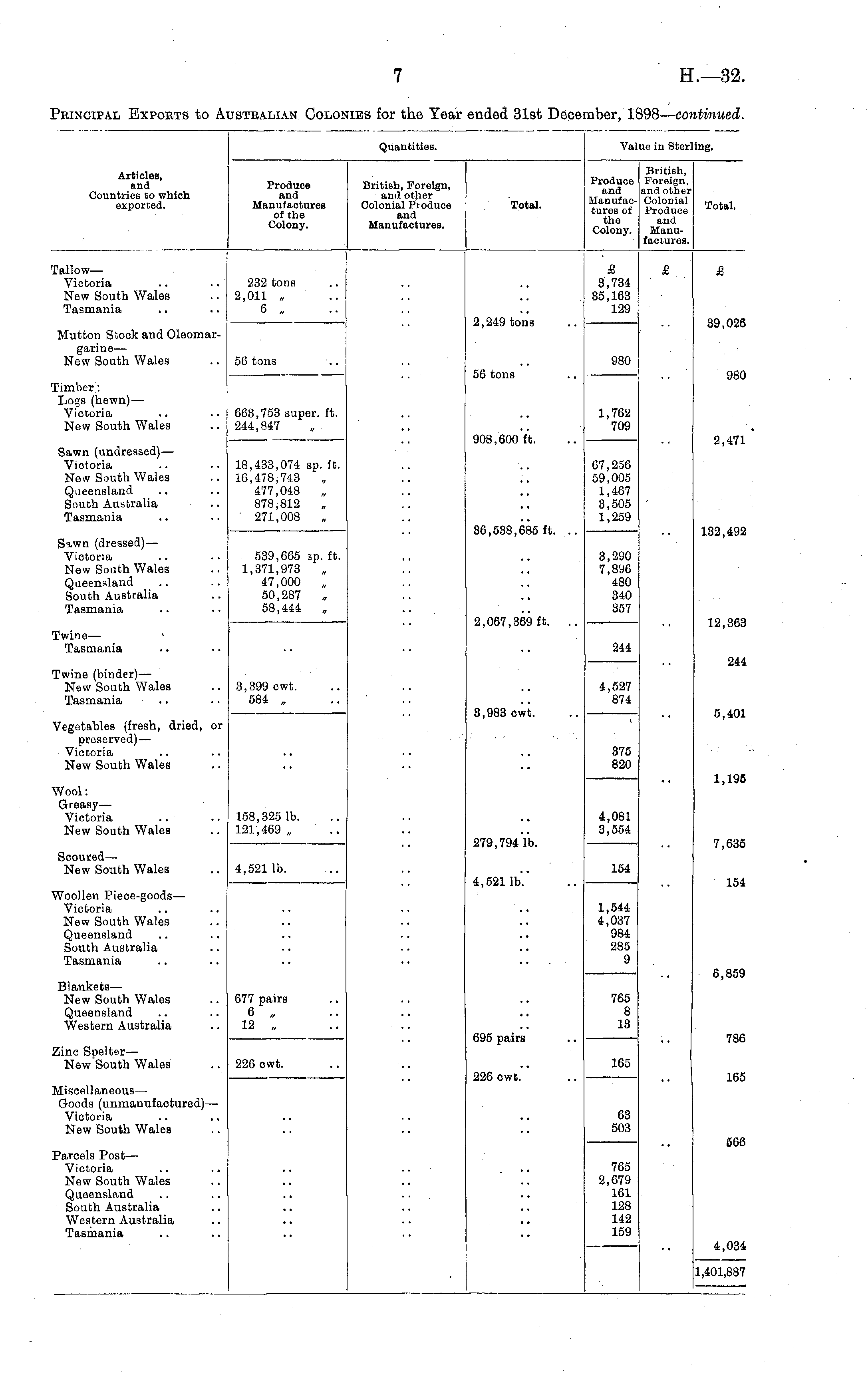 Quantities. Val' le in Sterling. Articles, and Countries to which exported. Produce and Manufactures of the Colony. British, Foreign, and other Colonial Produce and Manufactures. Total. Produce and Manufactures of the Colony. British, Foreign, and other Colonial Produce 10ta1, and Manufactures. TallowVictoria New South Wales Tasmania 232 tons 2,011 „ 6 „ £ 3,734 35,163 129 £ £ 2,249 tons 39,026 Mutton Stock and Oleomargarine— New South Wales 980 56 tons Timber : Logs (hewn) — Victoria New South Wales 56 tons 980 663,753 super, ft. 244,847 1,762 709 Sawn (undressed) — Victoria New S.)uth Wales Queensland South Australia Tasmania 908,600 ft. 2,471 18,433,074 sp. ft. 16,478,743 477,048 „ 878,812 271,008 „ 67,256 59,005 1,467 3,505 1,259 Sawn (dressed) — Victoria New South Wales Queensland South Australia Tasmania 36,538,685 ft. .. 132,492 539,665 sp. ft. 1,371,973 „ 47,000 „ 50,287 58,444 „ 3,290 7,896 480 340 357 Twine — Tasmania 2,067,369 ft. .. 12,363 244 244 Twine (binder) — New South Wales Tasmania 3,399 owt. 584 „ 4,527 874 3,983 cwt. 5,401 Vegetables (fresh, dried, or preserved)— Victoria New South Wales 375 820 Wool: G reasy— Victoria New South Wales 1,195 158,325 1b. 121,469 „ 4,081 3,554 279,794 1b. 7,635 Scoured— New South Wales 4,5211b. 4,5211b'.' 154 154 Woollen Piece-goods— Victoria New South Wales Queensland South Australia Tasmania 1,544 4,037 984 285 9 Blankets — New South Wales Queensland Western Australia 6,859 677 pairs 6 „ 12 „ 765 8 13 Zinc Spelter— New South Wales 695 pairs 786 226 owt. 226 cwt. 165 165 Miscellaneous — Goods (unmanufactured) — Victoria New South Wales 63 503 566 Parcels Post — Victoria New South Wales Queensland South Australia W'estern Australia Tasmania 765 2,679 161 128 142 159 4,034 1,401,887