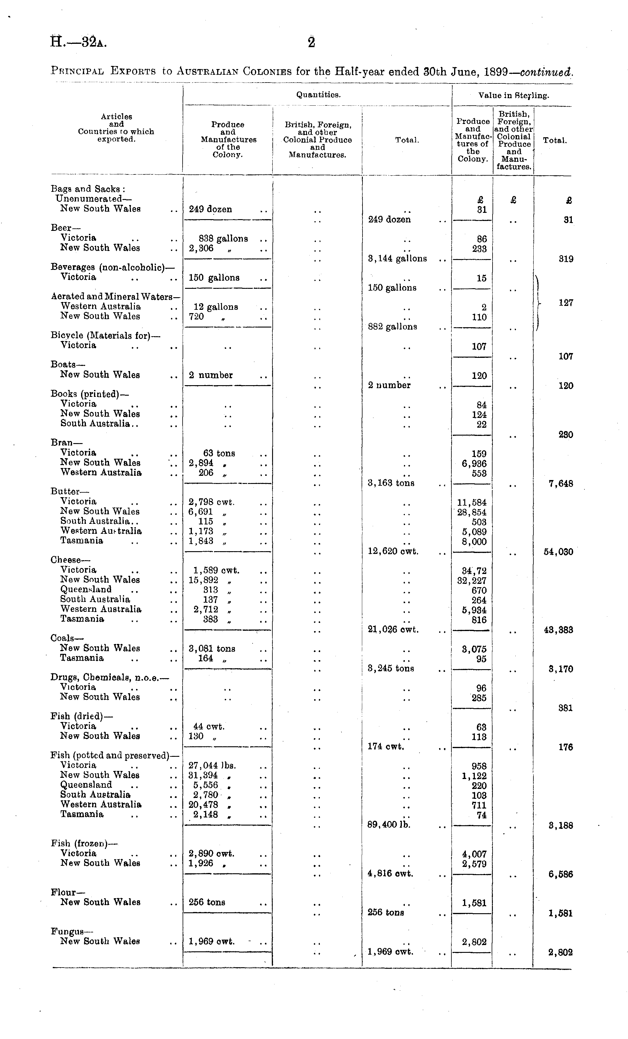 Quantities. Val le in Sterl ling. Articles and Countries ro which exported. Produce and Manufactures of the Colony. British, Foreign, and other j Colonial Produce and Manufactures. Total. Produce and Manufactures of the Colony. British, Foi-eign, and other Colonial Produce and Manufactures. Total. Bags and Sacks : Unenumerated— New South Wales £ 31 £ £ 249 dozen 3eer— Victoria New South Wales 249 dozen 31 838 gallons .. 2,306 , 86 233 319 3everages (non-alcoholic) — Victoria 3,144 gallons 150 gallons 150 gallons 15 [ ) 127 Aerated and Mineral WatersWestern Australia New South Wales 12 gallons 720 , 2 110 3icycle (Materials for) — Victoria 882 gallons 107 107 3oats— New South Wales 2 number 3ooks (printed)— Victoria New South Wales South Australia 2 number 120 120 84 124 22 280 3 ran— Victoria New South Wales Western Australia 63 tons 2,894 , 206 „ 159 6,936 553 3utter— Victoria New South Wales South Australia.. Western Aui-tralia Tasmania 3,163 tons 7,648 2,798 cwt. 6,691 „ 115 „ 1,173 „ 1,843 „ 11,584 28,854 503 5,089 8,000 54,030 jheese— Victoria New South Wales Queensland South Australia Western Australia Tasmania 12,620 owt. 1,589 cwt. 15,892 „ 313 „ 137 , 2,712 , 383 „ 34,72 32,227 670 264 5,934 816 43,383 joals— New South Wales Tasmania 21,026 owt. 3,081 tons 164 „ 3,075 95 3,170 )rug8, Chemicals, n.o.e.— Victoria New South Wales 3,245 tons ! i 96 285 ?ish (dried) — Victoria New South Wales 381 44 owt. 130 „ 63 113 ?ish (potted and preserved)— Victoria New South Wales Queensland South Australia Western Australia Tasmania 27,044 lbs. 31,394 . 5,556 . 2,780 . 20,478 , 2,148 . 174 owt.'' 958 1,122 220 103 711 74 176 89,4001b. 3,188 ?ish (frozen) — Victoria New South Wales 2,890 cwt. 1,926 . 4,007 2,579 6,586 4,816 owt. flourNew South Wales 256 tons 256 tons 1,581 fungus— New South Wales 1,581 1,969 cwt. 1,969 owt. 2,802 2,802