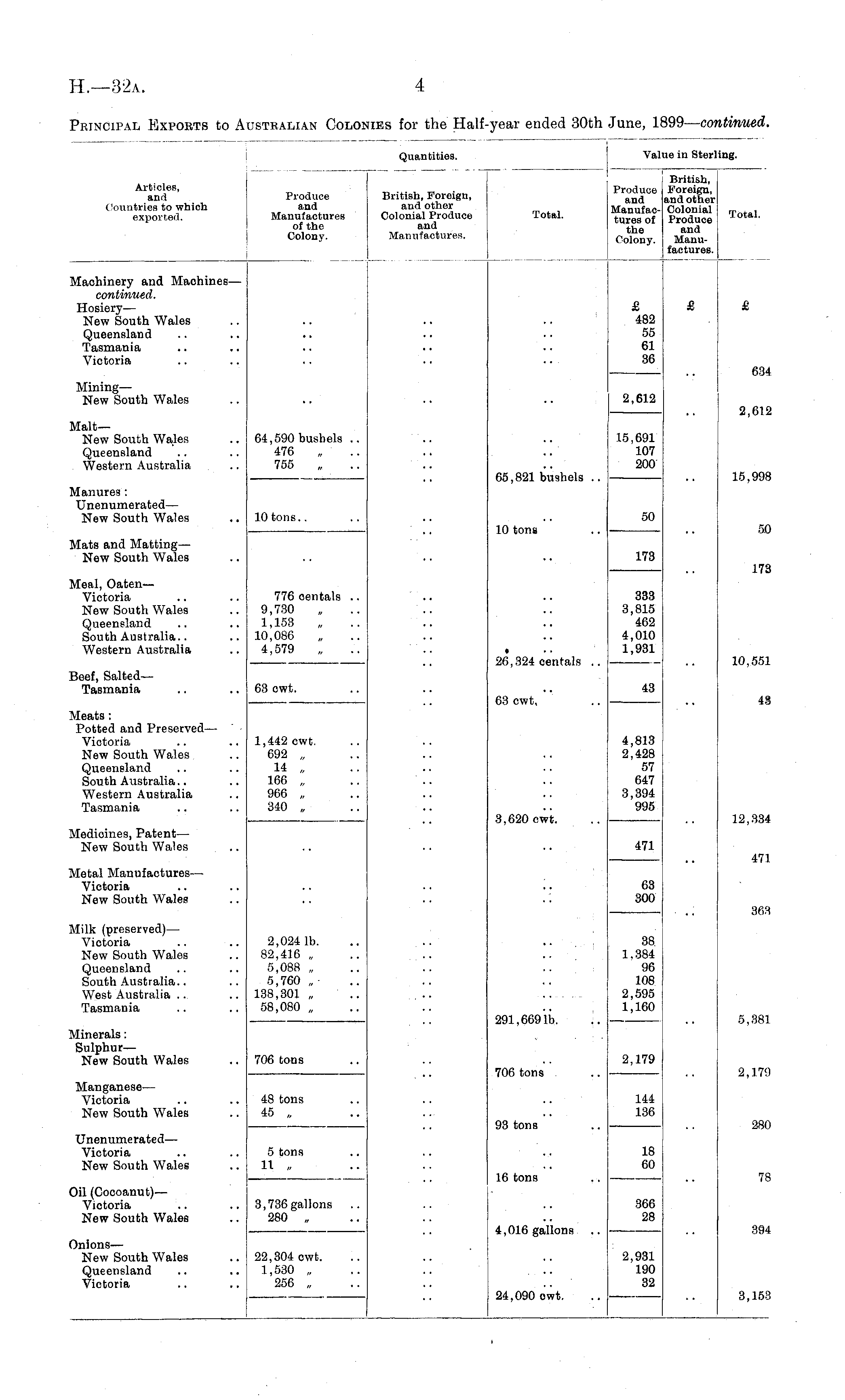 Quantities. lein serl ling. Articles, and Countries to which exported. Produce and Manufactures of the Colony. British, Foreign, and other Colonial Produce and Manufactures. Total. Produce and Manufactures of the Colony. ! British, Foreign, and other Colonial Produce and Manufactures. Total. Machinery and Maohines — continued. Hosiery— New South Wales Queensland Tasmania Victoria £ 482 55 61 36 £ Mining— New South Wales 63. 2,612 2,61! Malt— New South Wales Queensland Western Australia 64,590 bushels .. 476 755 15,691 107 200 Manures : Unenumerated — New South Wales 65,821 bushels .. 15,99! 50 10 tons.. Mats and Matting— New South Wales 10 tons 173 17: Meal, OatenVictoria New South Wales Queensland South Australia.. Western Australia 776 centals .. 9,730 1,153 10,086 4,579 333 3,815 462 4,010 1,931 3eef, Salted — Tasmania • > > 26,324 centals .. 10,551 63 cwt. 43 48 Heats: Potted and Preserved— Victoria New South Wales Queensland South Australia.. Western Australia Tasmania 63 cwt, 1,442 cwt. 692 „ 14 , 166 , 966 „ 340 „ 4,813 2,428 57 647 3,394 995 3,620 cwt. 12,334 Medicines, Patent — New South Wales 471 471 Aletal Manufactures — Victoria New South Wales 63 300 363 Alilk (preserved)— Victoria New South Wales Queensland South Australia.. West Australia Tasmania 2,024 1b. 82,416 „ 5,088 „ 5,760 „ 138,301 „ 58,080 „ 38 1,384 96 108 2,595 1,160 291,6691b. 5,381 Minerals: Sulphur— New South Wales 2,179 2,179 706 tons 706 tons Manganese— Victoria New South Wales 48 tons 45 „ 144 136 280 Unenumerated — Victoria New South Wales 93 tons 5 tons 11 „ 18 60 Dil (Cocoanut) — Victoria New South Wales 16 tons 3,736 gallons .. 280 „ 366 28 4,016 gallons .. 39. Anions— New South Wales Queensland Victoria 22,304 cwt. 1,530 „ 256 „ 2,931 190 32 24,090 owt. 3,15?