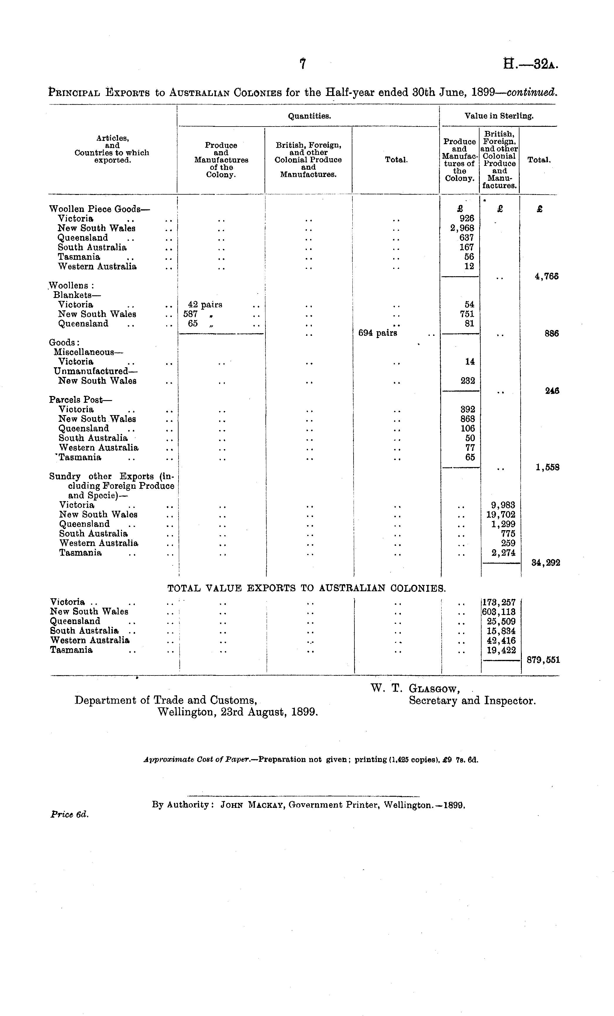 W. T. Glasgow, Department of Trade and Customs, Secretary and Inspector. Wellington, 23rd August, 1899. Approximate Cost of Paper.— Preparation not given; printing (1,425 copies), £9 Vs. 6d.