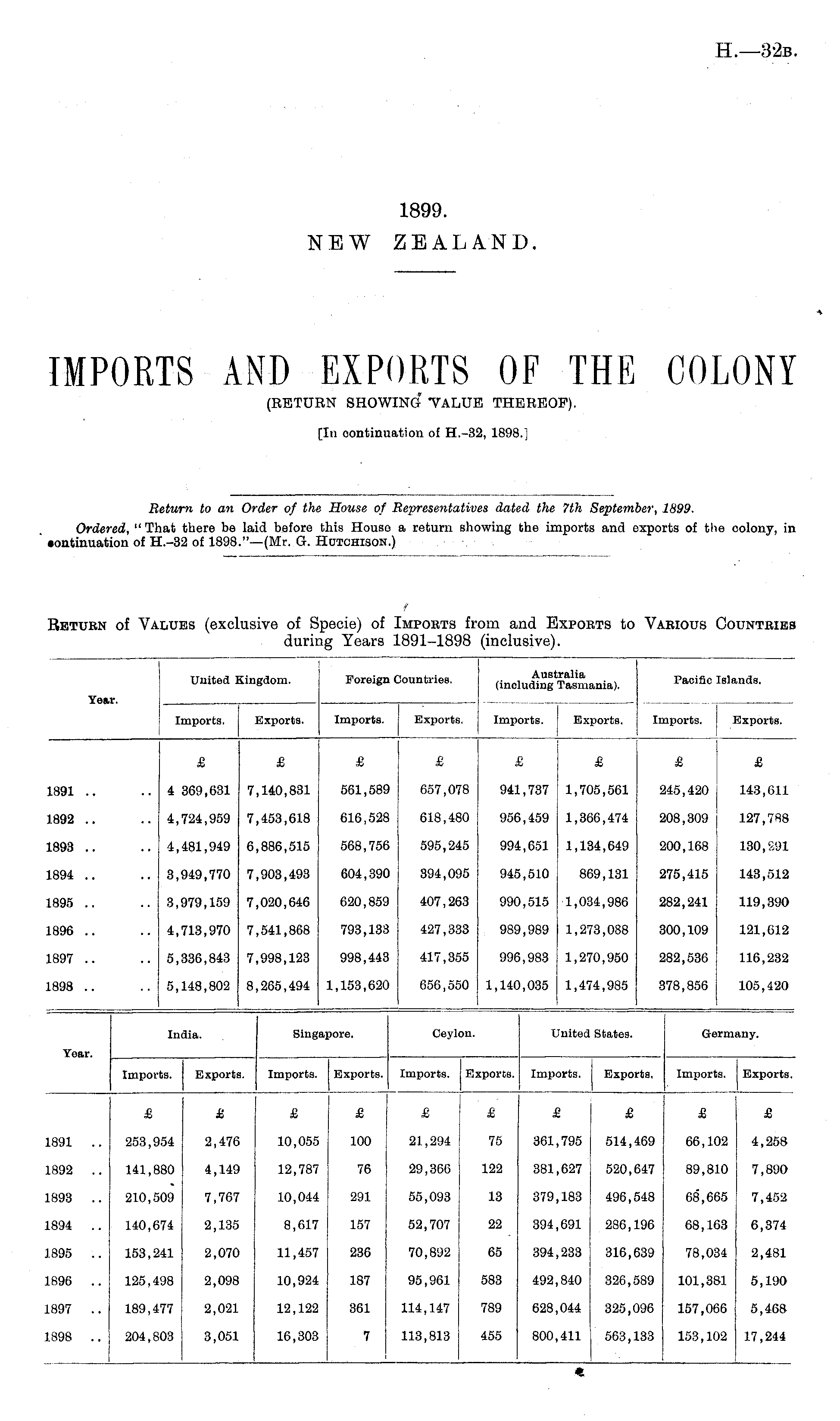 IMPORTS AND EXPORTS OF THE COLONY (RETURN SHOWING VALUE THEREOF). [In continuation of H.-32, 1898.]