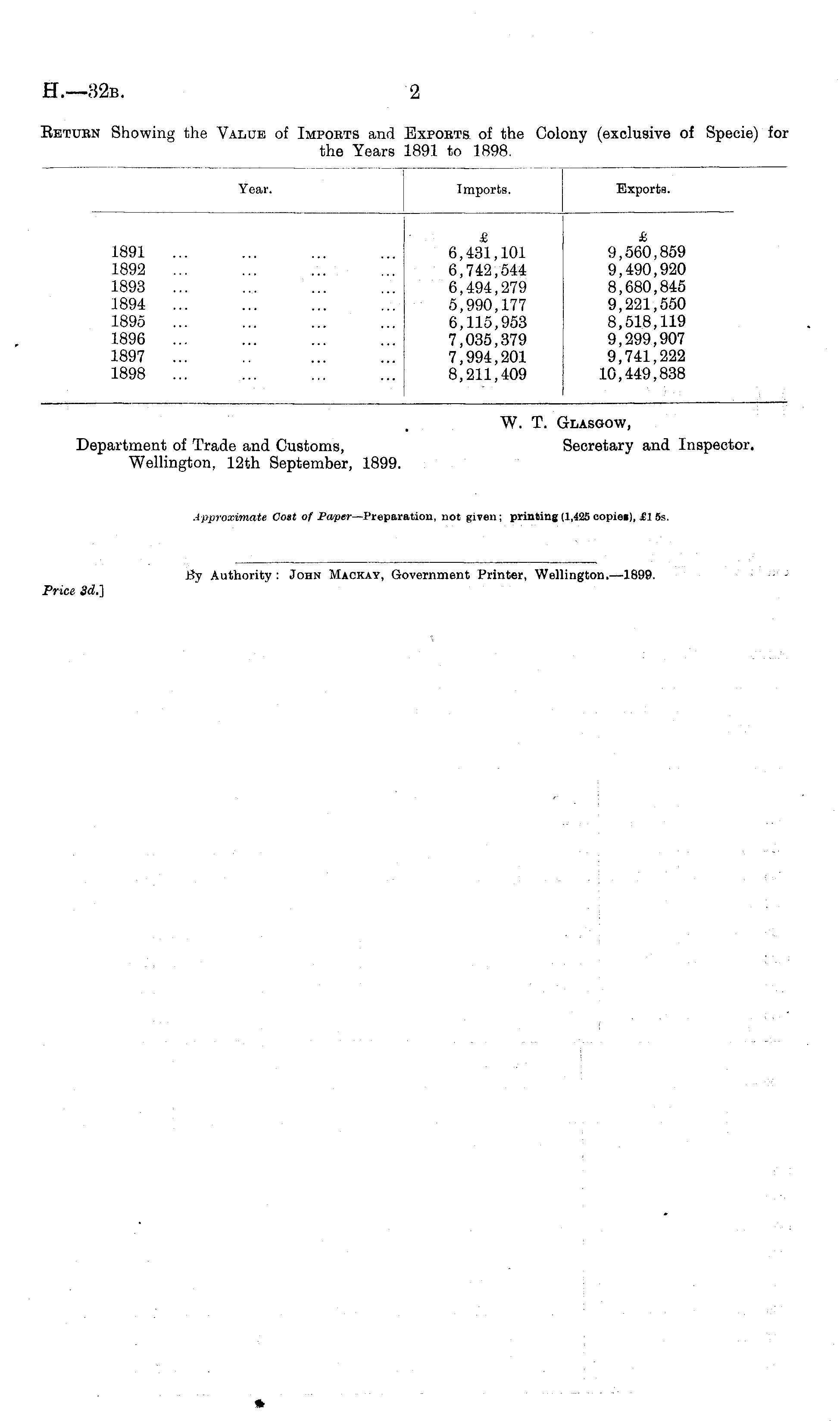 W. T. Glasgow, Department of Trade and Customs, Secretary and Inspector. Wellington, 12th September, 1899. Approximate Cost of Paper— Preparation, not given; printing (1,426 copies), £ 1 Ss.