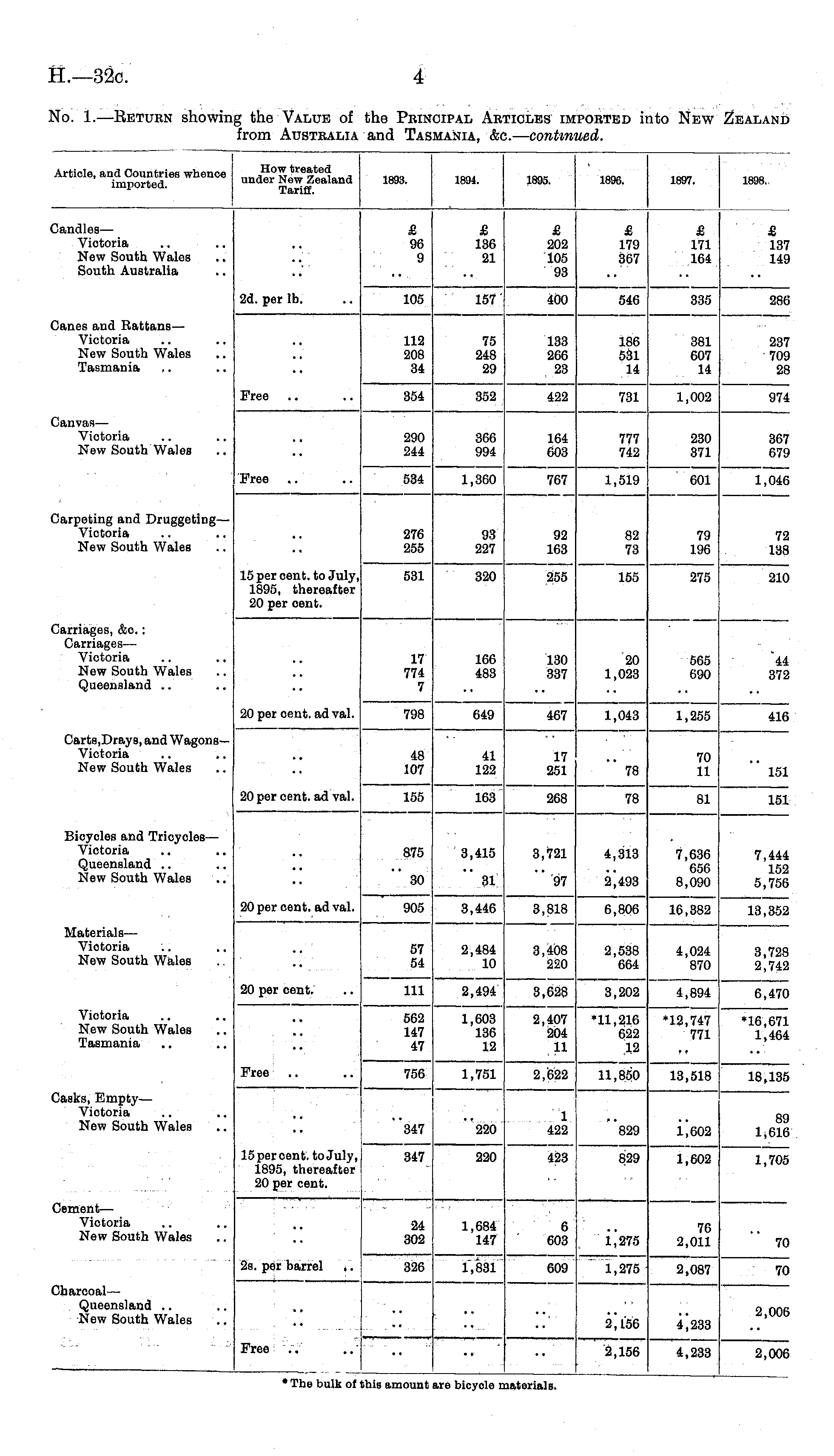 Article, and Countries whence , *™ated imnnrt.eri under New Zealand imported. Tariff. 1893. 1894. 1895. 1896. 1897. 1898., Candles— Viotoria New South Wales South Australia £ 96 9 £ 136 21 £ 202 105 93 £ 179 367 £ 171 164 £ 137 149 2d. per lb. 105 157 400 546 335 286 Canes and Rattans— Victoria New South Wales Tasmania .. 112 208 34 75 248 29 133 266 23 186 531 14 381 607 14 237 709 28 Free 1,002 974 Canvas— Victoria New South Wales 354 352 422 731 367 679 290 244 366 994 164 603 777 742 230 371 Free 534 1,360 767 1,519 601 1,046 Carpeting and Druggeting— Victoria New South Wales 276 255 93 227 92 163 82 73 79 196 72 138 15 per cent, to July, 1895, thereafter 20 per oent. 531 320 255 155 275 210 Carriages, &c.: Carriages— Victoria New South Wales Queensland .. 130 337 20 1,023 565 690 '44 372 17 774 7 166 483 20 per cent, ad val. 649 467 1,043 1,255 416 Carts,Drays, and WagonsVictoria New South Wales 798 48 107 41 122 17 251 70 11 78 151 20 per cent, ad val. 155 163 268 78 81 151 Bicycles and Tricyclee— Victoria Queensland New South Wales 875 3,415 3,721 4,313 7,636 656 8,090 7,444 152 5,756 13,352 30 31 97 21493 20 per cent, ad val. 905 3,446 3,818 6,806 16,382 Materials — Viotoria New South Wales 57 54 2,484 10 3,408 220 2,538 664 4,024 870 3,728 2,742 20 per cent. 111 2,494 Victoria New South Wales Tasmania 3,628 3,202 4,894 6,470 562 147 47 1,603 136 12 2,407 204 11 •11,216 622 12 "12,747 771 •16,671 1,464 Free .. 2,622 11,850 756 1,751 13,518 18,135 Casks, Empty— Viotoria New South Wales "347 1 422 89 Ij616 1,705 15 per oen t. to July, 1895, thereafter 20 per cent. 347 "220 220 423 "829 829 1,602 Cement— Victoria New South Wales 24 302 1,684 147 6 603 76 2,011 1,275 70 2s. per barrel 326 1,831 609 1,275 2,087 70 Charcoal— Queensland New South Wales 2,006 2J156 4,233 Free .. 2,156 4,233 2,006 * The bulk of this amount are bio; cle materials.