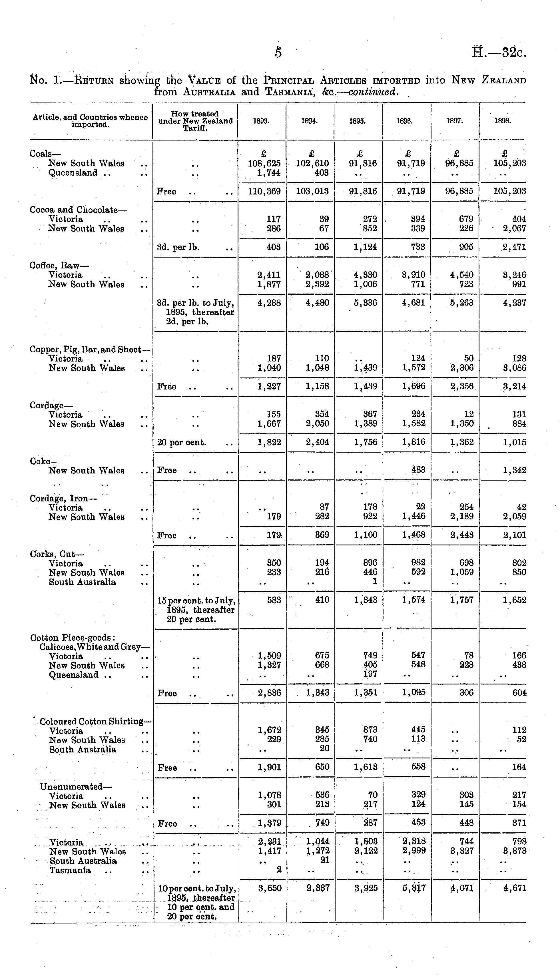 Article, and Countries whence imported. How treated under New Zealand Tariff. 1893. 1894. 3895. 1896. 1897. 1898. 'oals— New South Wales Queensland .. £ 108,625 1,744 110,369 £ 102,610 403 £ 91,816 £ 91,719 £ 96,885 £ 105,203 Free 103,013 91,816 91,719 96,885 105,203 'ocoa and Chocolate— Victoria New South Wales 117 286 39 67 272 852 394 339 679 226 404 ■ 2,067 3d. per lb. 403 106 1,124 733 905 2,471 iofiee, Raw— Victoria New South Wales 2,088 2,392 4,330 1,006 2,411 1,877 3,910 771 4,540 723 3,246 991 3d. per lb. to July, 1895, thereafter 2d. per lb. 4,288 4,681 5,263 4,480 5,336 4,237 Jopper, Pig, Bar, and Sheet — Viotoria New South Wales 187 1,040 110 1,048 1*439 124 1,572 50 2,306 2,356 128 3,086 Free 1,227 1,158 1,439 1,696 3,214 'ordage— Victoria New South Wales 155 1,667 354 2,050 367 1,389 234 1,582 12 1,350 131 884 Joke— New South Wales 20 per cent. 1,822 2,404 1,756 1,816 1,362 1,015 Free 483 1,342 3ordage, Iron— Victoria New South Wales "l79 87 282 178 922 22 1,446 254 2,189 42 2,059 Free 179 Dorks, Cut— Victoria New South Wales South Australia 369 1,100 1,468 2,443 2,101 350 233 194 216 896 446 1 982 592 698 1,059 802 850 15 per eent. to July, 1895, thereafter 20 per cent. 583 410 1,343 1,574 1,757 1,652 Ootton Piece-goods: Calicoes, White and Grey— Victoria New South Wales Queensland 1,509 1,327 675 668 749 405 197 547 548 78 228 166 438 Free 2,836 1,343 1,351 1,095 306 604 Coloured Cotton Shirting— Victoria New South Wales South Australia 1,672 229 345 285 20 873 740 445 113 112 52 Free 1,901 650 1,613 558 164 Unenumerated — Victoria New South Wales 1,078 301 536 213 70 217 329 124 303 145 217 154 Free 1,379 749 287 453 448 371 Victoria .. ., New South Wales South Australia Tasmania 2,231 1,417 1,044 1,272 21 1,803 2,122 2,318 2,999 744 3,327 798 3,873 2 3,925 10 per cent, to July, 1895, thereafter 10 per cent, and 20 per oent. 3,650 2,337 5,317 4,071 4,671