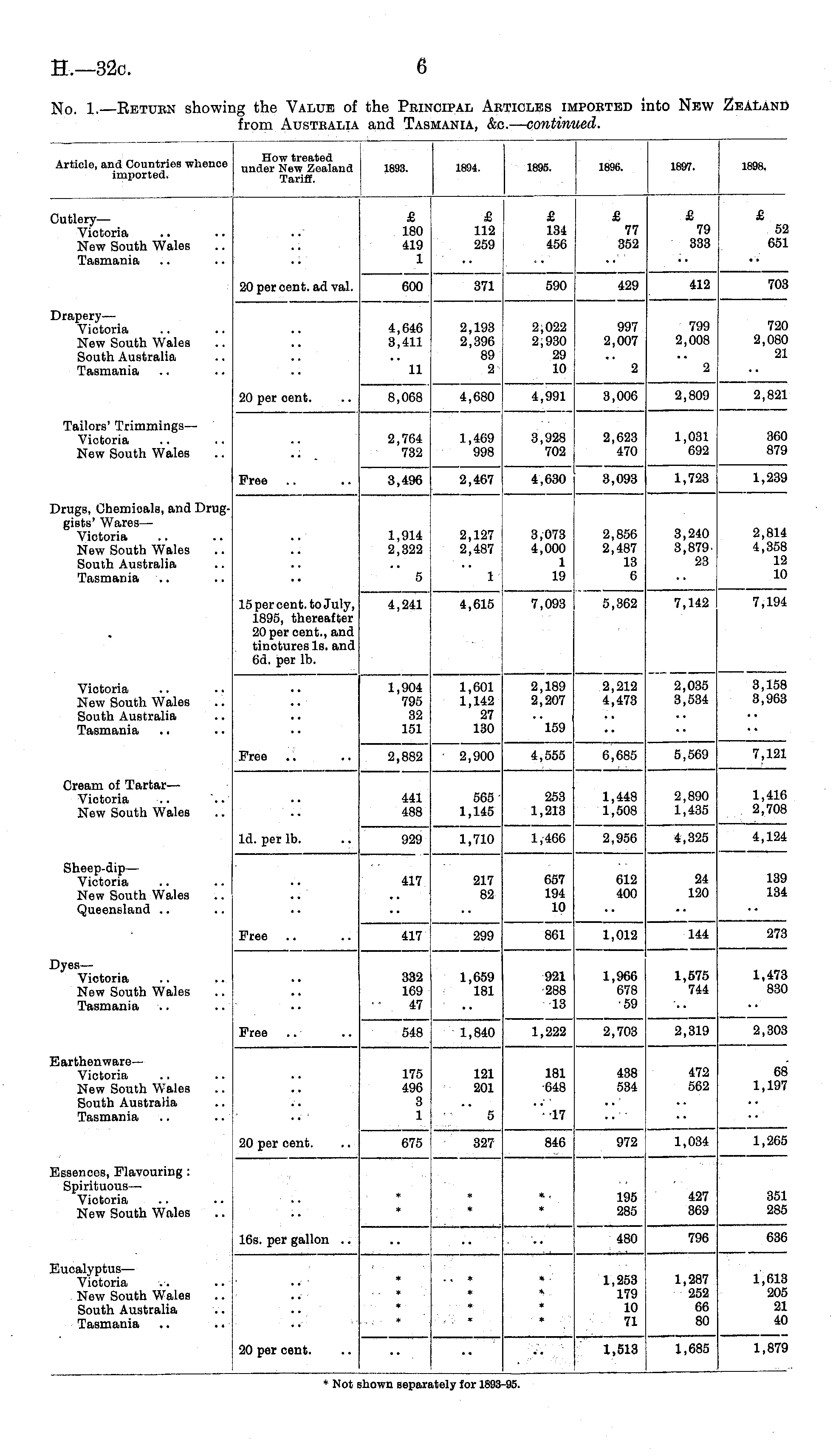 Article, and Countries whence imported. How treated under New Zealand Tariff. 1893. 1894. 1895. 1896. 1897. 1898. 'utlery— Victoria New South Wales Tasmania £ 180 419 1 £ 112 259 £ 134 456 £ 77 352 £ 79 333 £ 52 651 20 per oent. ad val. 600 371 590 429 412 703 )rapery— Victoria New South Wales South Australia Tasmania 4,646 3,411 2,193 2,396 89 2 2,022 2,930 29 10 997 2,007 799 2,008 720 2,080 21 11 2 2 20 per oent. 8,068 4,680 4,991 3,006 2,809 2,821 Tailors' TrimmingsVictoria New South Wales 2,764 732 1,469 998 3,928 702 2,623 470 1,031 692 360 879 Free 3,496 2,467 4,630 3,093 1,723 1,239 )rugs, Chemicals, and Druggiets' Wares — Victoria New South Wales South Australia Tasmania 1,914 2,322 2,127 2,487 3,073 4,000 1 19 2,856 2,487 13 6 3,240 3,879. 23 2,814 4,358 12 10 5 1 15 per cent, to July, 1895, thereafter 20 per cent., and tinctures Iβ. and 6d. per lb. 4,241 4,615 7,093 5,362 7,142 7,194 Victoria New South Wales South Australia Tasmania 1,601 1,142 27 130 2,189 2,207 2,212 4,473 2,035 3,534 3,158 3,963 1,904 795 32 151 159 Cream of Tartar— Viotoria .. '.. New South Wales Free 2,882 2,900 4,555 6,685 5,569 7,121 441 488 565 1,145 253 1,213 1,448 1,508 2,956 2,890 1,435 1,416 2,708 4,124 Id. per lb. 929 4,325 1,710 1,466 Sheep-dip— Victoria New South Wales Queensland .. 417 217 82 657 194 10 612 400 24 120 139 134 Free 144 273 417 299 861 1,012 )yes— Victoria New South Wales Tasmania 332 169 47 1,659 181 921 288 13 1,966 678 ■59 1,575 744 1,473 830 Free 2,319 2,303 548 1,840 1,222 2,703 larthenware— Victoria New South Wales South Australia Tasmania 175 496 3 1 121 201 181 648 438 534 472 562 68 1,197 5 17 20 per cent. 675 327 846 972 1,034 1,265 issences, Flavouring : Spirituous — Victoria New South Wales * # * , 195 285 427 369 351 285 * * * 16s. per gallon .. 480 796 636 lucalyptus— Viotoria New South Wales South Australia Tasmania ♦ ♦ * * * * 1,253 179 10 71 1,287 252 66 80 1,613 205 21 40 ♦ * * . ♦ * 20 per cent. 1,513 1,685 1,879 * Not shown se] laratel; for 1893-95.